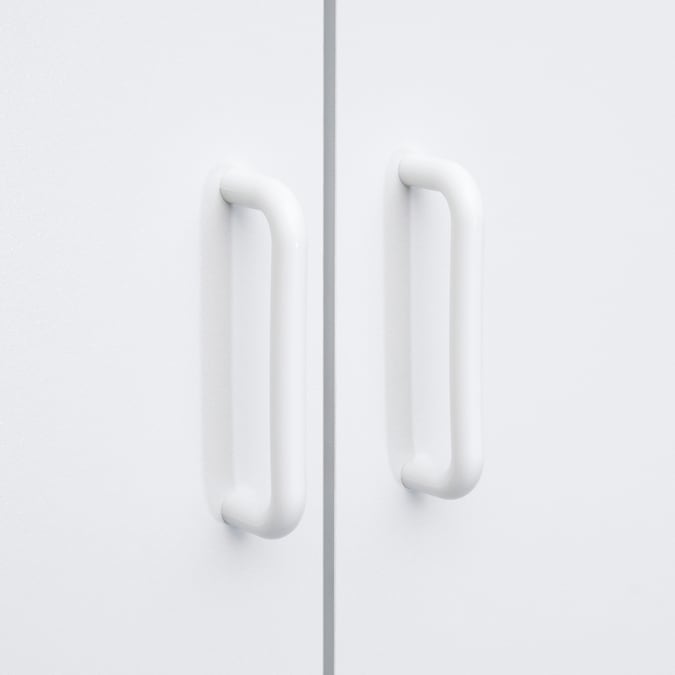 - Stor-It-All collection multi-purpose cabinet in a durable white finish with versatile appeal