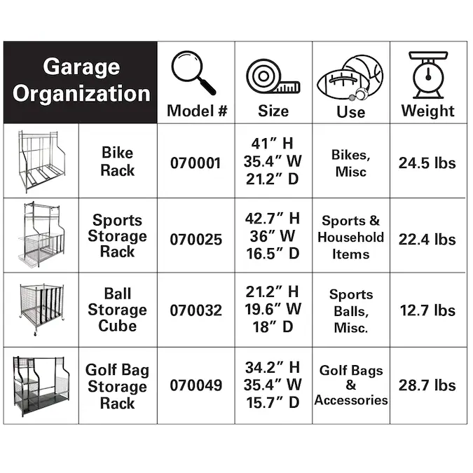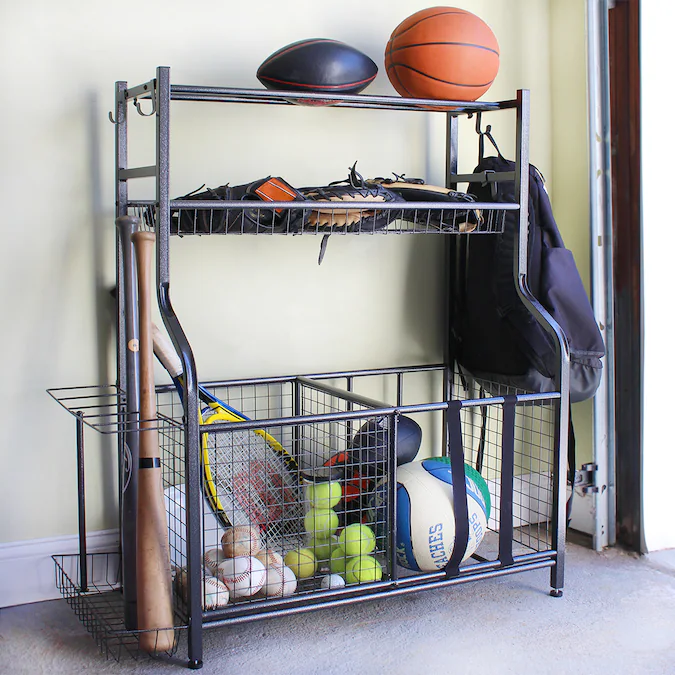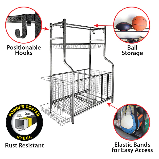 Transform your garage with the garage storage organizer. This powder coated steel rack holds tennis rackets, baseball bats, sports balls, soccer cleats and more! Elastic bands around the ball pit allow for easy access to equipment. The top shelves are great for basketballs, soccer balls and hats. The powder coating helps prevent rust and corrosion over time.