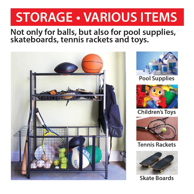 - Ideal for balls, pool equipment and supplies, skateboards, tennis rackets, baseball bats and toys