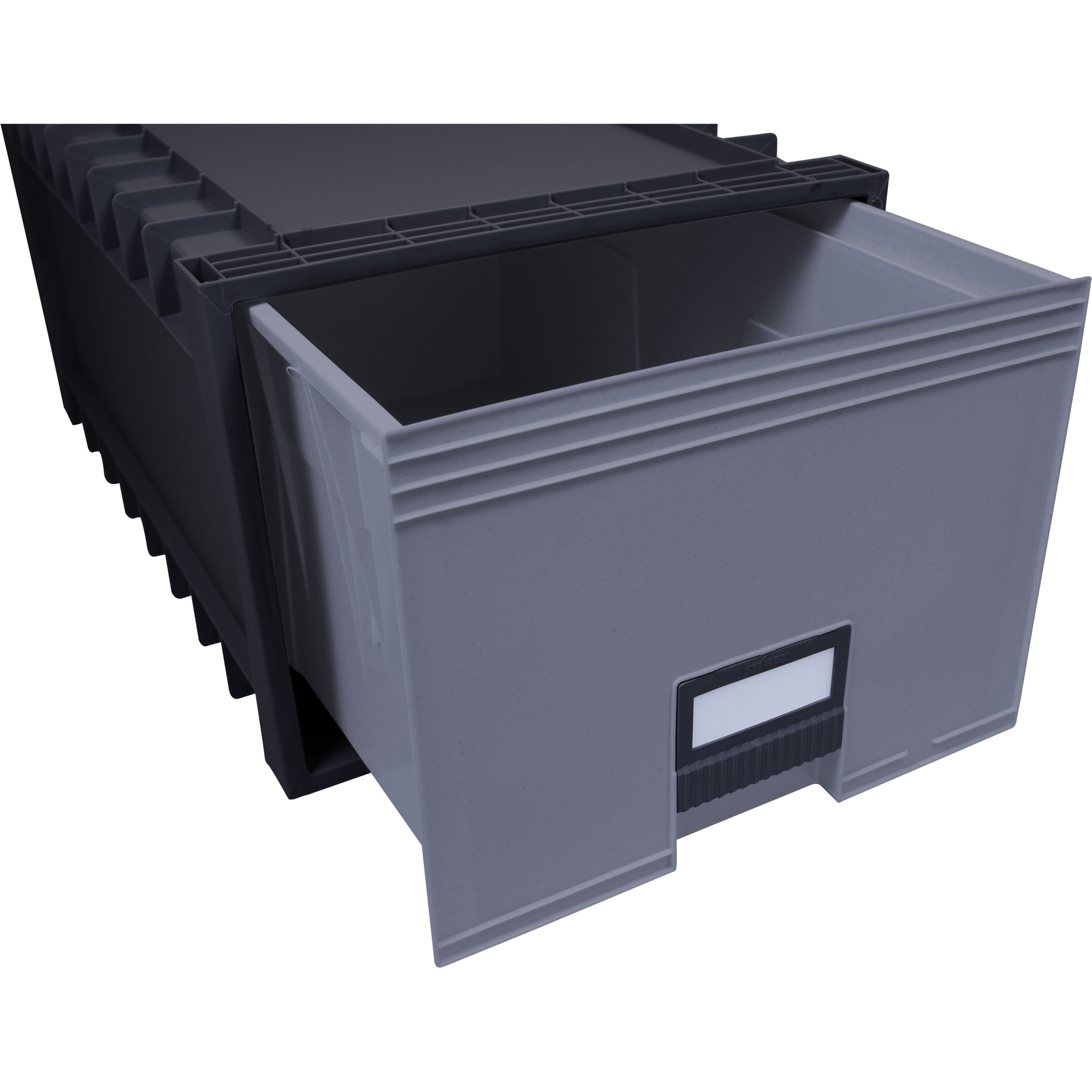 Create a neat and organized space with this Storex File Storage Box. It’s made of sturdy plastic and includes built-in insert tabs that allow you to stack many together, up to 10-units tall. This plastic archive box is lightweight and mobile, letting you move it from one location to another as needed. It features deep drawers and can hold letter-size folders secure. Plus, it has a label holder on the front for easy identifying of the contents. The gray/black color complements most office decors.