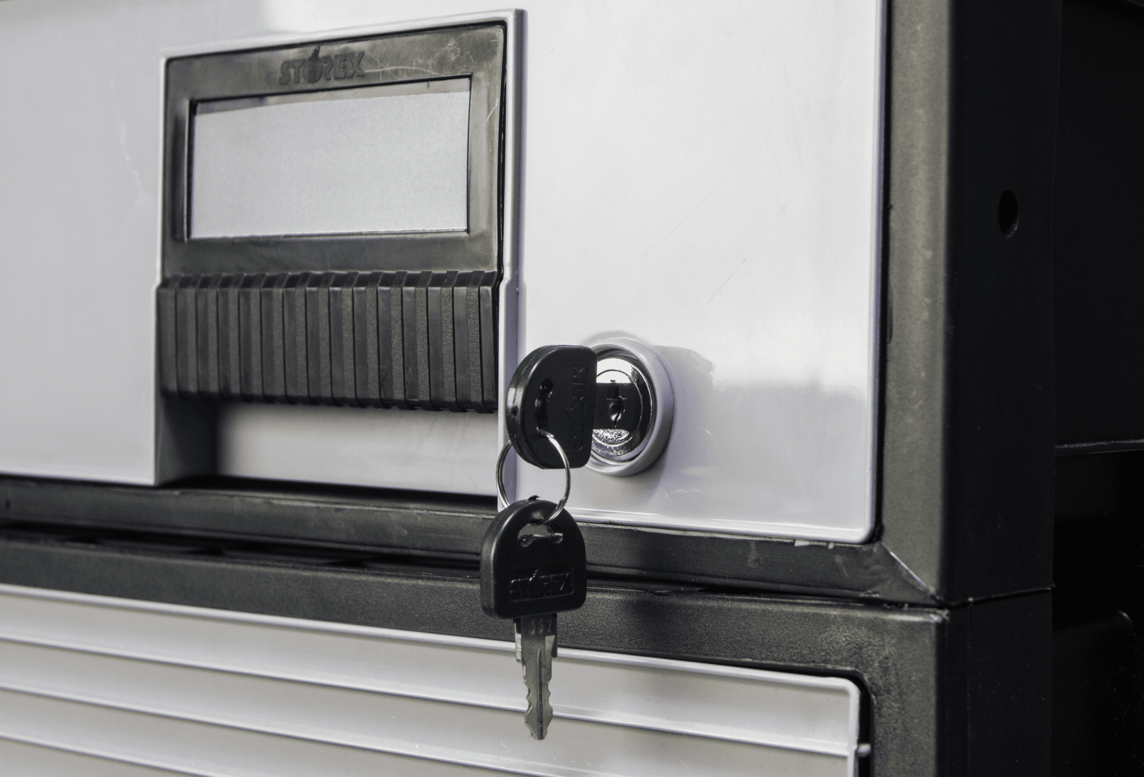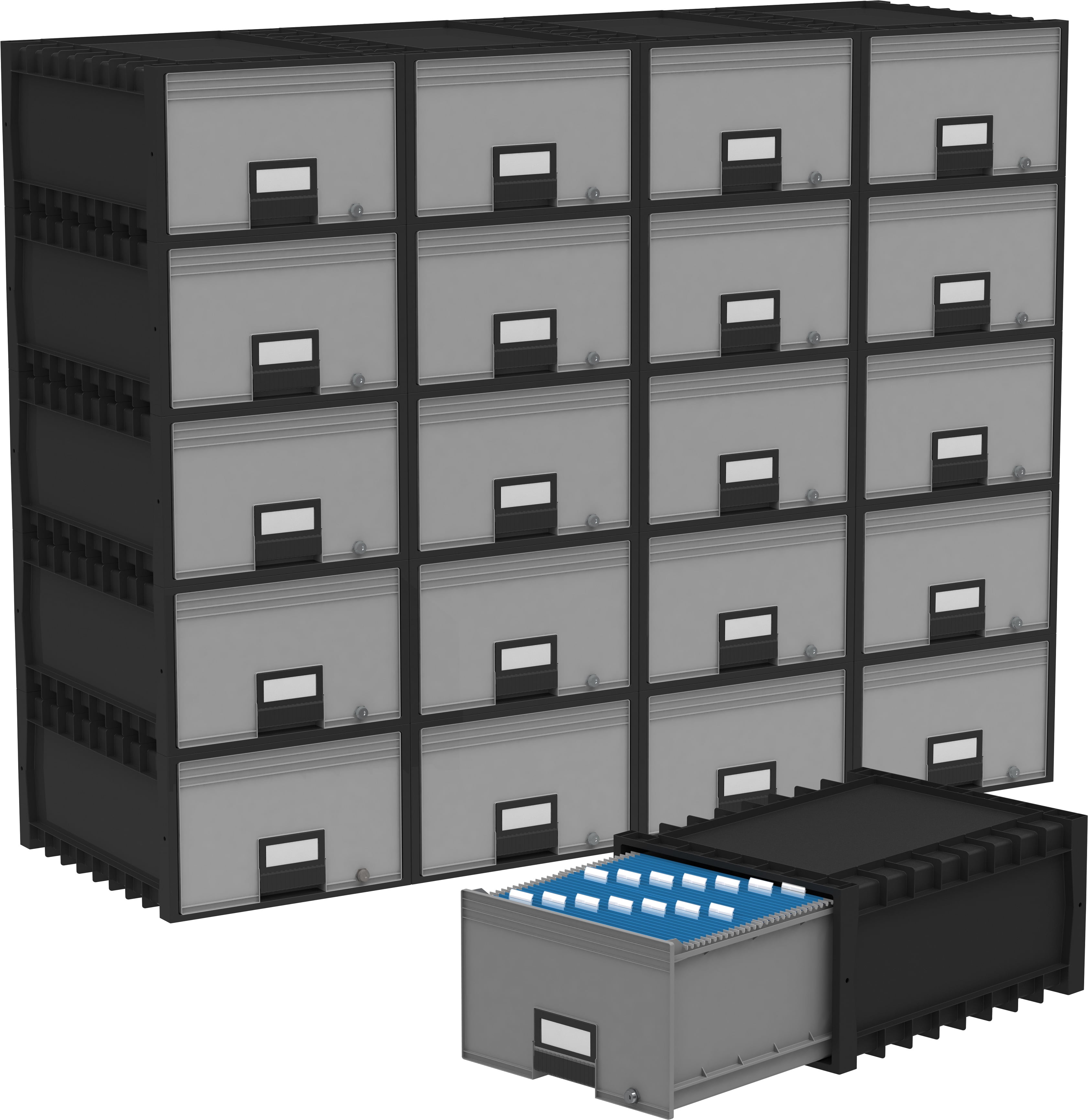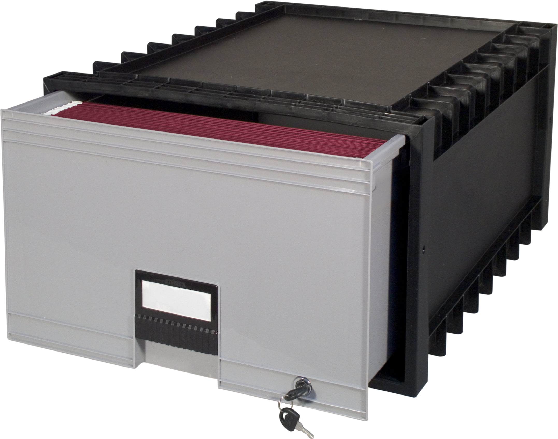 Storex Legal-Size Plastic Archive Drawer with Lock, 24 inch Depth, Black/Gray: Holds legal size hanging files and folders Modular design; stack up 10 drawers high Includes lock and keys for additional privacy Built-in label holder on front of drawer Drawers glide smoothly with integrated wheels