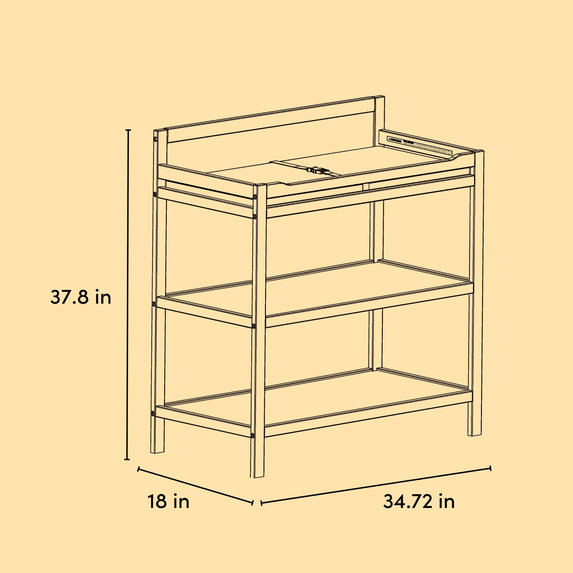 INCLUDES WATER-RESISTANT CHANGING TABLE PAD: Easy-to-match diaper changing table includes water-resistant changing table pad and safety strap; Baby change table includes 2 shelves for easy storage and organizing of nursery and changing essentials GREENGUARD GOLD CERTIFIED: GREENGUARD Gold Certified products are screened for more than 10,000 chemicals and VOCs known to pollute indoor air JPMA CERTIFIED, SAFETY TESTED: Expert tested by third-party, accredited laboratories to meet or exceed all applicable category voluntary and mandatory safety standards; Applied finish tested to meet or exceed applicable ASTM and CPSIA safety standards QUALITY CRAFTSMANSHIP: Crafted with pine wood, engineered wood, and wood composites; Assembly required PACKAGED WITH CARE: Packaging tested to reduce the risk of incidental shipment-related damage BY STORKCRAFT, SINCE 1945: Exclusively from Storkcraft – makers of quality nursery and kids’ bedroom furniture since 1945; Proud recipient of the Parent Tested Parent Approved (PTPA) Seal of Approval; 80 years of craftsmanship and excellence in nursery CHANGING TABLE ASSEMBLED DIMENSIONS: Width (34.72 in) x Depth (17.99 in) x Height (37.8 in) x Weight (24.5 lbs).