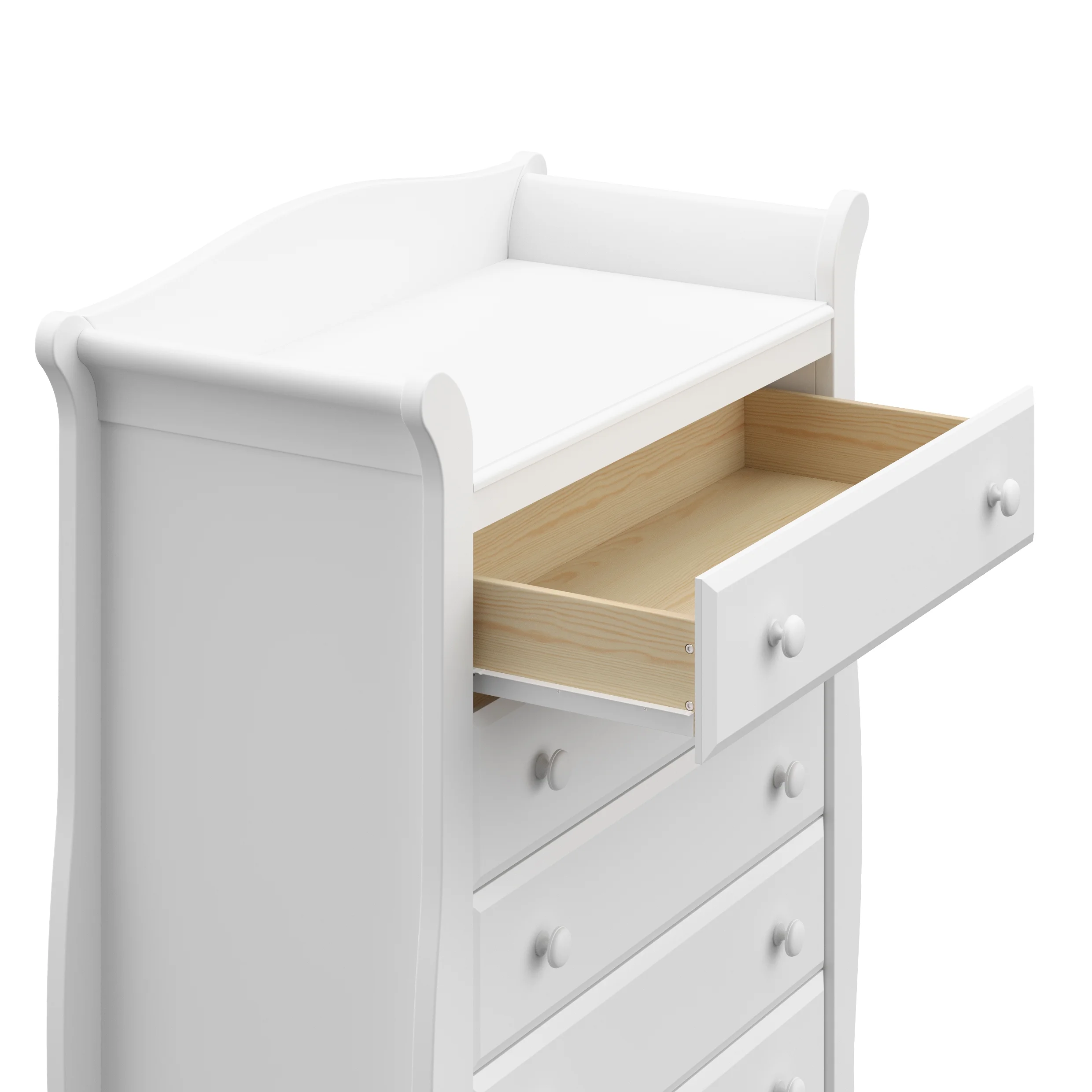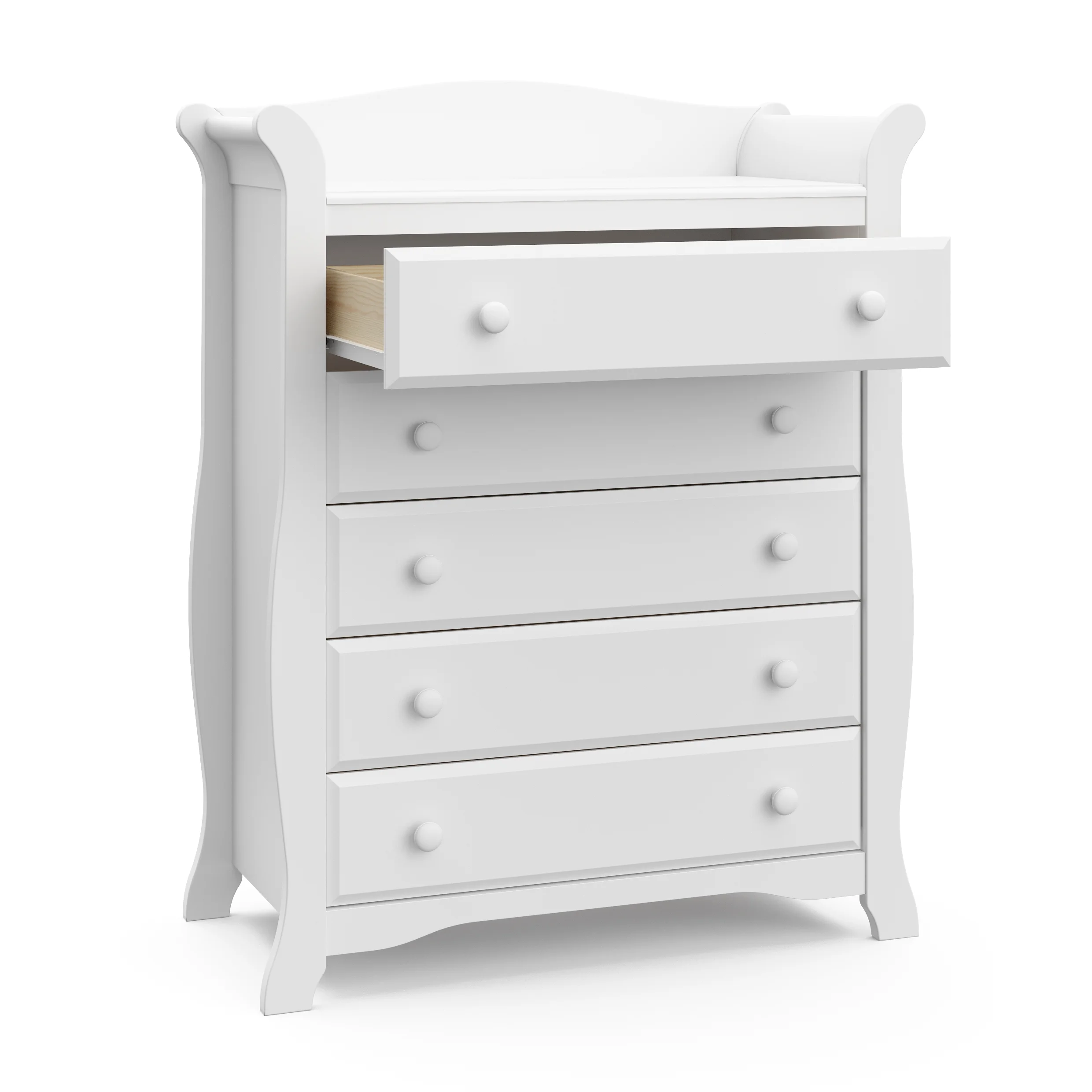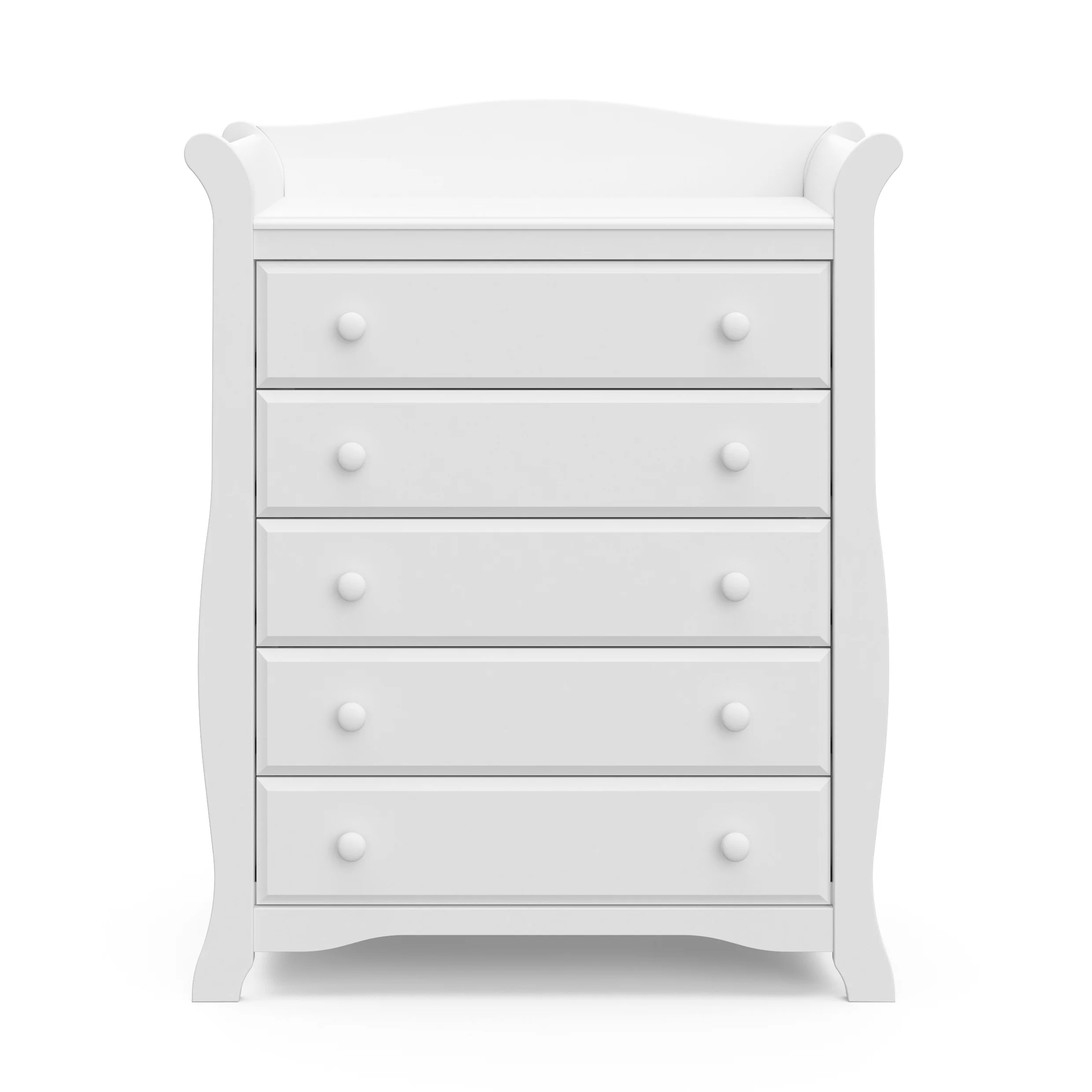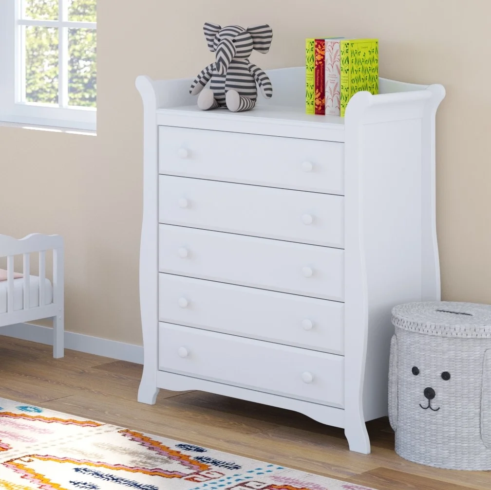 CLASSIC, TRADITIONAL 5-DRAWER DRESSER: This 5-drawer dresser offers families a convenient storage solution in a classic, traditional sleigh design that is easy to match with any nursery or kids bedroom QUALITY WOOD CRAFTMANSHIP: Crafted of wood framing and wood composites, and includes Euro drawer glides (assembly required) SAFETY TESTED: Tested to meet or exceed all applicable CPSIA & ASTM International category safety standards, including the ASTM F2057 safety specification for clothing storage units EXPERT TESTED: Storkcraft dressers are tested at third-party, accredited laboratories to meet or exceed all applicable category voluntary and mandatory safety standards PACKAGED WITH CARE: Packaging tested to reduce the risk of incidental shipment-related damage; Backed by a 1-year limited manufacturer’s warranty AWARD-WINNING BRAND: Storkcraft is the proud recipient of the 2022 Women’s Choice Award for 9 out of 10 Customer Recommended Baby & Kids Furniture PTPA SEAL OF APPROVAL: Storkcraft is the proud recipient of the Parent Tested Parent Approved (PTPA) Seal of Approval, the leader in consumer product awards for families DRESSER DIMENSIONS: Width (50.89 in) x Depth (17.52 in) x Height (40.12 in) x Weight (114.62 lbs) | Drawer Dimensions: Depth (12.99 in) x Width (19.94 in) x Height (5.1 in)