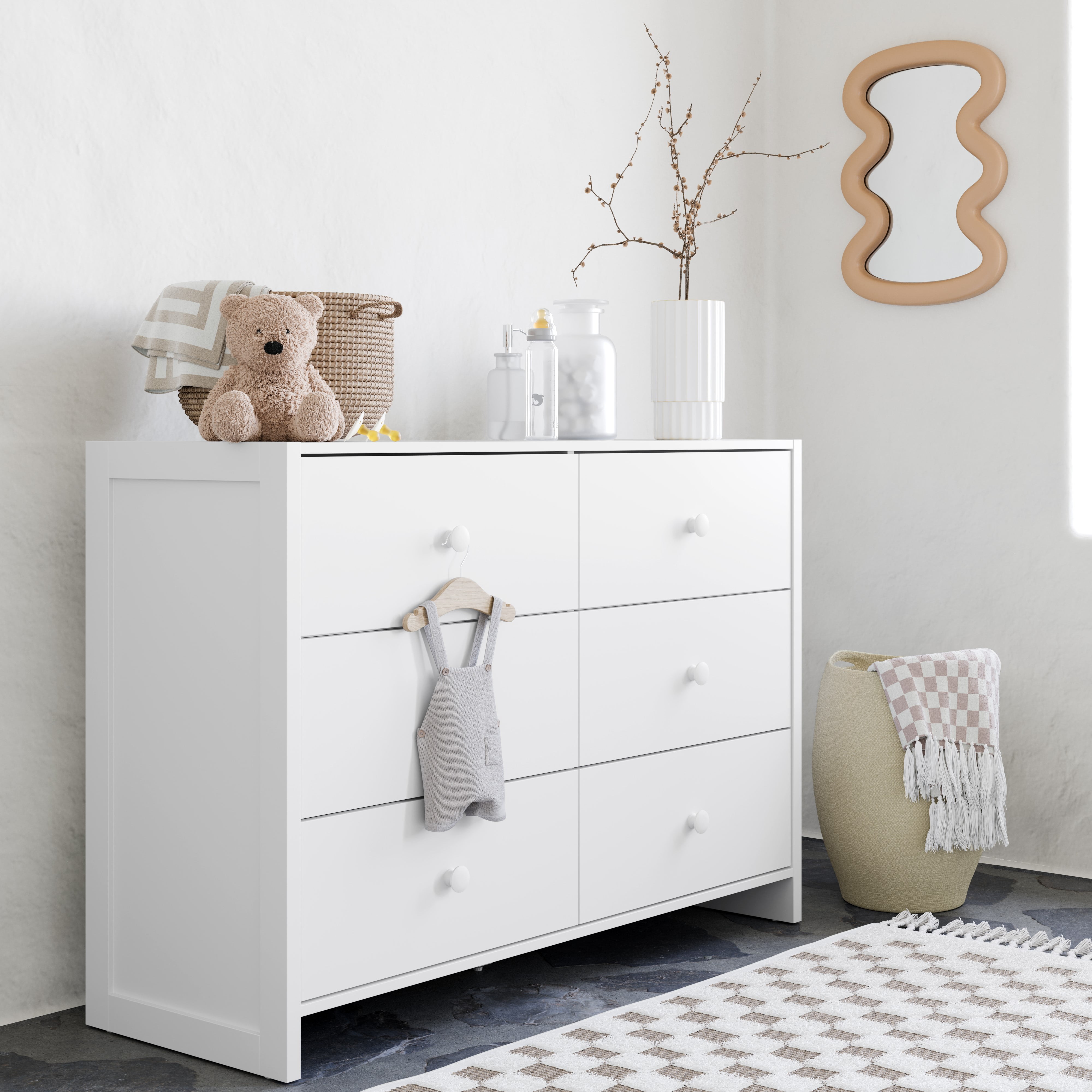 Introducing the Calabasas 6 Drawer Dresser, where versatile design meets California style, all at an unbeatable value. This dresser embodies the perfect blend of chic aesthetics and abundant storage, boasting solid side panels and a modern-minimalist allure that effortlessly complements any nursery or kids’ room. Featuring six spacious drawers, the Calabasas Dresser offers ample storage space to keep your child’s essentials neatly organized while maintaining a sleek and uncluttered look. Whether it’s a cozy nursery, a vibrant children’s bedroom, a welcoming guest room, or even a lively playroom, the Storkcraft Calabasas Dresser is a versatile must-have that promises to elevate any home setting with its understated elegance. Engineered with utmost attention to safety, the Calabasas 6 Drawer Dresser surpasses stringent standards set by the Consumer Products Safety Commission (CPSC) and the American Society for Testing and Materials (ASTM). Our top priority is your child’s safety, reflected in our advanced interlocking drawer system and reliable tip-over restraint kit, designed to significantly reduce the risk of furniture tip-over incidents. Featuring pre-installed Euro drawer glides, assembly is a breeze, ensuring that organizing your little one’s clothes and essentials becomes a hassle-free experience. With its timeless design and practical functionality, the Calabasas Dresser becomes a cherished addition to any family’s home, seamlessly adapting to the evolving storage needs of your growing child. Complete your Storkcraft Calabasas collection with the Storkcraft Calabasas 3-in-1 Convertible Criband Storkcraft Calabasas Swivel Glider for a cohesive and stylish nursery or kids’ room ensemble.