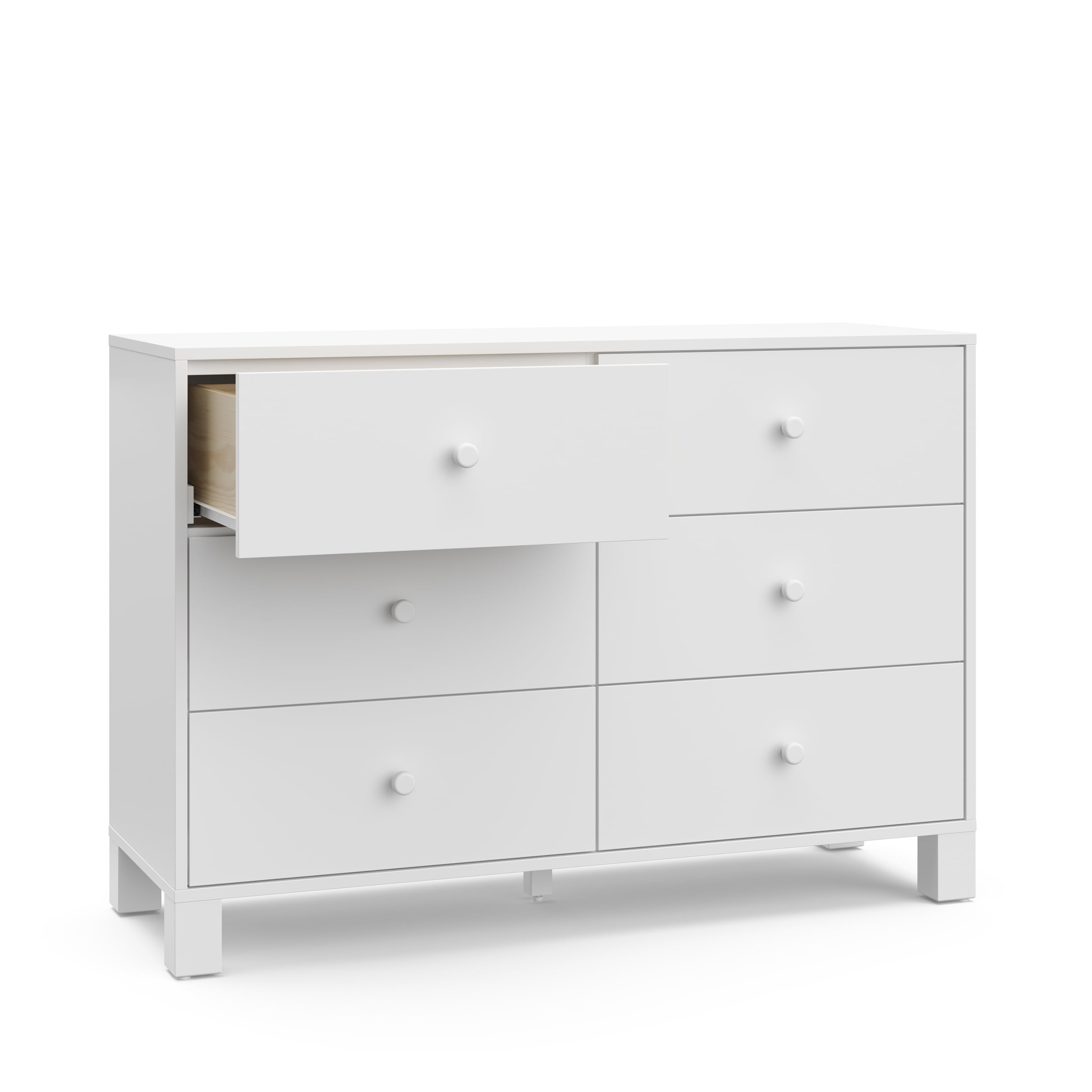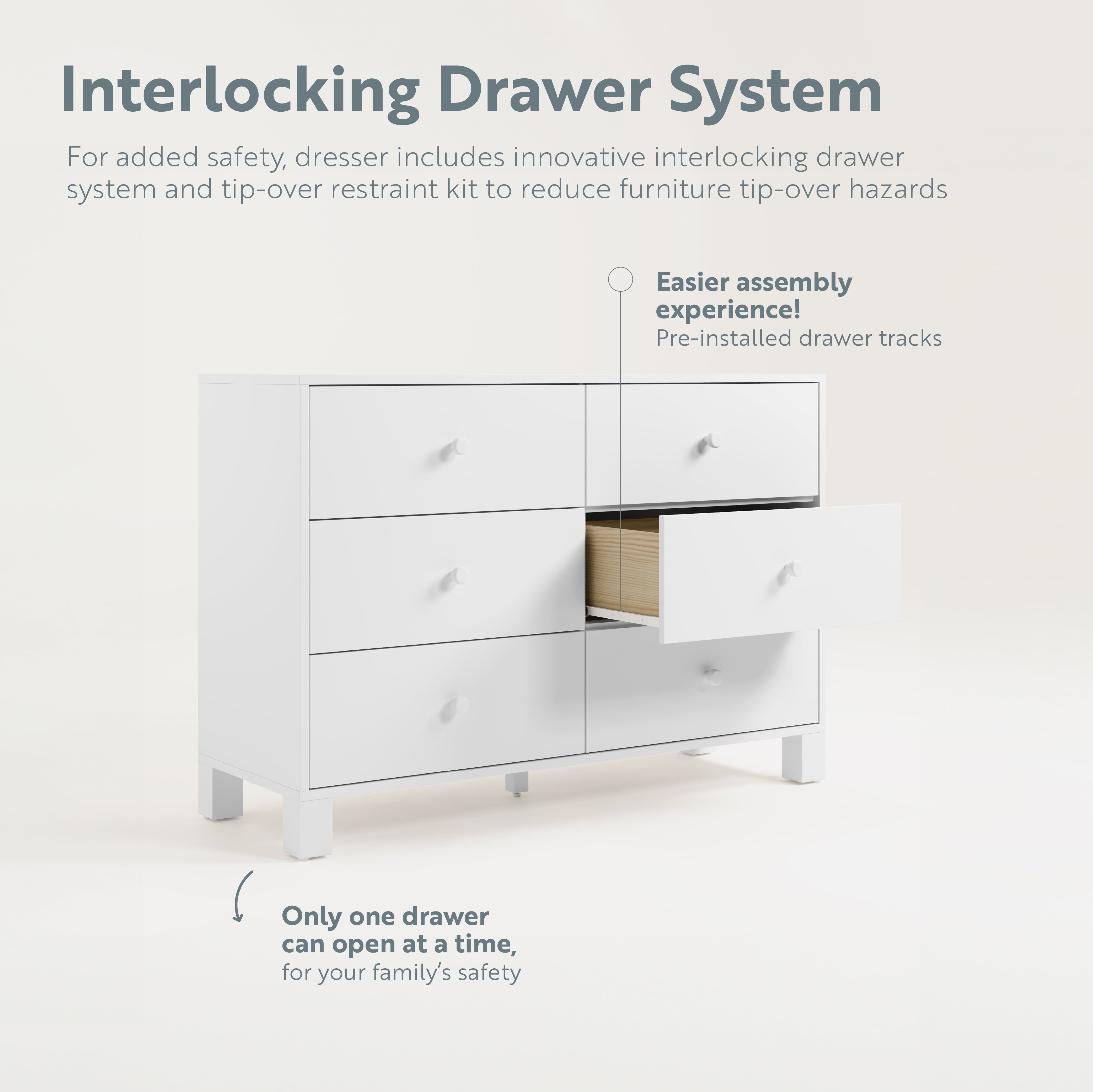 GREENGUARD GOLD CERTIFIED: GREENGUARD Gold certified products are screened for more than 10,000 chemicals and VOCs known to pollute indoor air PRE-INSTALLED DRAWER TRACKS FOR EASIER ASSEMBLY: Equipped with pre-installed drawer tracks (we did the work for you!) for an easier assembly experience; Crafted of wood framing and wood composites, and includes Euro drawer glides; Assembly required (2 people recommended) INTERLOCKING DRAWER SYSTEM & FURNITURE TIP-OVER RESTRAINT KIT: For added safety for your child, the California 6 Drawer Double Dresser includes our innovative, safety-focused interlocking drawer system and furniture tip-over restraint kit, intended to mitigate the risk of furniture tip-over when used in tandem STURDY WOOD CONSTRUCTION, TIMELESS DESIGN: With its clean lines, stylish “block” feet, and sturdy wood construction, the California is sure to add a pop of style (and storage convenience) to your nursery or kids bedroom EXPERT TESTED: Tested to meet or exceed all applicable CPSIA & ASTM International category safety standards, including the ASTM F2057 safety specification for clothing storage units PACKAGED WITH CARE: Packaging tested to reduce the risk of incidental shipment-related damage BY STORKCRAFT, SINCE 1945: Exclusively from Storkcraft Next, by Storkcraft – makers of quality nursery and kids’ bedroom furniture since 1945; Proud recipient of the Parent Tested Parent Approved (PTPA) Seal of Approval; 80 years of craftsmanship