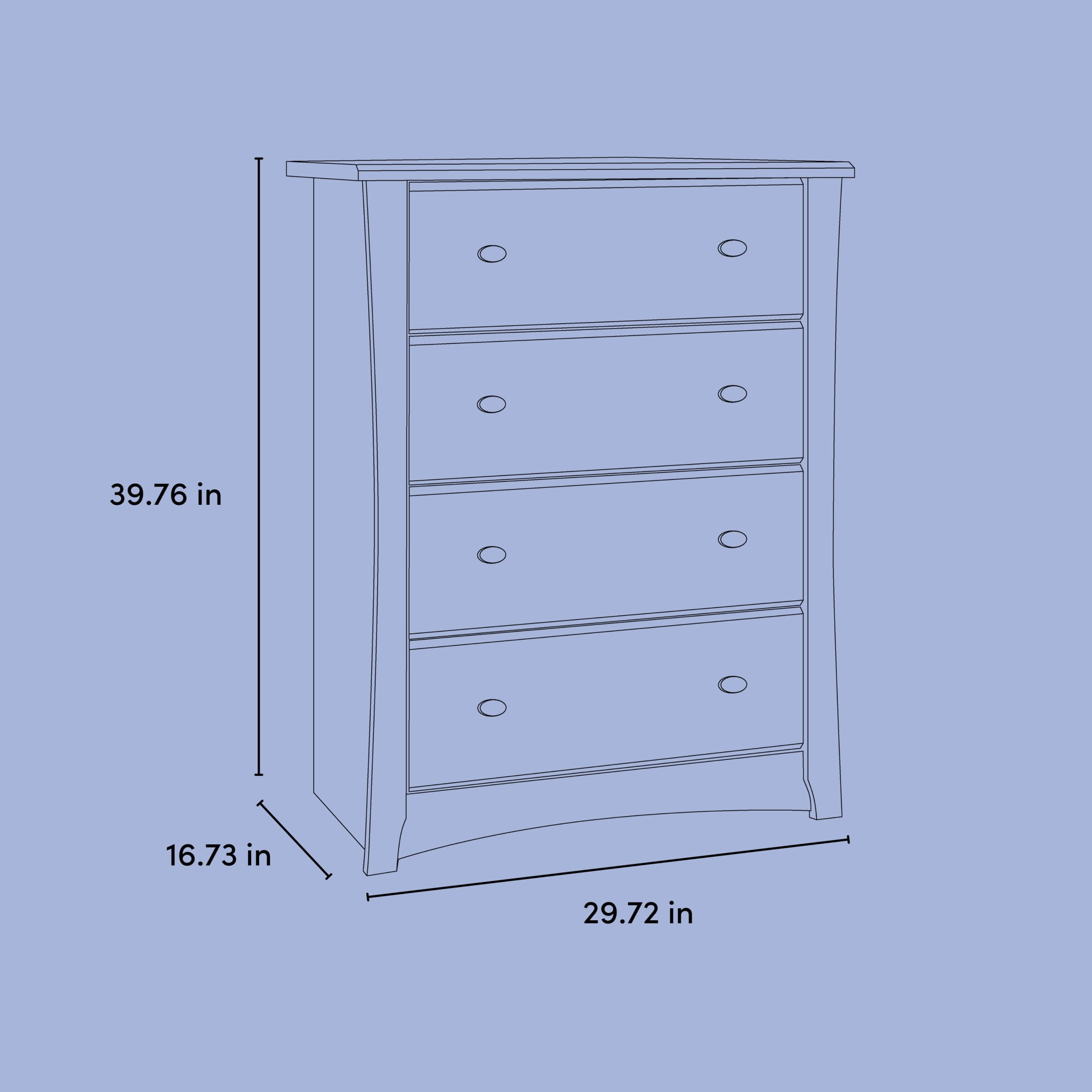 The Storkcraft Crescent 4-Drawer Chest is a universal nursery and bedroom storage solution. Crafted from engineered wood, the Crescent features stylish metal knobs for modern flare. This vertical dresser is equipped with durable steel hardware, Euro-glide drawers with safety stops, and is fastened with German cam locks. The Crescent is expert tested by independent laboratories to meet the highest standards for your child’s safety. In addition, it complies with all applicable federal anti-tipping standards. Complete the collection with the matching 6-Drawer Dresser. Exclusively from Storkcraft, proud recipient of the 2023 Women’s Choice Award for 9 out of 10 Customer Recommended Baby & kids furniture. Available in White, Espresso, Black, and Pebble Gray.