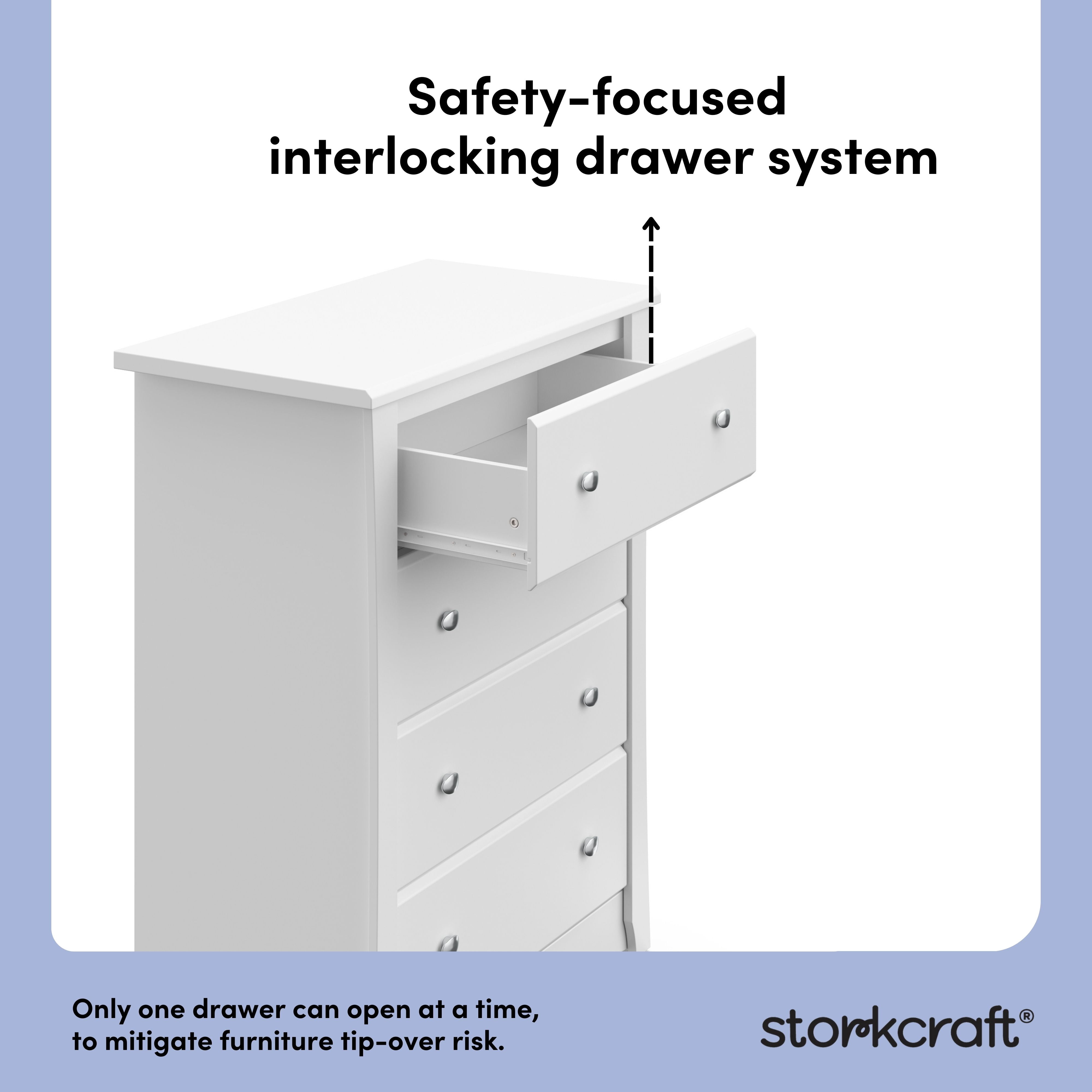 MODERN, STYLISH 4-DRAWER DRESSER: This 4-drawer dresser offers families a modern storage solution that is easy to match with any style of nursery or kids bedroom KIDS DRESSER FOR BEDROOM AND NURSERY: Crafted of wood composites, laminated with a durable, easy-to-clean PU coated surface, and includes Euro drawer glides (assembly required) GREENGUARD GOLD CERTIFIED, SAFETY TESTED: GREENGUARD Gold Certified products are screened for more than 10,000 chemicals and VOCs known to pollute indoor air; Tested to meet or exceed applicable CPSIA & ASTM International category safety standards EXPERT TESTED: Storkcraft dressers are tested at third-party, accredited laboratories to meet or exceed all applicable category voluntary and mandatory safety standards INTERLOCKING DRAWER SYSTEM, TIP-OVER RESTRAINT KIT: For added safety for your child, dresser includes innovative interlocking drawer system and tip-over restraint kit to reduce furniture tip-over hazards; Tested to meet or exceed all applicable category safety standards PACKAGED WITH CARE: Packaging tested to reduce the risk of incidental shipment-related damage BY STORKCRAFT, SINCE 1945: Exclusively from Storkcraft – makers of quality nursery and kids’ bedroom furniture since 1945; Proud recipient of the Parent Tested Parent Approved (PTPA) Seal of Approval; 80 years of craftsmanship and excellence in nursery