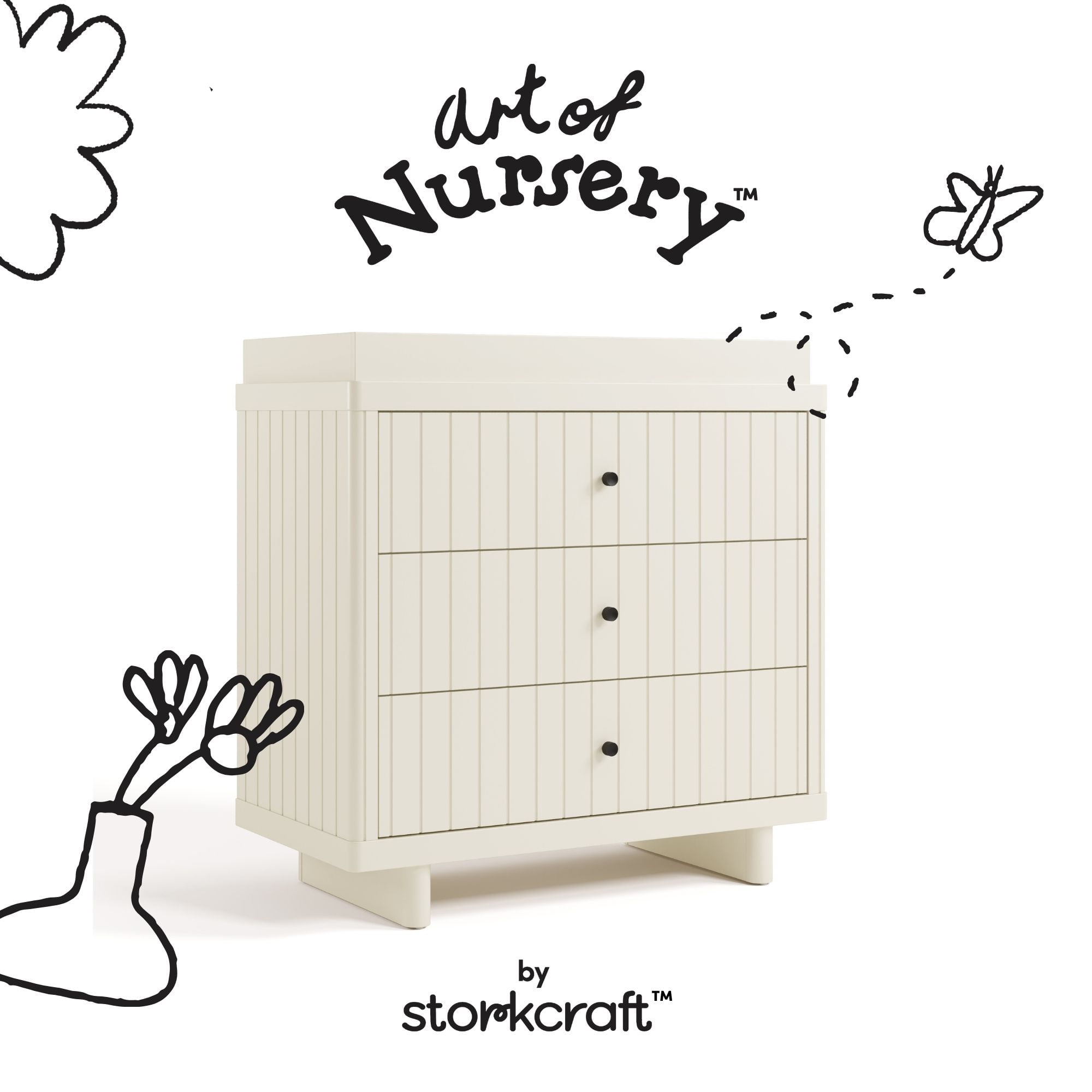 Introducing the iconic Storkcraft Kyoto 3 Drawer Chest with Removable Changing Topper — part of Storkcraft’s exclusive, ultra-premium “Art of Nursery” Collection. As part of Storkcraft’s “Art of Nursery” Collection, the Kyoto utilizes premium materials, designer details, and elegant metal hardware. The Kyoto embodies the ethos of “Japandi” (Japanese-Scandinavian) design, and features linear routed details and thick, chunky, wooden plank feet. As an ode to the Kyoto’s linear details, the Kyoto features ultra-premium, black metal knobs with linear bezels. To make the Kyoto even better, its changing table topper is removable — meaning, when your child has outgrown the changing table, the Kyoto’s integrated changing table topper can be removed, making it a beautiful kids bedroom chest of drawers. The Kyoto is GREENGUARD Gold Certified: furniture with GREENGUARD Gold certification has been screened for over 10,000 chemicals and volatile organic compounds (VOCs) and meets or exceeds strict chemical safety standards. In line with Storkcraft’s dedication to nursery and kids bedroom safety since 1945, the Kyoto features Storkcraft’s innovative, safety-focused interlocking drawer system — so only one drawer can open at a time. Storkcraft’s interlocking drawer system is designed to mitigate furniture tip-over risk when used in tandem with the furniture anti-tip kit (also included in the box). The Kyoto is GREENGUARD Gold Certified, is crafted from wood and wood composites, and its applied finish has been tested to meet or exceed the applicable ASTM and CPSIA safety standards. The Kyoto is expert tested by third-party, accredited laboratories to meet or exceed all applicable category voluntary and mandatory safety standards. Designed to adapt to your growing baby, the Kyoto offers three spacious drawers and is useful from the nursery to kids room stage. The Kyoto is part of the Art of Nursery line of products — hand-sketched, elevated nursery and kids’ bedroom pieces designed with love and inspired by the beauty and landscapes around us. Quality-crafted with premium materials and appointed with luxurious details, Art of Nursery is an exclusive Storkcraft collection, designed in-house, that personifies elegance, imagination, and craftsmanship. These grow-with-me pieces are brought to life — with love — by real parents for real families, and are smartly engineered to adapt to your growing baby throughout childhood’s ever-changing stages. Storkcraft has been recognized with industry awards from the likes of Fast Company, Parents, Baby Innovation Awards, and more, and is the proud recipient of the Parent Tested Parent Approved (PTPA) Seal of Approval for nursery and children’s bedroom furniture. The Kyoto is backed by Storkcraft’s supportive, real-life Customer Care team and 1-year limited manufacturer’s warranty. Assembly required (two people recommended for assembly). Furniture anti-tip kit included. An exclusive, in-house, Storkcraft original design — and part of Storkcraft’s flagship Art of Nursery Collection. Complete the Storkcraft Kyoto collection with the matching Storkcraft Kyoto 6 Drawer Dresser and Storkcraft Convertible Crib