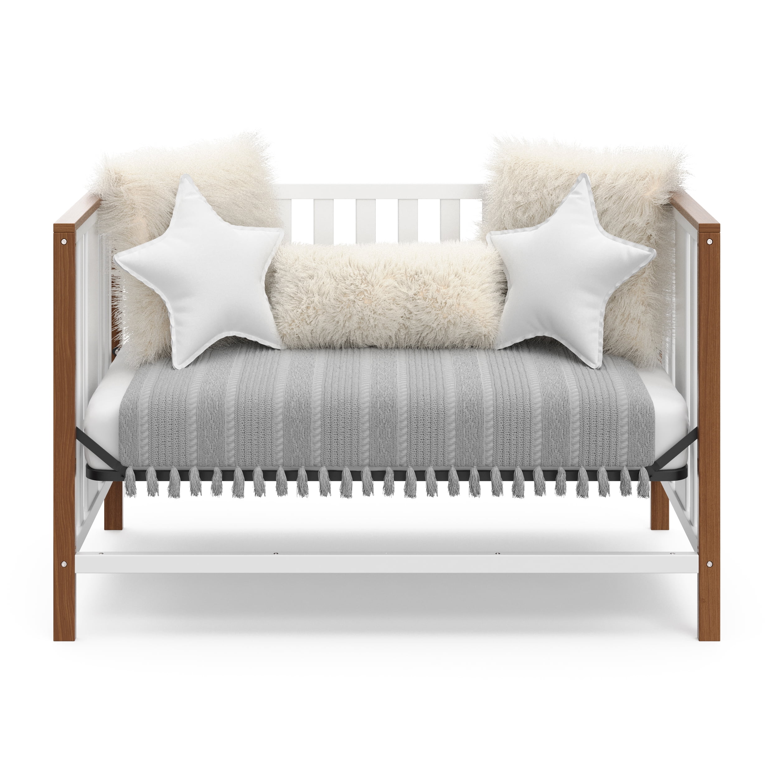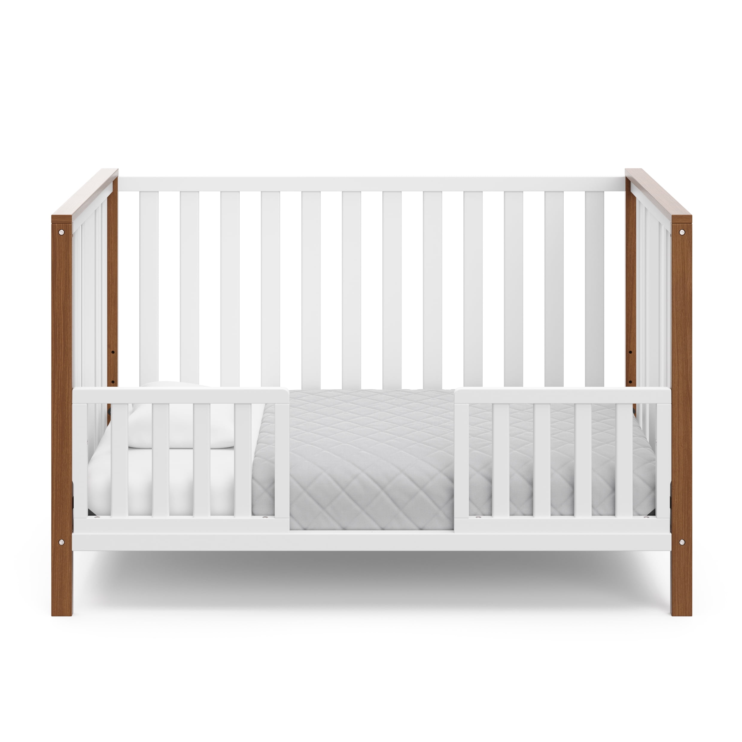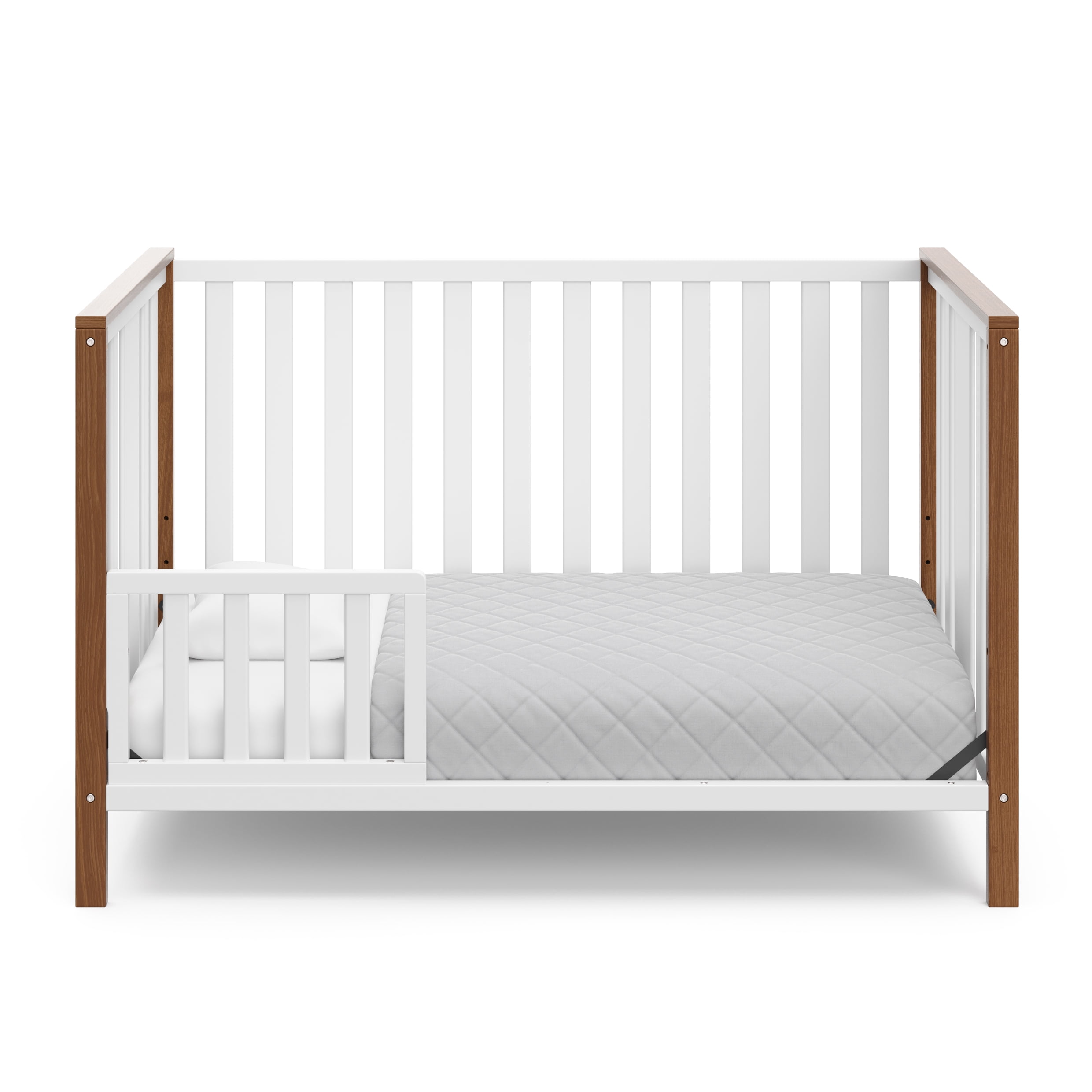 4-IN-1 CONVERTIBLE CRIB: Converts from baby crib (mattress sold separately) to toddler bed (compatible with 1 or 2 toddler guardrails, each sold separately), daybed, and full-size bed with headboard & optional footboard (compatible full-size conversion kit sold separately) MODERN 2-TONE DESIGN: Minimalist 2-tone design makes this crib easy to match with any modern, contemporary, gender-neutral, or Scandinavian style nursery; Crafted with pine wood, engineered wood slats, and wood composites GREENGUARD GOLD CERTIFIED: Certified products are screened for more than 10,000 chemicals and VOCs known to pollute indoor air JPMA CERTIFIED, SAFETY TESTED: Expert tested by third-party, accredited laboratories to meet or exceed all of the applicable category voluntary and mandatory safety standards; Applied finish tested to meet or exceed the applicable ASTM and CPSIA safety standards ADAPTS TO YOUR GROWING BABY: Equipped with an adjustable mattress support base with 3 different height options; Designed to fit any standard full-size crib & toddler mattress (mattress sold separately); Assembly required AWARD-WINNING BRAND: Storkcraft is the proud recipient of the Parent Tested Parent Approved (PTPA) Seal of Approval and 2023 Women’s Choice Award for 9 out of 10 Customer Recommended Baby & Kids Furniture PACKAGED WITH CARE: Packaging tested to reduce the risk of incidental shipment-related damage; Backed by a 1-year limited manufacturer’s warranty CRIB DIMENSIONS: Width (54.57 inches) x Depth (29.33 inches) x Height (33.43 inches) x Weight 35.71 lbs)