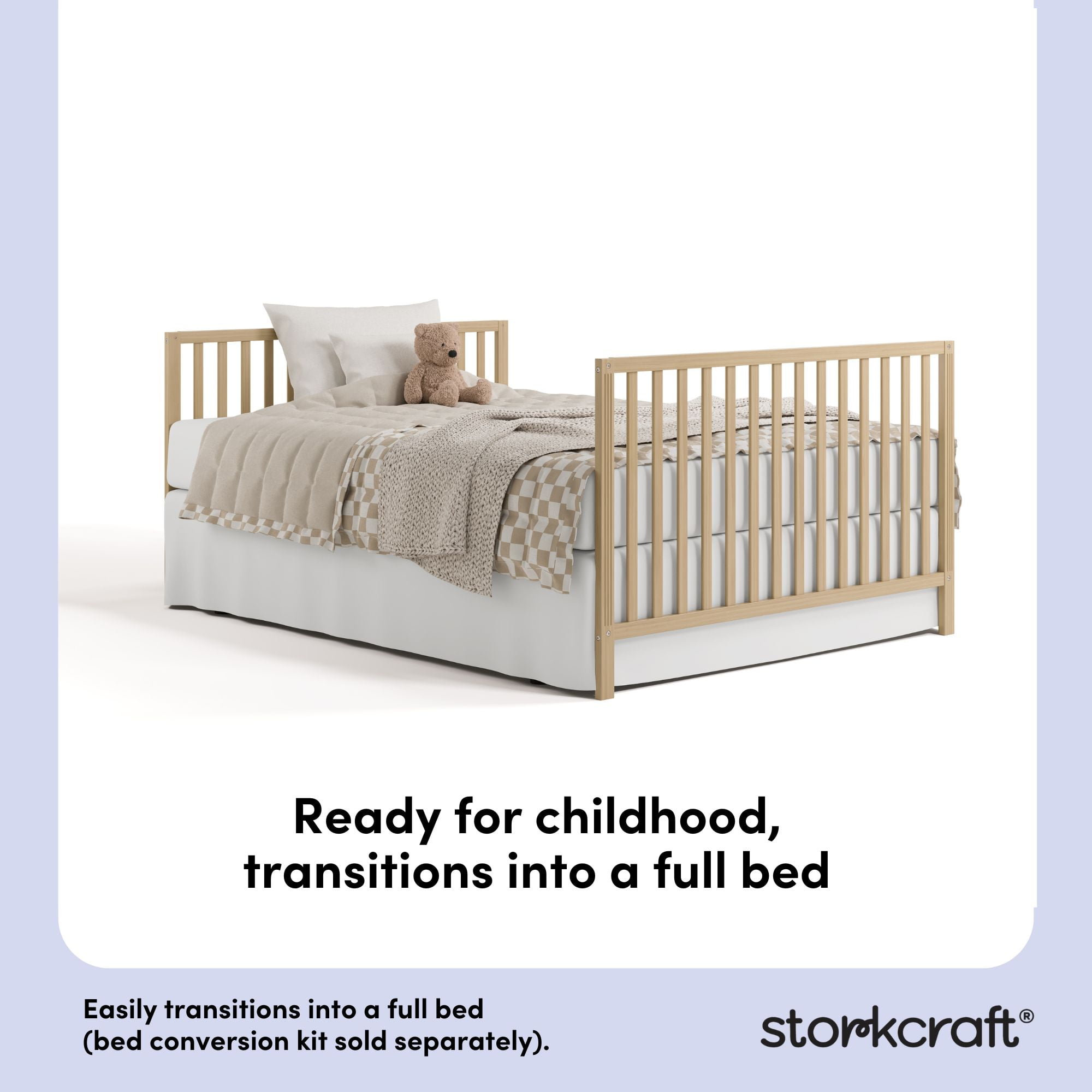 SIMPLE, STYLISH 5-IN-1 CONVERTIBLE CRIB: Designed to adapt to your growing child, the Morningside converts into a toddler bed (compatible Toddler Safety Guardrail Kit sold separately), daybed, and full-size bed (Crib-to-Bed Conversion Kit sold separately) GREENGUARD GOLD CERTIFIED — FOR CLEANER INDOOR AIR: Furniture with GREENGUARD Gold certification has been screened for over 10,000 chemicals and volatile organic compounds (VOCs) and meets or exceeds strict chemical safety standards JPMA CERTIFIED, SAFETY TESTED: Expert tested by third-party, accredited laboratories to meet or exceed all applicable category voluntary and mandatory safety standards; Applied finish tested to meet or exceed applicable ASTM and CPSIA safety standards SOLID WOOD, QUALITY CRAFTMANSHIP — BY STORKCRAFT, SINCE 1945: Crafted of solid pine wood; Easy, stress-free, 30-minute (or less) assembly (2 people recommended); Fits any standard full-size baby crib mattress (mattress not included) PACKAGED WITH CARE: Packaging tested to reduce the risk of incidental shipment-related damage; Arrives in 1 box; Easy assembly required (2 people recommended)