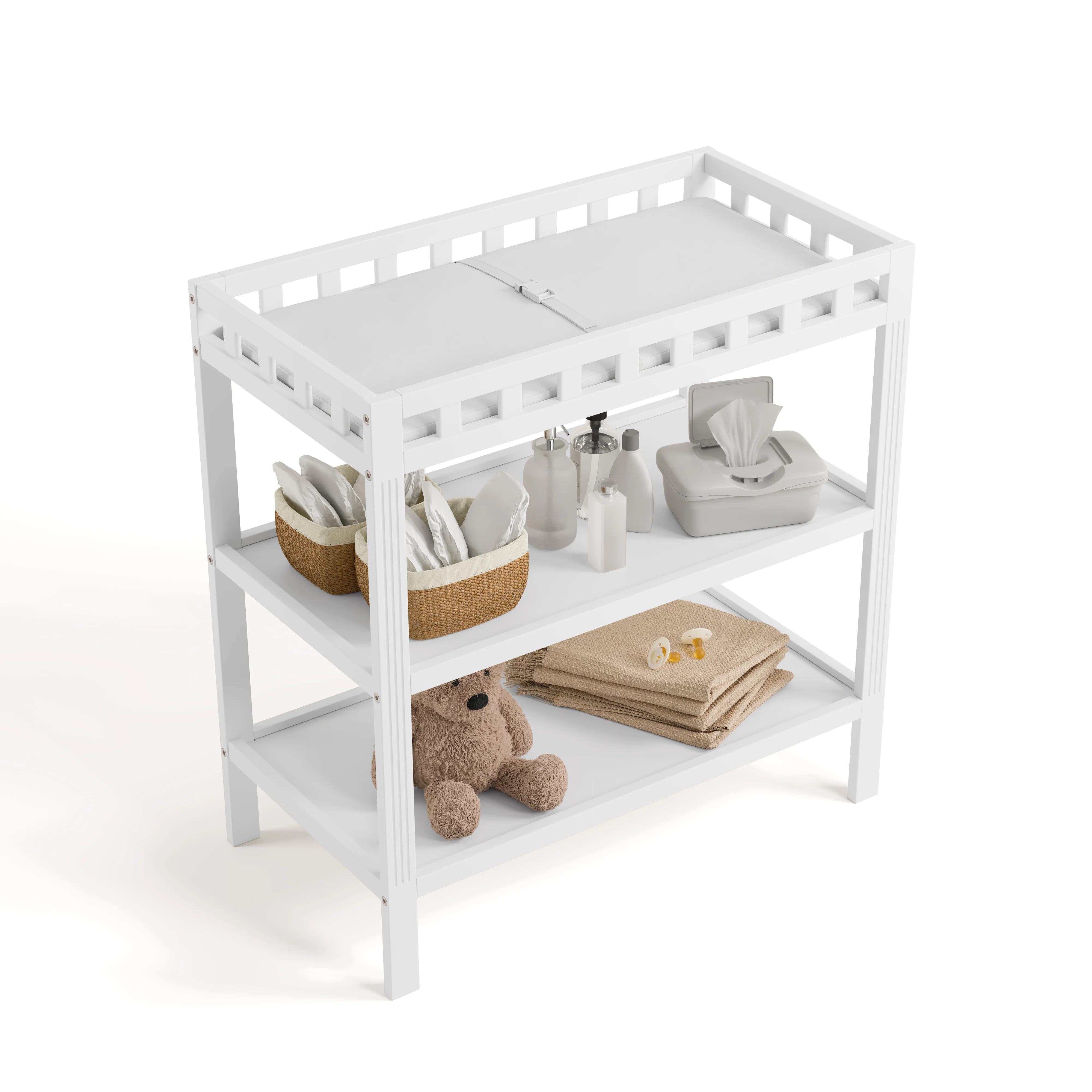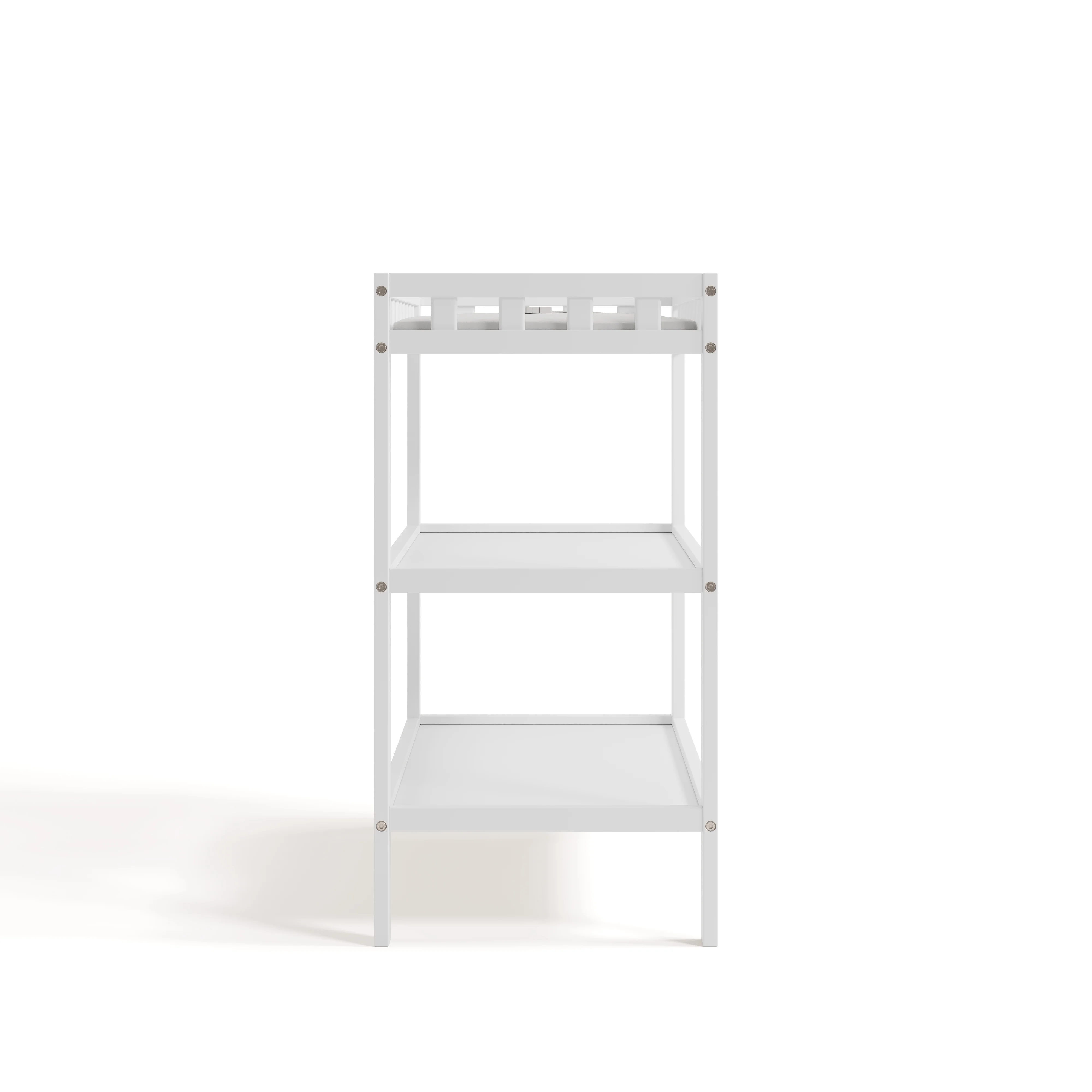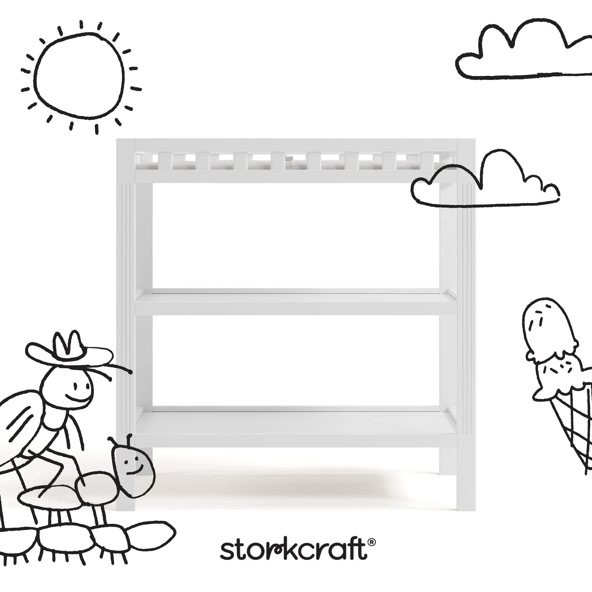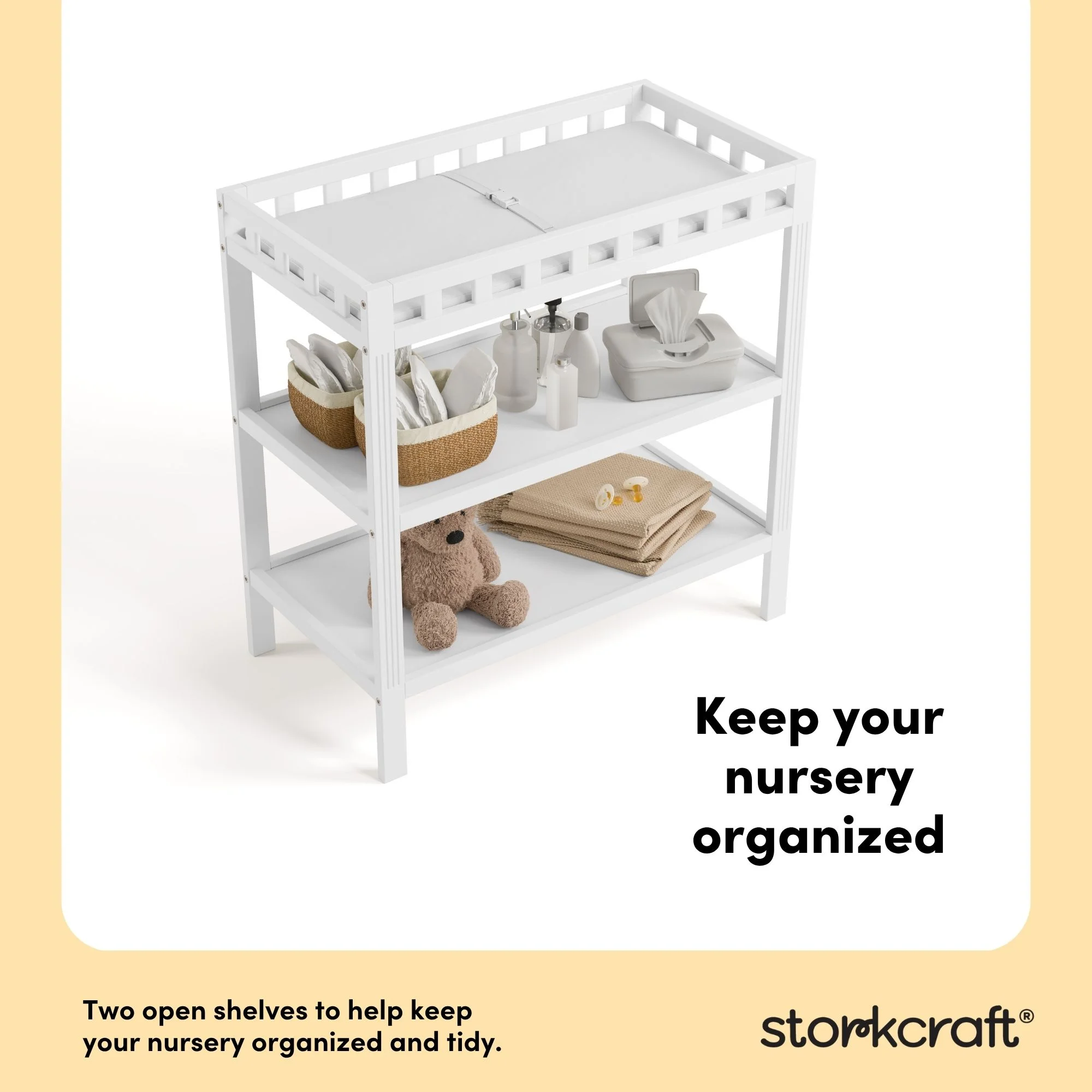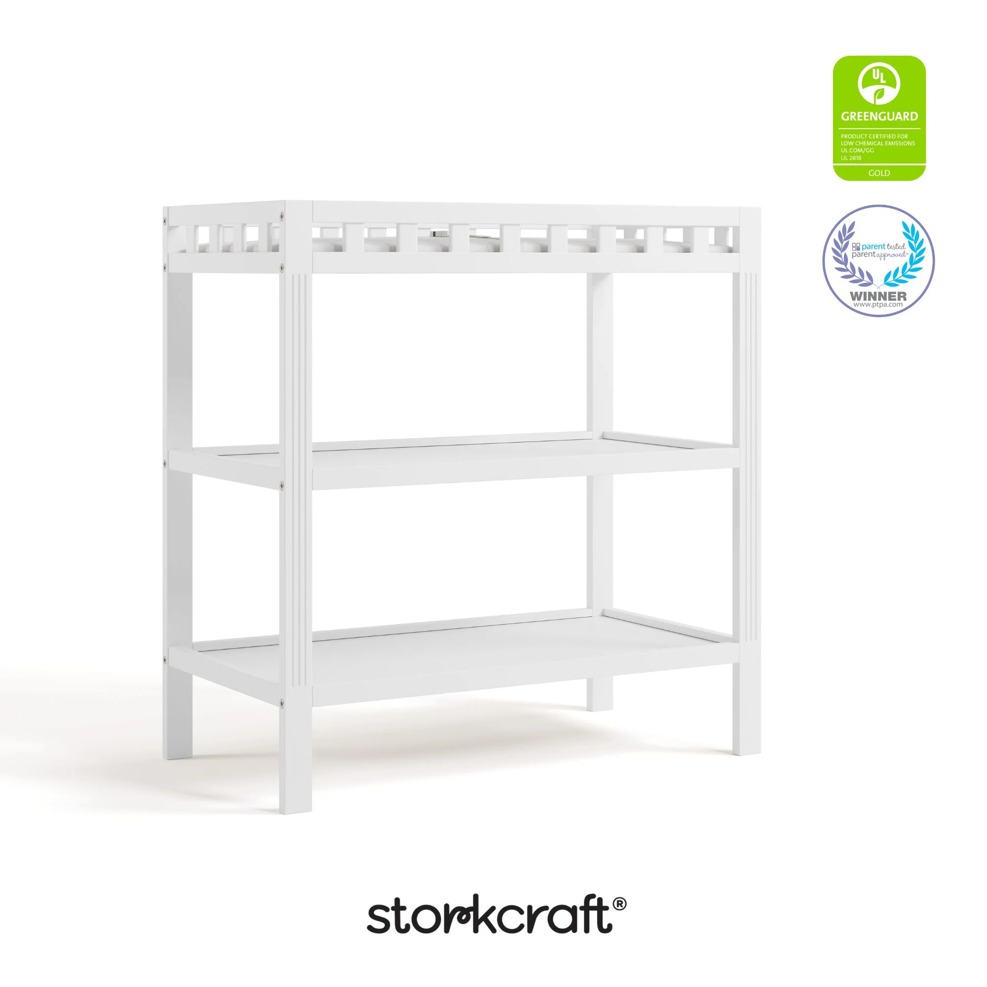 Stylish and simple. Elegant and minimalist. Introducing the timeless, easy-to-match, and easy-to-assemble Storkcraft Morningside Changing Table — a quality crafted baby changing table from Storkcraft, North America’s longest-standing name in baby cribs (since 1945). The Morningside is crafted of solid New Zealand pine wood and wood composites, and is GREENGUARD Gold Certified — Furniture with GREENGUARD Gold certification has been screened for over 10,000 chemicals and volatile organic compounds (VOCs) and meets or exceeds strict chemical safety standards. In addition, the Morningside is certified by the Juvenile Products Manufacturers Association (JPMA) — JPMA Certified products are expert tested by third-party, accredited laboratories to meet or exceed all applicable category voluntary and mandatory safety standards. The Morningside’s applied finish is tested to meet or exceed applicable ASTM and CPSIA safety standards. Designed to provide you with a convenient and secure place to change your baby’s diaper, the Storkcraft Morningside Changing Table includes a waterproof diaper changing pad, “click shut” safety strap, and two (2) open shelves for additional nursery storage. Storkcraft has been recognized with industry awards from the likes of Fast Company, Parents, Baby Innovation Awards, and more, and is the proud recipient of the Parent Tested Parent Approved (PTPA) Seal of Approval for nursery and children’s bedroom furniture. The Morningside is backed by Storkcraft’s supportive, real-life Customer Care team and 1-year limited manufacturer’s warranty. Easy, 30-minute (or less) assembly required (two people recommended for assembly). Waterproof baby changing pad included. Complete Storkcraft’s Morningside Collection with the matching Storkcraft Morningside 5-in-1 Convertible Crib.