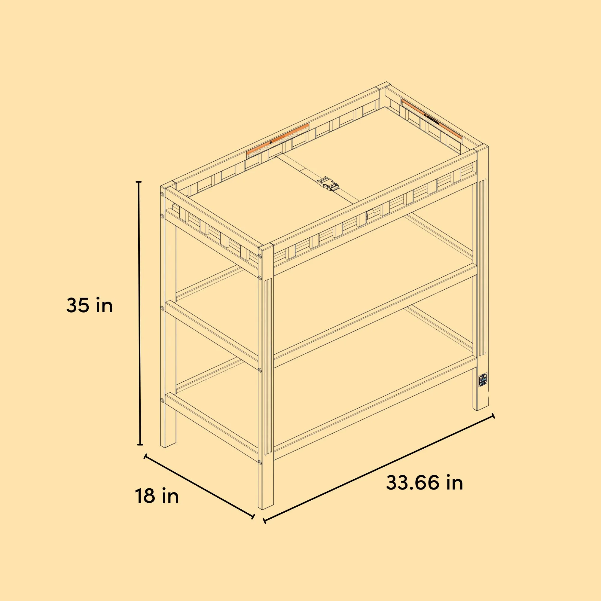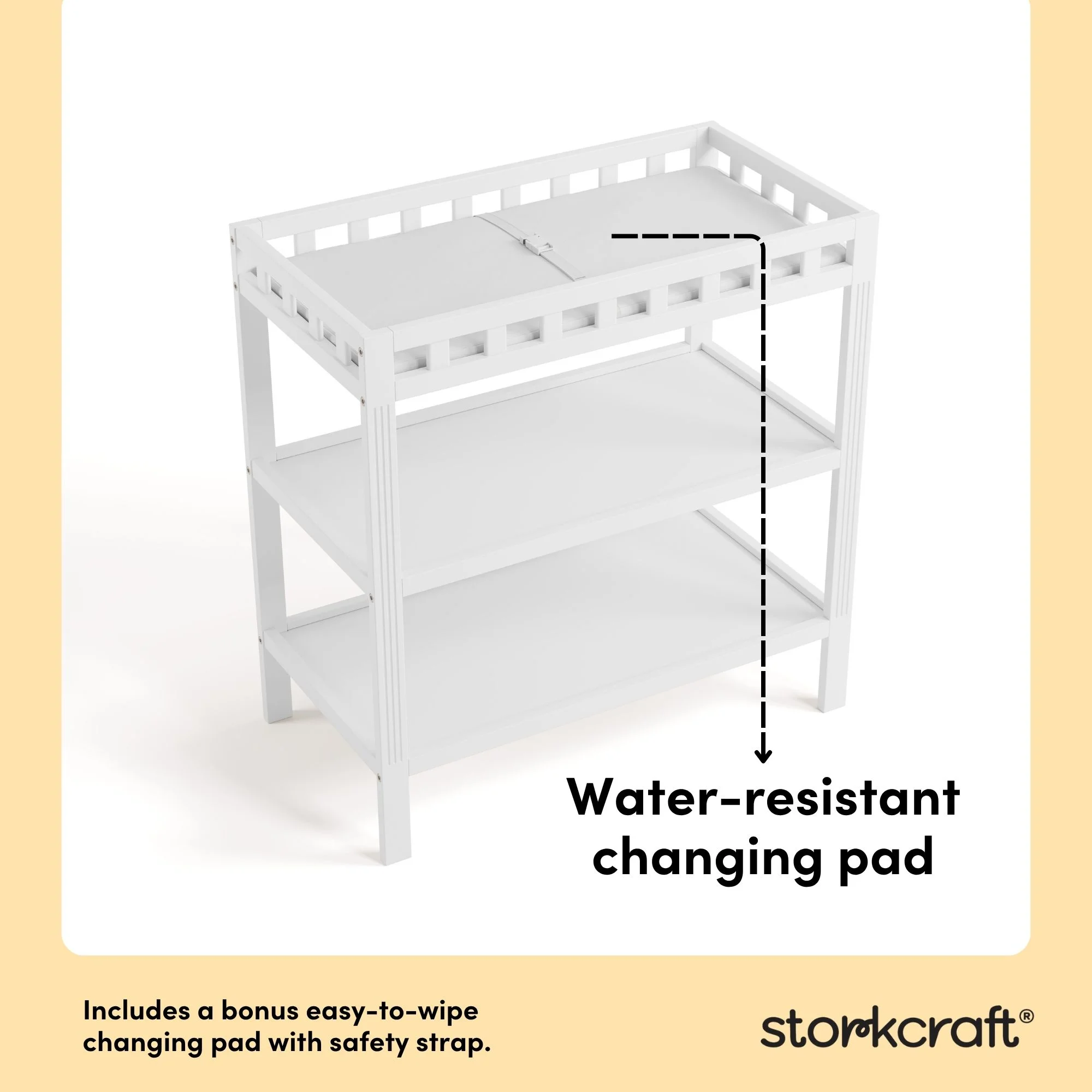 GREENGUARD GOLD CERTIFIED — FOR CLEANER INDOOR AIR: Furniture with GREENGUARD Gold certification has been screened for over 10,000 chemicals and volatile organic compounds (VOCs) and meets or exceeds strict chemical safety standards SOLID WOOD, QUALITY CRAFTMANSHIP — BY STORKCRAFT, SINCE 1945: Crafted of solid wood; Easy, 30-minute (or less) assembly (2 people recommended); 2 open shelves for nursery or kids’ room storage JPMA CERTIFIED, SAFETY TESTED: Expert tested by third-party, accredited laboratories to meet or exceed all applicable category voluntary and mandatory safety standards; Applied finish tested to meet or exceed applicable ASTM and CPSIA safety standards BONUS WATER-RESISTANT CHANGING TABLE PAD: Change table comes equipped with a bonus water-resistant changing table pad and safety strap BY STORKCRAFT, SINCE 1945: Exclusively from Storkcraft – makers of quality nursery and kids’ bedroom furniture since 1945; Proud recipient of the Parent Tested Parent Approved (PTPA) Seal of Approval; 80 years of craftsmanship and excellence in nursery PACKAGED WITH CARE: Packaging tested to reduce the risk of incidental shipment-related damage; Backed by a 1-year limited manufacturer’s warranty CHANGING TABLE ASSEMBLED DIMENSIONS: Width (33.66 in) x Depth (17.91 in) x Height (35.06 in)