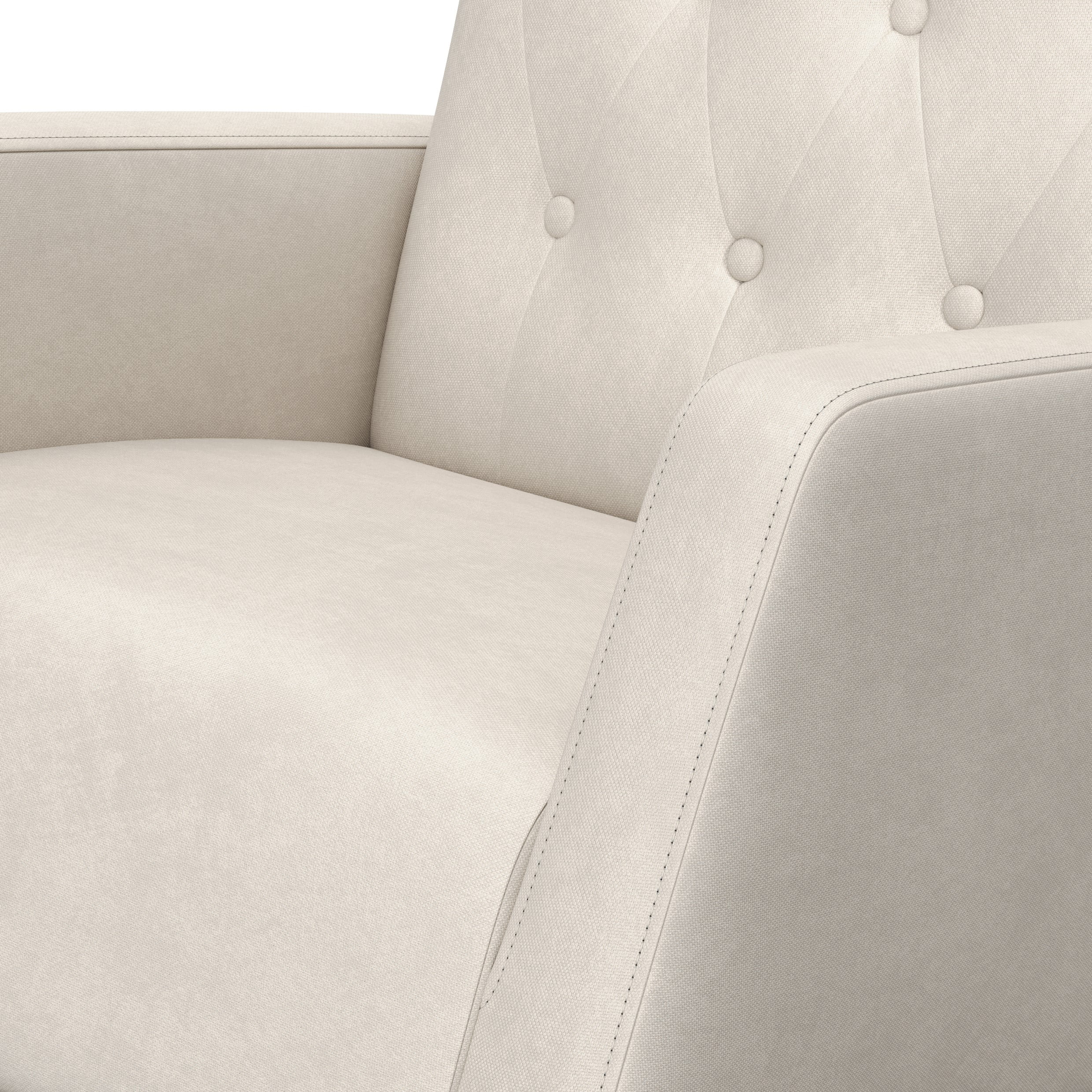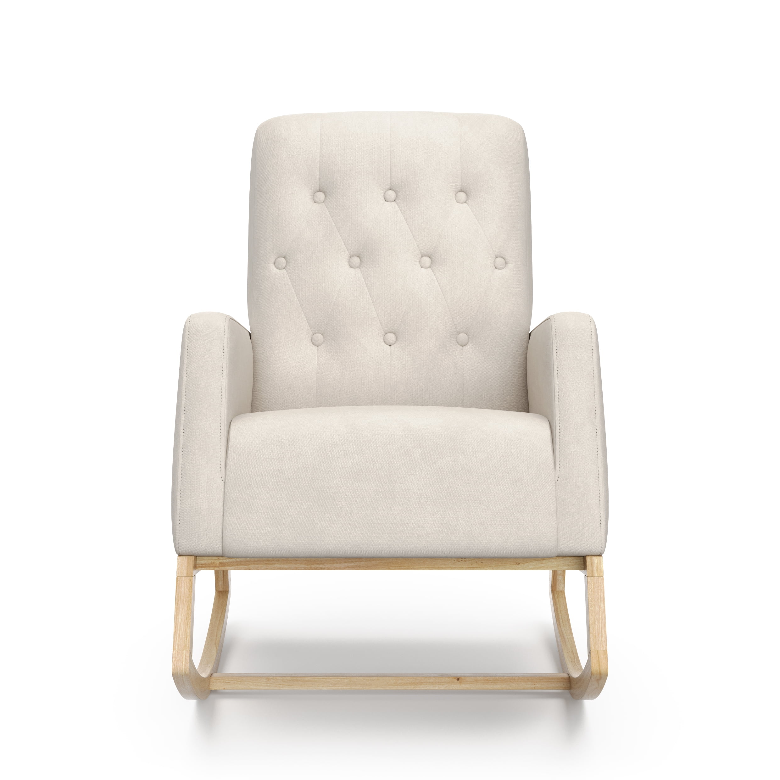 ROCKING CHAIR FOR NURSERY: Stylish, comfortable mid-century modern rocker with gentle rocking motion; Fully upholstered with a quilted, button-tufted pattern; Durable, solid wood base QUALITY CRAFTSMANSHIP: Upholstered in a stylish, quilted, button-tufted 100% polyester fabric; Rocker base crafted of rubberwood solids and engineered wood; Supportive seat and back cushions made of 100% polyurethane foam; Assembly required PACKAGED WITH CARE: Packaging tested to reduce the risk of incidental shipment-related damage; Backed by a 1-year limited manufacturer’s warranty AWARD-WINNING BRAND: Storkcraft is the proud recipient of the 2022 Women’s Choice Award for 9 out of 10 Customer Recommended Baby & Kids Furniture PTPA SEAL OF APPROVAL: Storkcraft is the proud recipient of the Parent Tested Parent Approved (PTPA) Seal of Approval for nursery and children’s bedroom furniture DIMENSIONS: Glider Width (25.25 inches) x Depth (35 inches) x Height (38.5 inches) | Seat back height (22 inches) | Seat depth: 20 inches