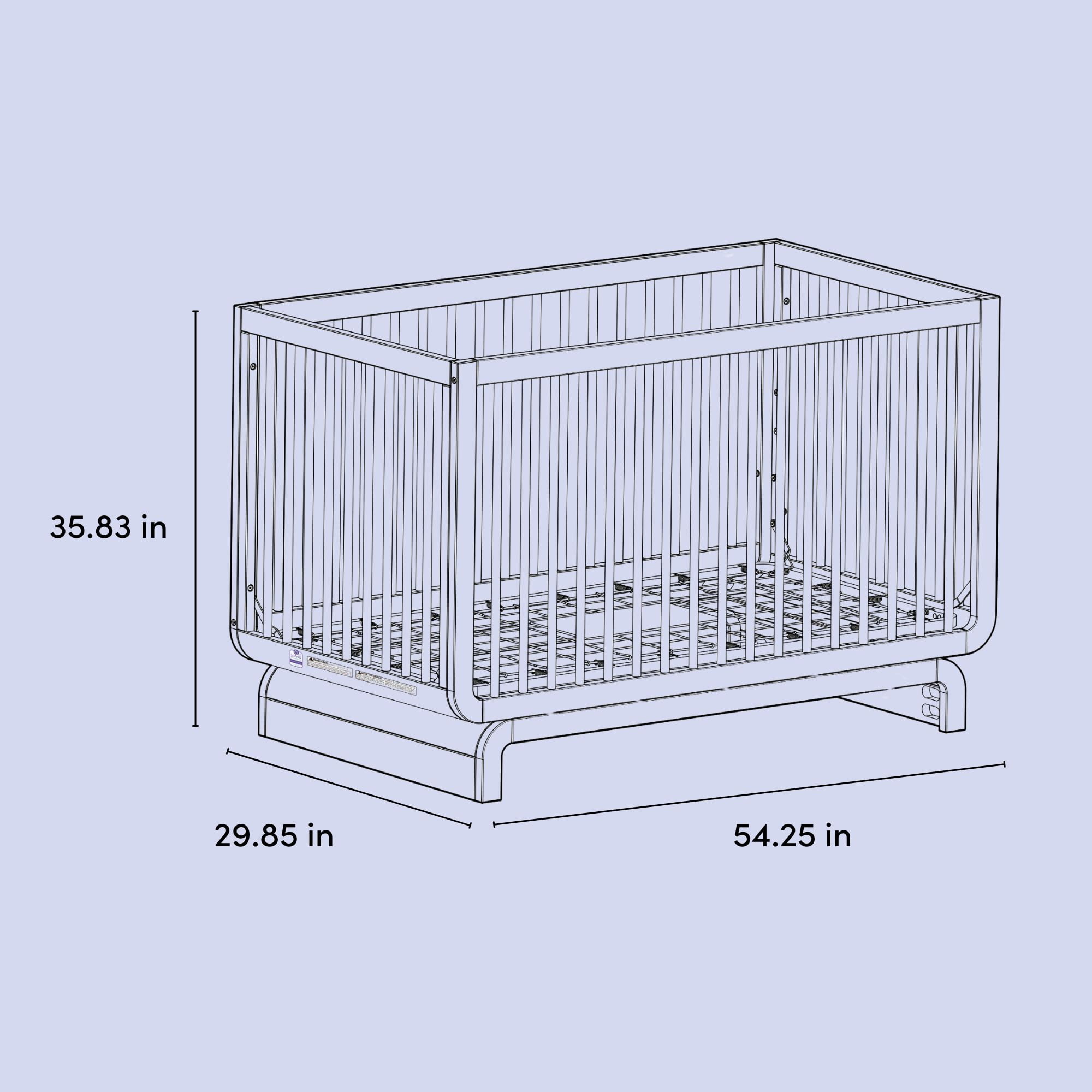 5-IN-1 CONVERTIBLE CRIB WITH BONUS TODDLER GUARDRAIL: Includes bonus toddler guardrail for conversion to toddler bed; Transforms from baby crib (mattress sold separately) to toddler bed, daybed, and full-size bed (conversion kit sold separately) ADAPTS TO YOUR GROWING BABY: Equipped with an adjustable matress support base with 4 different height options; Designed to fit any standard full-size crib & toddler mattress (mattress sold separately) GREENGUARD GOLD CERTIFIED, JPMA CERTIFIED: GREENGUARD Gold Certified products are screened for more than 10,000 chemicals and VOCs known to pollute indoor air; Expert tested to meet or exceed all applicable category voluntary and mandatory safety standards QUALITY CRAFTSMANSHIP: Quality crafted of 100% solid pine wood; Packaging tested to reduce the risk of incidental damage that could occur during shipment CRIB DIMENSIONS: Width (54.25 inches) x Depth (29.85 inches) x Height (35.83 inches)