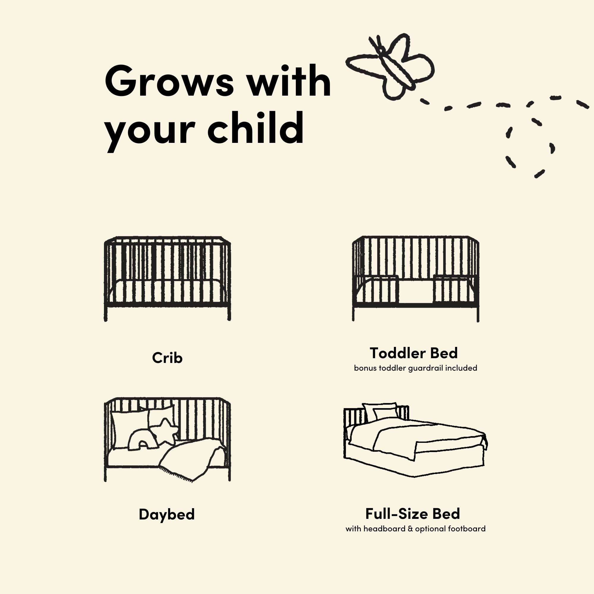 5-IN-1 CONVERTIBLE CRIB WITH BONUS TODDLER GUARDRAIL: Includes bonus toddler guardrail for conversion to toddler bed; Transforms from baby crib (mattress sold separately) to toddler bed, daybed, and full-size bed (conversion kit sold separately) ADAPTS TO YOUR GROWING BABY: Equipped with an adjustable matress support base with 4 different height options; Designed to fit any standard full-size crib & toddler mattress (mattress sold separately) GREENGUARD GOLD CERTIFIED, JPMA CERTIFIED: GREENGUARD Gold Certified products are screened for more than 10,000 chemicals and VOCs known to pollute indoor air; Expert tested to meet or exceed all applicable category voluntary and mandatory safety standards QUALITY CRAFTSMANSHIP: Quality crafted of 100% solid pine wood; Packaging tested to reduce the risk of incidental damage that could occur during shipment CRIB DIMENSIONS: Width (54.25 inches) x Depth (29.85 inches) x Height (35.83 inches)