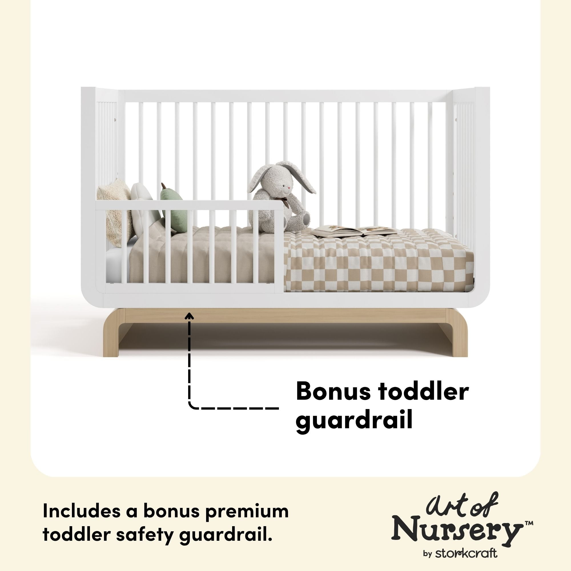 Introducing the Storkcraft Santorini Deluxe 5-in-1 Convertible Crib with Bonus Toddler Guardrail – our most stylish crib yet. To make the Santorini even more special, it includes a toddler safety guardrail — allowing you to transform it into a toddler bed, whenever your child is ready to transition to their first “big kid” bed. GREENGUARD Gold Certified and a Storkcraft original design, the elegant Santorini Crib is named after one of the most beautiful places in the world, and is a dreamy blend of quality craftsmanship, timeless beauty, and rounded shapes. The Santorini is GREENGUARD Gold Certified, crafted from solid wood, and its applied finish has been tested to meet or exceed the applicable ASTM and CPSIA safety standards. The Santorini is JPMA Certified — meaning it’s been expert tested by third-party, accredited laboratories to meet or exceed all of the applicable category voluntary and mandatory safety standards. Designed to adapt to your growing baby, the Santorini includes a bonus toddler safety guardrail that spans half of the crib, and its adjustable mattress support base has 4 different height options, so the mattress support base’s position can be lowered as your child grows (please note, this crib may only be used until your child can easily climb out or is taller than 35 inches (89 cm). To support your child’s journey from babyhood to toddlerhood (and beyond), the Santorini is able to be converted from a crib to a toddler bed (toddler safety guardrail included), daybed, and full-size bed with headboard and optional footboard (compatible Storkcraft full-size bed conversion kit sold separately). The Storkcraft Santorini Deluxe 5-in-1 Convertible Crib with Bonus Toddler Guardrail is designed to accommodate any standard full-size crib & toddler mattress (mattress sold separately — we recommend any Graco mattress). Storkcraft is the proud recipient of the Parent Tested Parent Approved (PTPA) Seal of Approval for nursery and children’s bedroom furniture, 2023 PTPA Top Product Award, and the 2023 Women’s Choice Award for 9 out of 10 Recommended Baby & Kids Furniture. Backed by a 1-year limited manufacturer’s warranty. Assembly required. Mattress sold separately. Complete the Storkcraft Santorini collection with the Storkcraft Santorini 6-Drawer Double Dresser and Storkcraft Santorini 3-Drawer Chest with Changing Topper.
