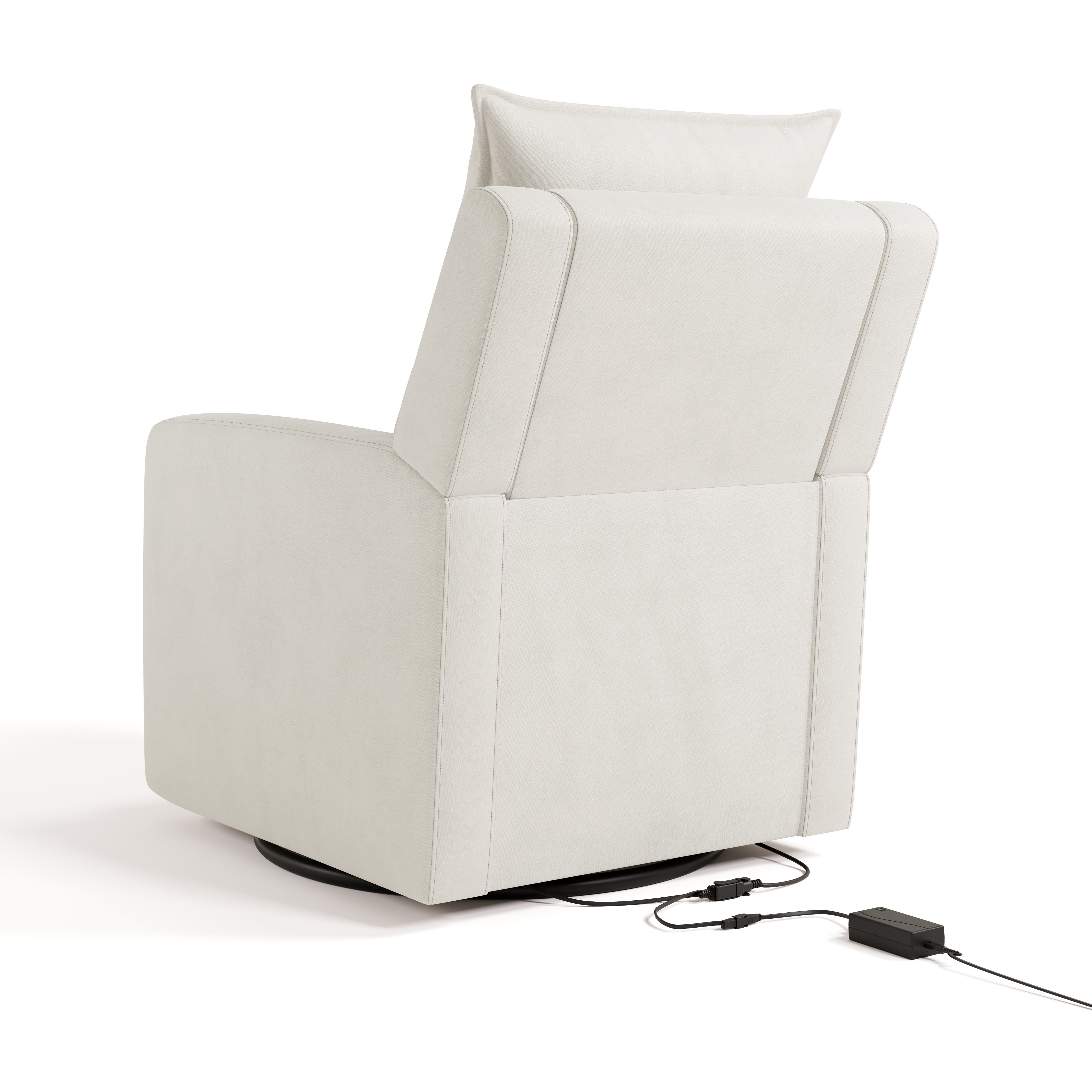 Modern combination nursery recliner, rocking and swivel chair Manual recline function (not automatic) with easily accessible recline handle on outside Individual, separate back and seat cushions with decorative self-flange for an upscale, fashionable feel Super plush, poly fill cushions for the ultimate in reclining comfort on both back and seat Raised back pillow (taller than the seat back) provides comfort for your neck Track arms with radiused front edge helps with getting in and out comfortably, even with a child in your arms Perfect arm height for nursing Equipped with two USB charging ports To clean: Spot clean with a damp cloth Exclusively from Storkcraft Product materials: Glider base (steel), Glider frame (plywood), Fabric (100% polyester), Cushion fill (100% polyester), Arm cushion pads (100% polyurethane foam)