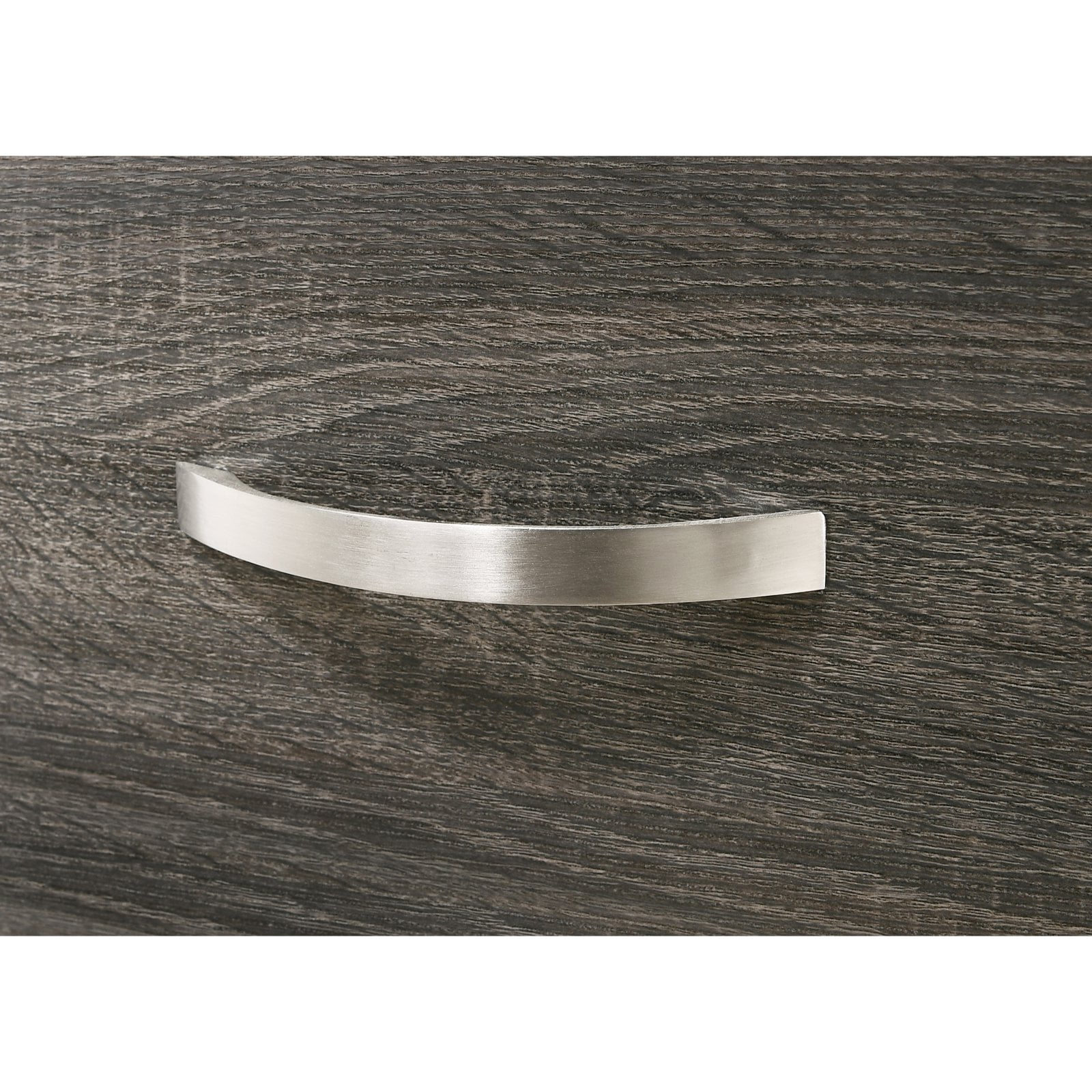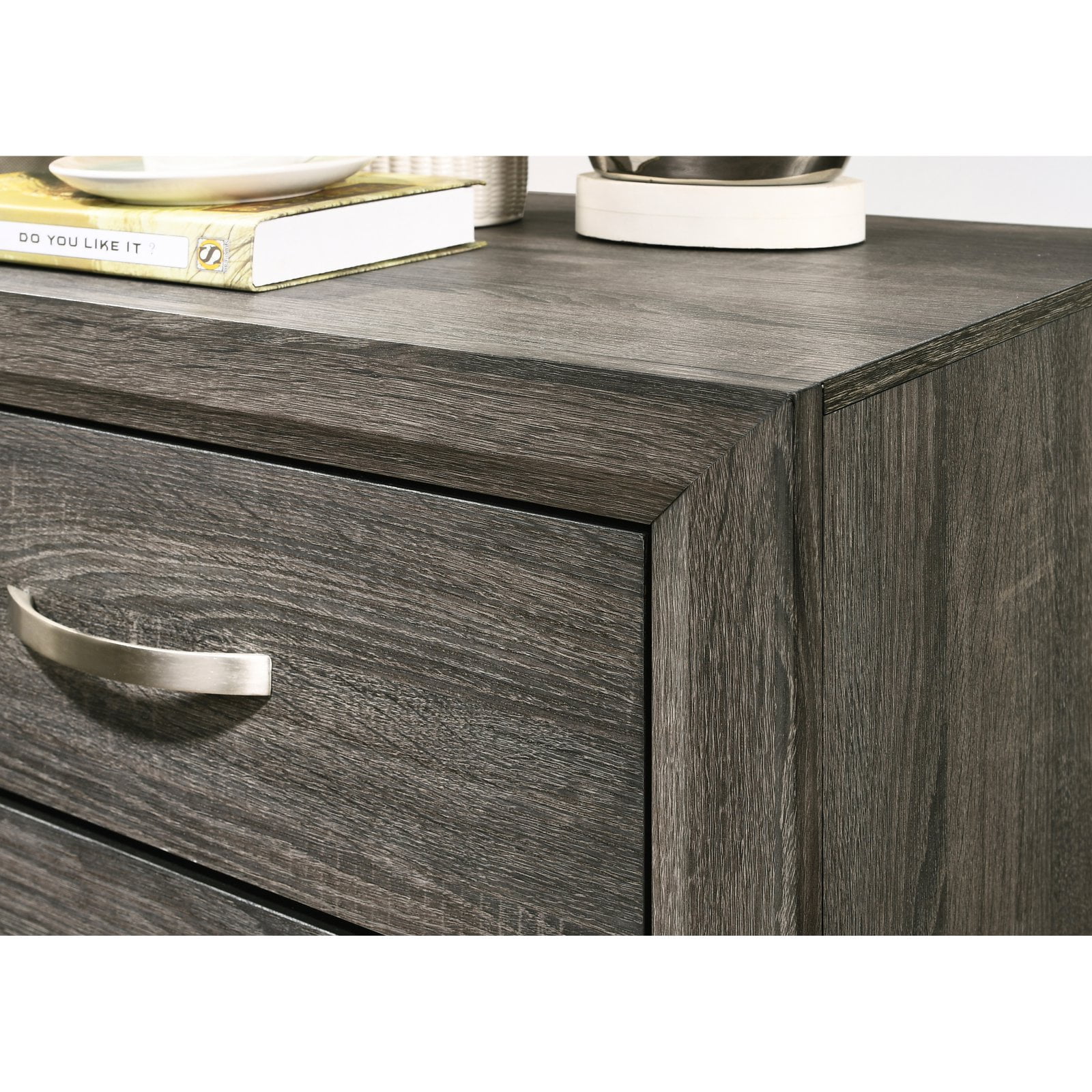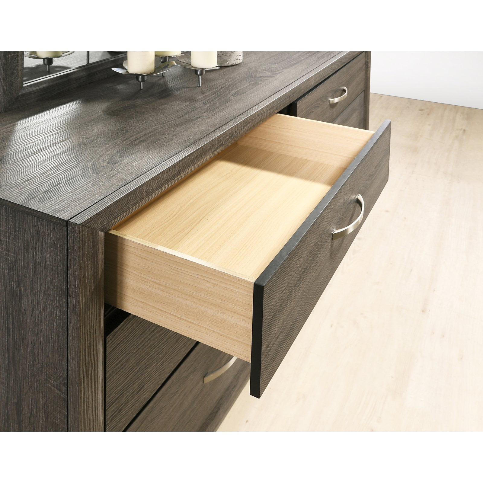 6 drawers, side metal roller glides Industrial metal pulls in brushed nickel finish Made of engineered wood and veneers in dark ash gray finish