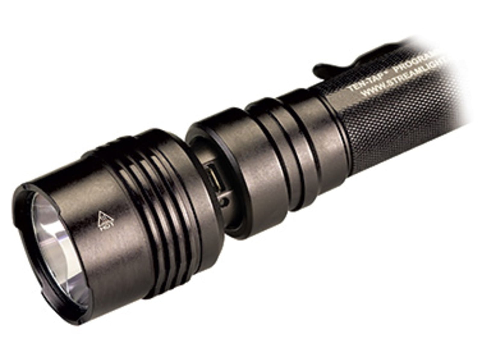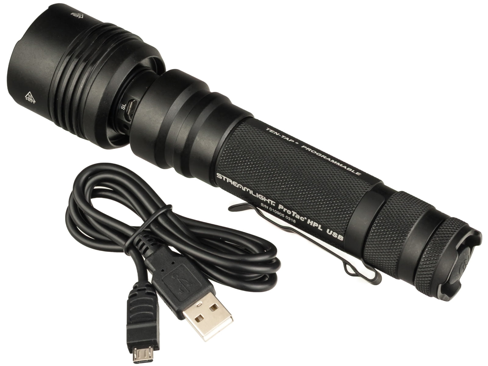 DETAILS: A 1000-lumen maximum output, a sturdy aluminum body, and multiple options for battery power distinguish the Streamlight ProTac HPL USB Rechargeable Tactical Flashlight. The HPL comes with a lithium-ion battery that recharges inside the light via micro-USB, but it can also run on one user-supplied 18650 or two CR123A batteries. A tailcap push-button switch is used to cycle through high, medium, and low brightness levels, and a strobe setting for disorienting an adversary or signalling for help. You can select three programs that put the light levels you use most often at your fingertips? high/strobe/low, high only, or low/medium/high. The knurled anodized aluminum housing has an IPX4 water-resistance rating and is impact resistant to 6.6′. Slide the front end of the light housing forward to reveal the micro-USB charging port. Consistent performance is assured by digital output regulation circuitry, which maintains the brightness level throughout the charge.