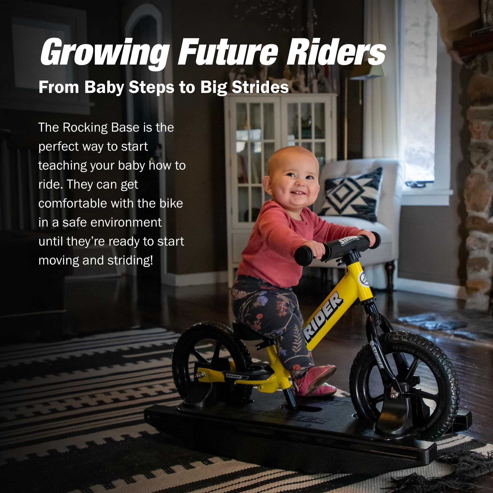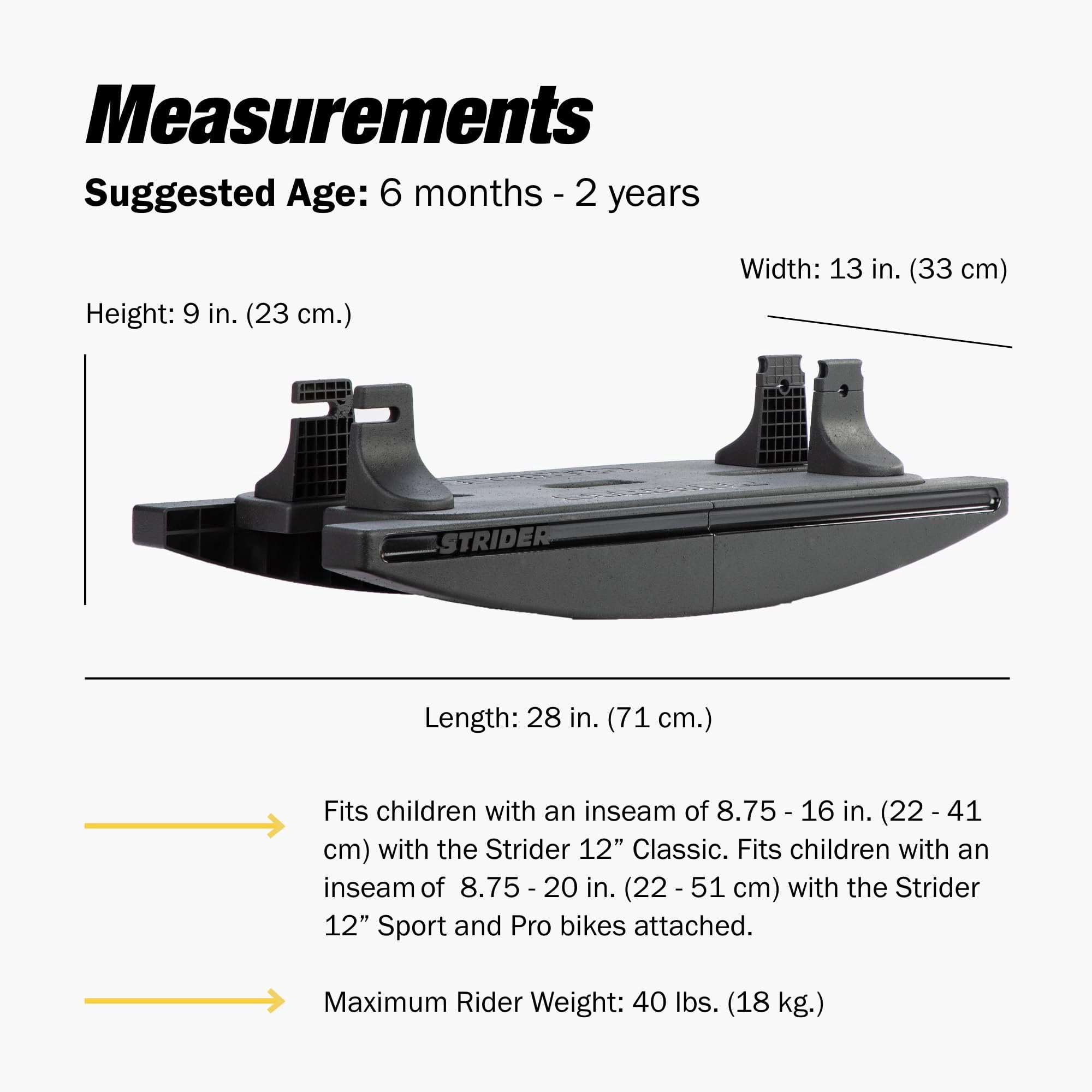 Teach Balance and Stability Recommended for toddlers ages 6 – 24 months Drops stand-over height Inseam for bike & base: 10-18 inches Inseam for bike: 11-17 inches Rocking base fits Strider 12 Classic, Sport, and Pro Bikes (sold separately) All-Weather, durable plastic Easy, no-tool, no-stress assembly Available in black Unisex Max weight 40 lb Adult assembly required