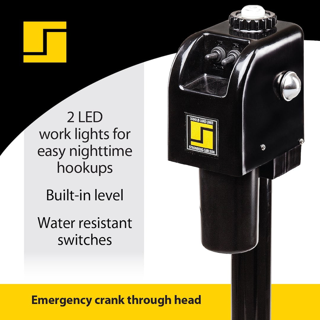 Stromberg Carlson 3500 lb. Electric Tongue Jack with Light: 3,500 lb capacity Easily set your equalizing bars 18″ travel, with an additional 5″ drop down leg 2 separate LED night lights 2-3/16″ heavy wall outer tube