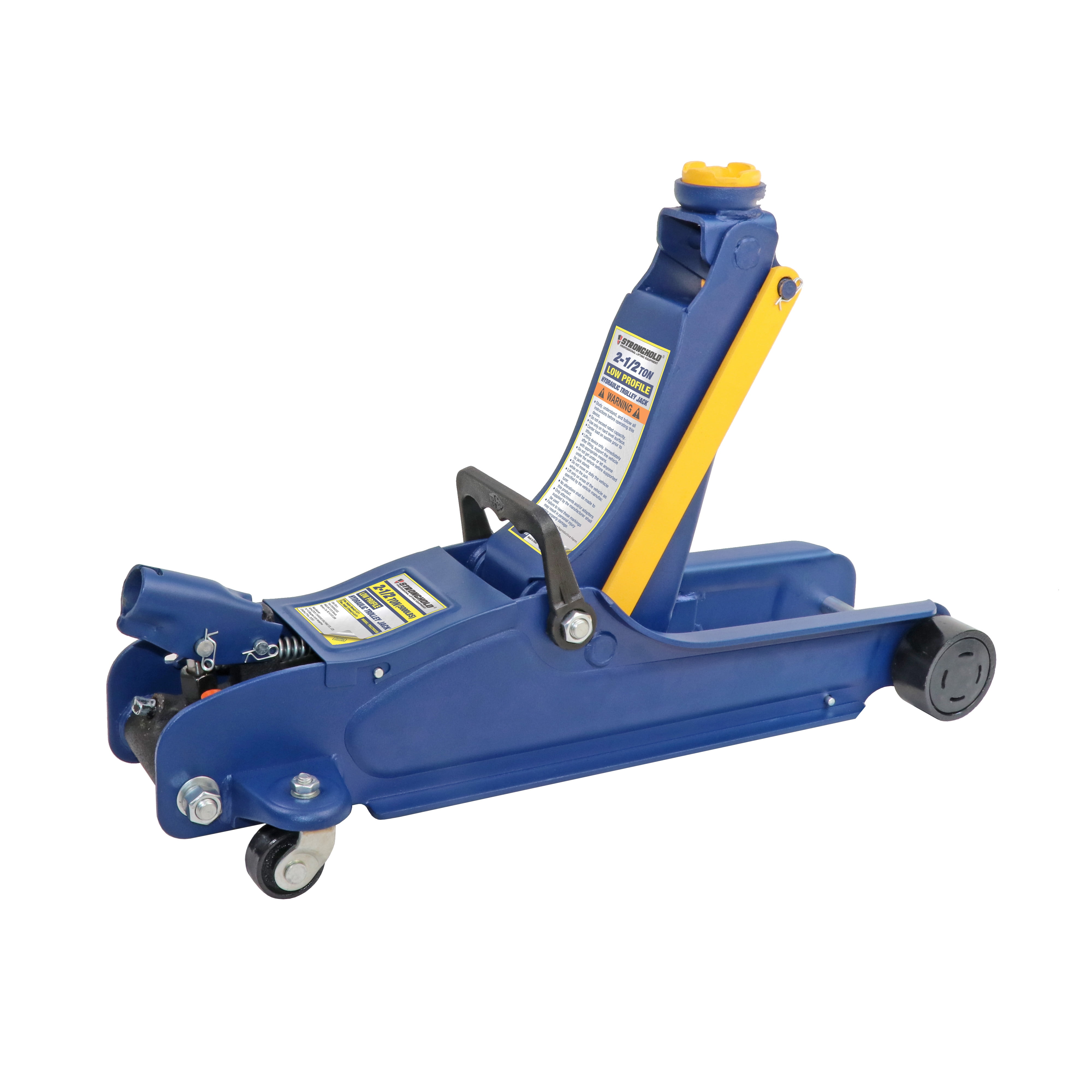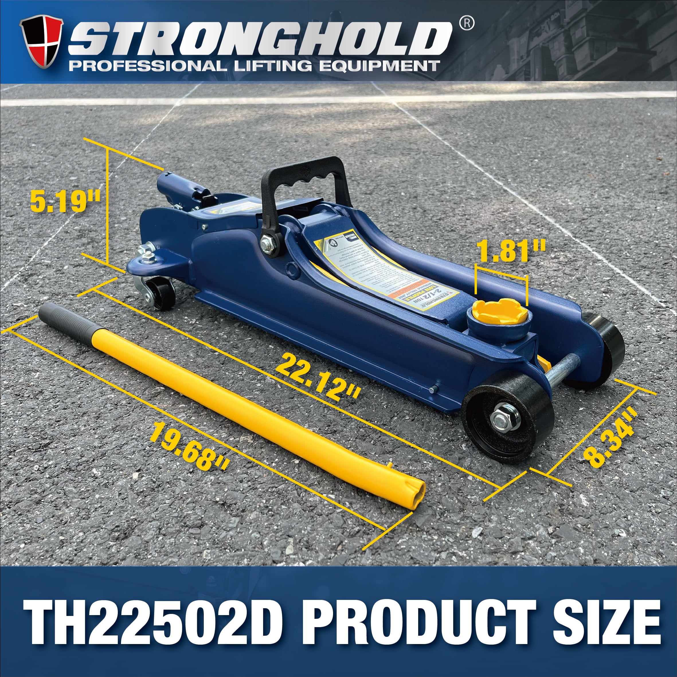 STRONGHOLD Hydraulic Low-Profile Trolley Jack TH22502D is constructed with heavy duty steel, provides stability and endurance, and built-in safety valve protects against jack over-loading. This trolley jack has a 2Ton(4000Lbs) capacity and features a extra low profile minimum lifting height of 3-1/2″ and a maximum height of 14-3/4″, which is ideal for most cars. The swivel saddle provides smooth maneuvering and positioning, while the hydraulic oil by pass system protects ram from being over-extended. The Swivel rear casters provide smooth maneuvering and positioning. Equipped with a handle for quick portability and a carrying handle for convenient transportation. It will make your vehicle maintenance easier with the STRONGHOLD 2.5Ton Low profile Trolley Jack STRONGHOLD brand products are manufactured by TIANHENG factory which has been about 70 years history, with fully production process system provides high quality lifting products, such as Trolley Jacks, Garage Service Jacks, Transmission Jacks, Long Chassis Jacks, Motorcycle/ATV Jacks, Engine Cranes, Engine Stands and etc. Whether you’re a professional garage shop or a DIY guru, STRONGHOLD offers an assortment of affordable and reliable lifting tools to help complete your projects.