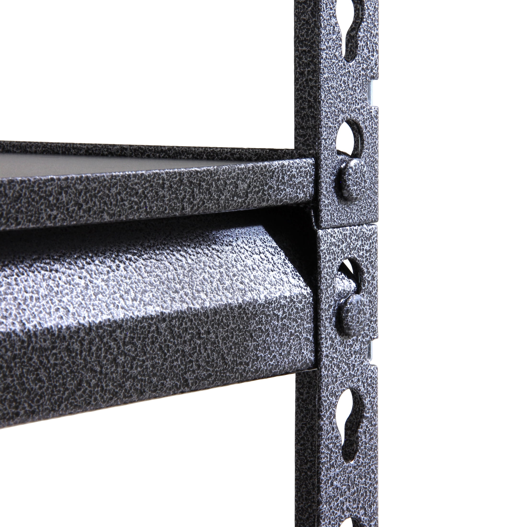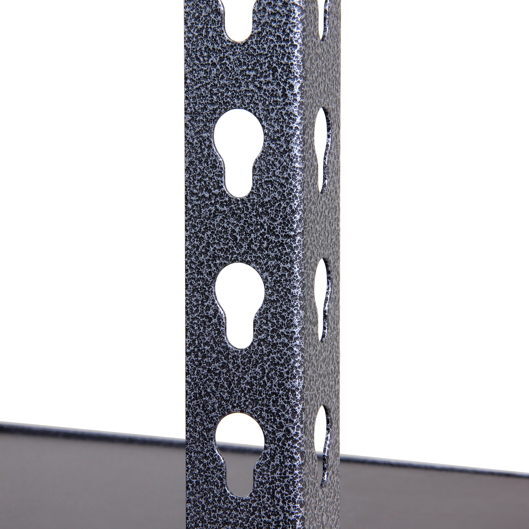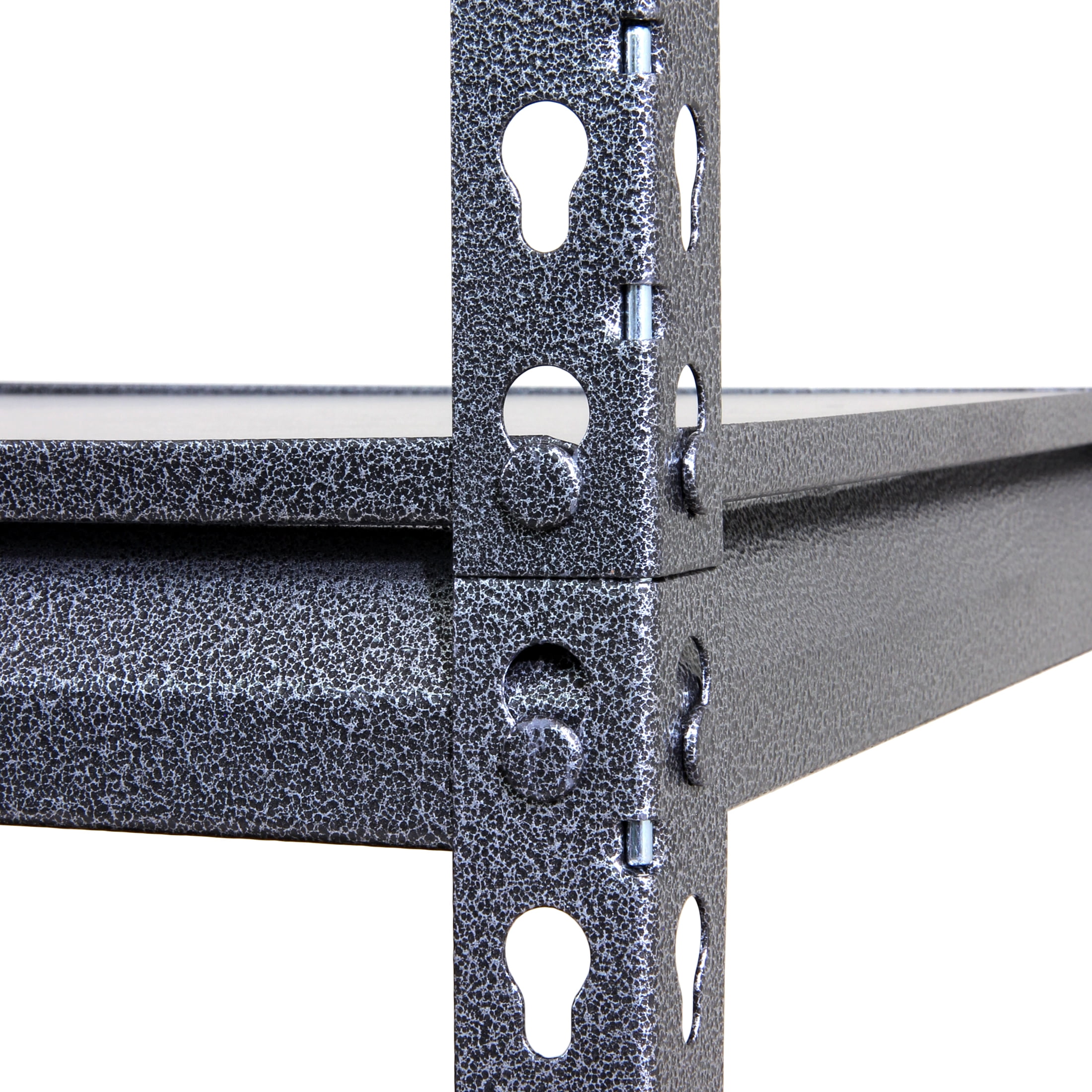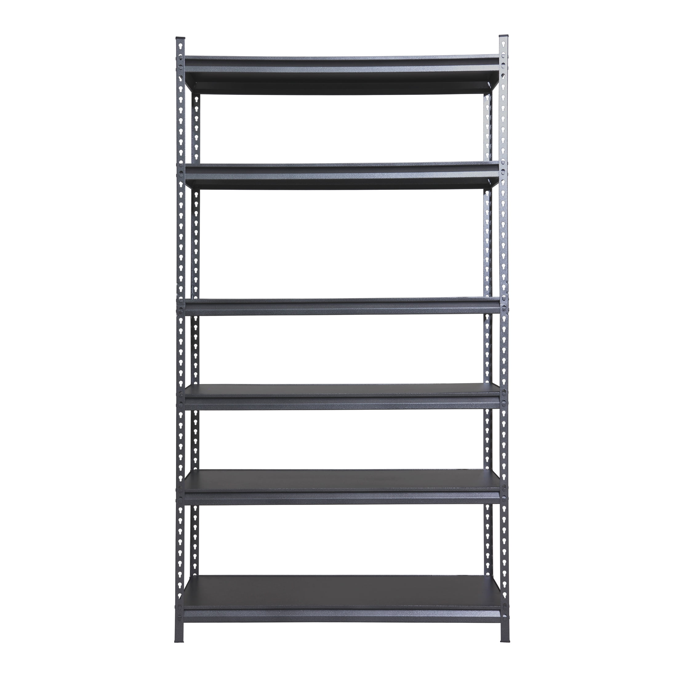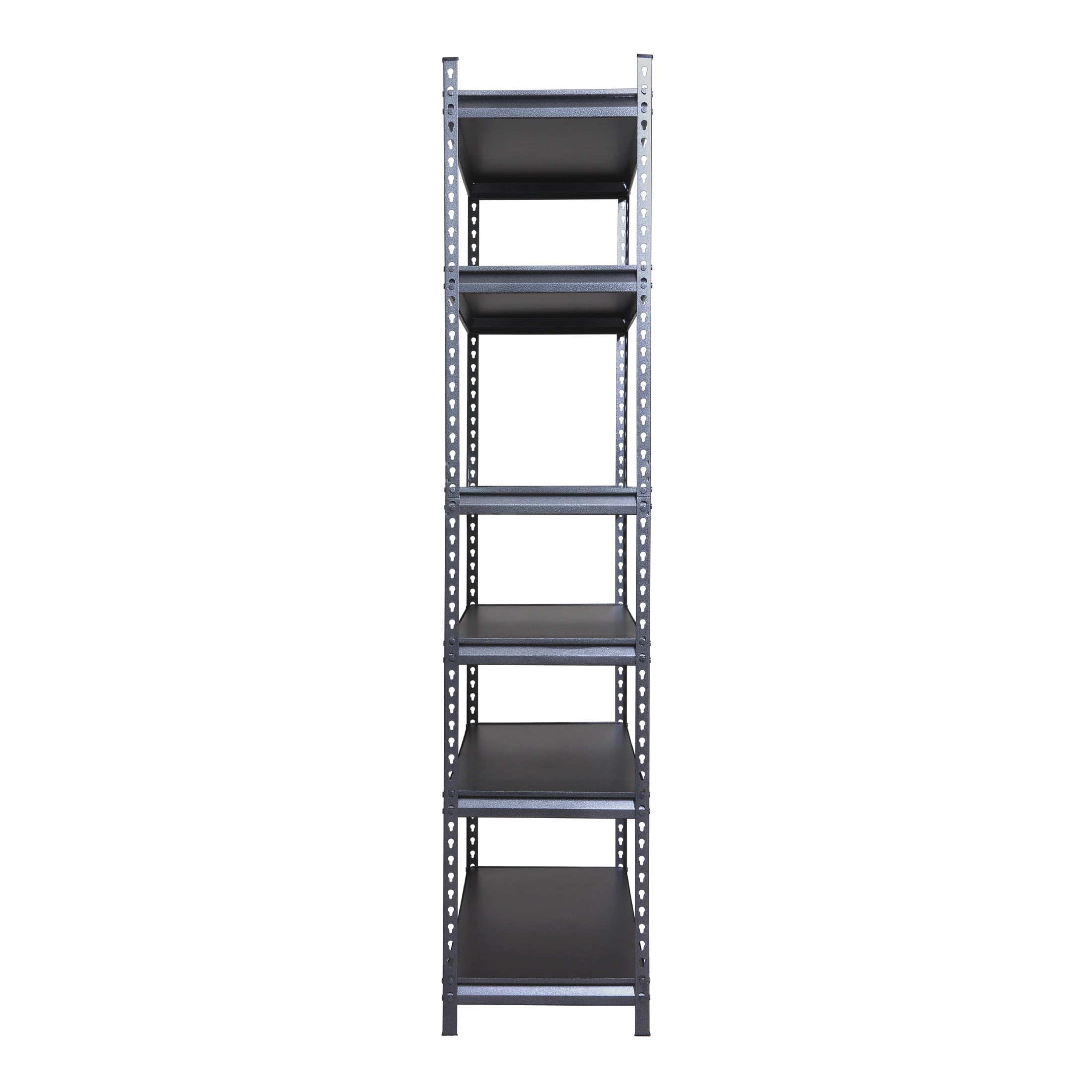 Stronghold Garage Gear 6-Shelf Boltless Rack Wood Decking 48″W x 18″D x 86″H, made of steel frame with durable rust resistant powder coated in textured gray color. 18” Deep PB board shelves are adjustable in 1.5” increment. Horizontally assemble as a workbench or vertically as a storage shelf. Loading capacity 600lbs per shelf. Adult Assembly, boltless construction using pin construction to connect top and bottom rack.