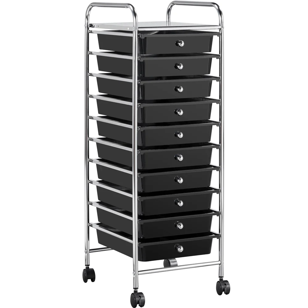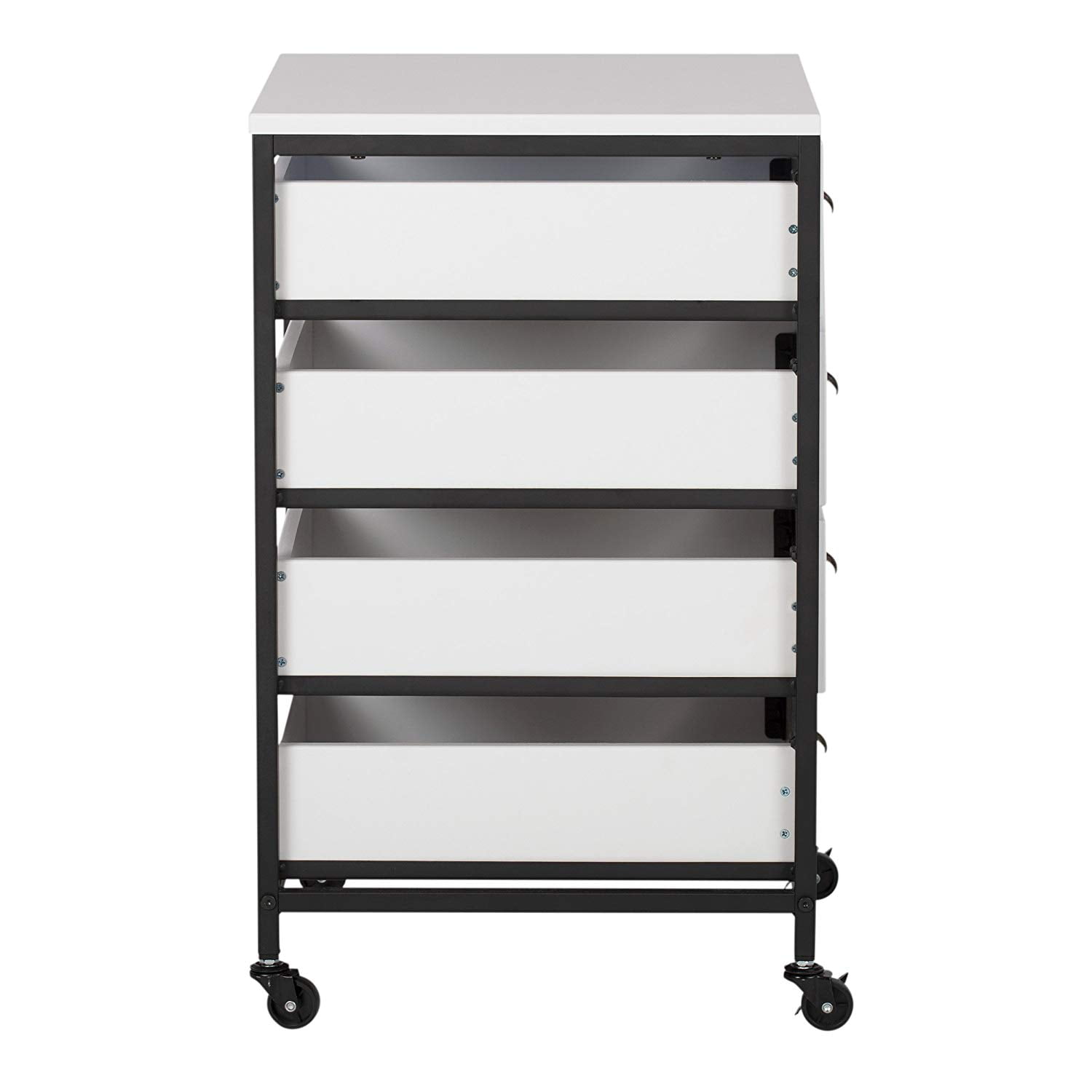 Studio Designs 4-Drawer Mobile Organizer: • Dim: 17″ W x 17″ D x 27″ H • Four Pull-Out Drawers: 14″ W x 15″ D x 3.25″ H • Metal Handles with Window for Label • Powder Coated Steel Frame for Durability • Four Casters for Mobility with Two Locking • Drawer Weight Limit: 15 lbs. ea.