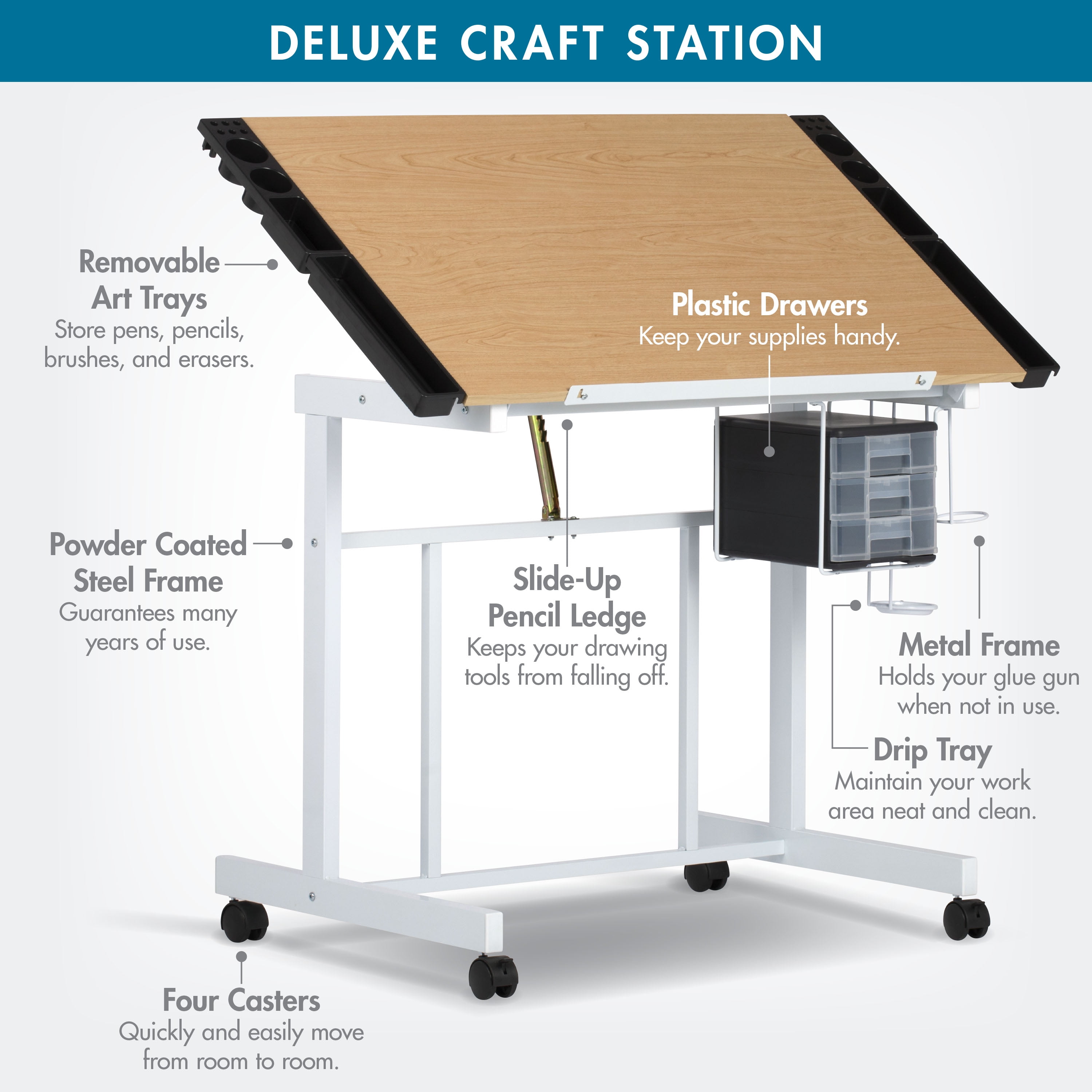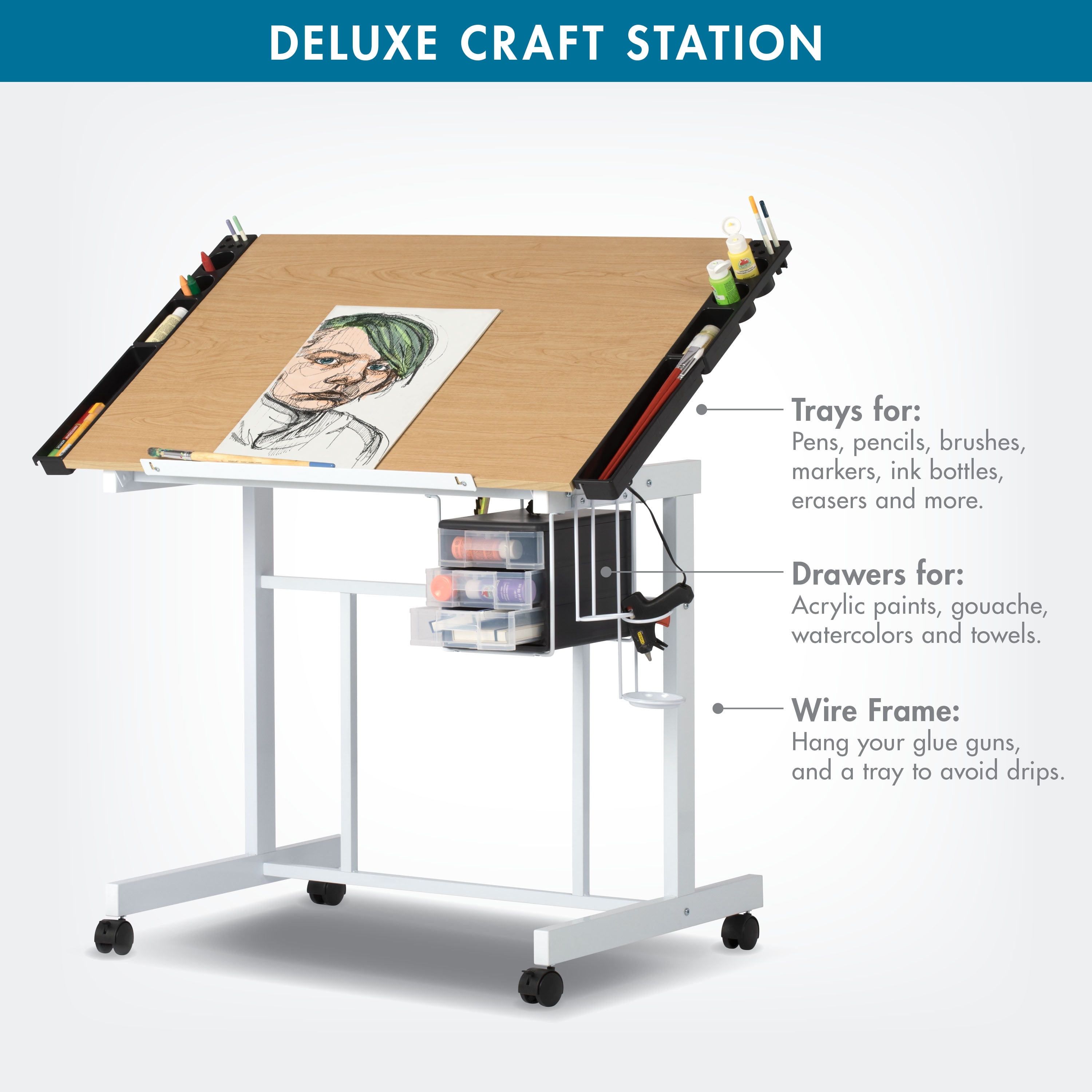 Studio Designs Adjustable Mobile Deluxe Drawing Drafting Table, White Arts and crafts table ideal for home or studio use Finger touch adjustable angle top for customized comfort Top angle adjusts up to 40 degrees for optimal drawing position Four side trays for convenient storage of paints brushes pens and other accessories Three plastic molded slide out drawers for additional storage
