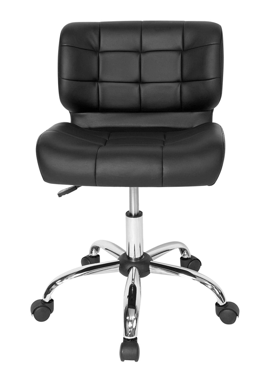 The Black crest office chair by Studio Designs features a thick, contoured Seat and backrest for added form-fitting support. The striking combination of Tufted, Black vinyl with a chrome base, make it the perfect modern seating option for your home office. The 5-star chrome base with dual wheel casters and 360-degree swivel allows you to easily access your entire workspace with ease. The pneumatic height adjustment Lever allows you to easily set your seat to the desired Height. SKU:KITCHB072KDRZHP