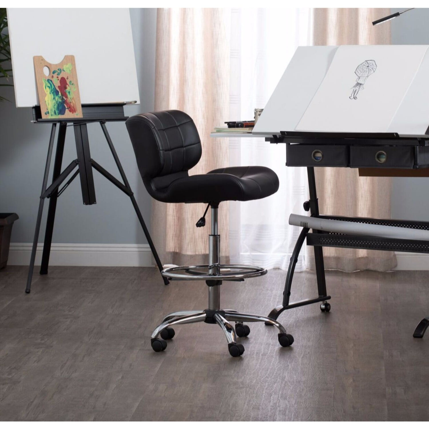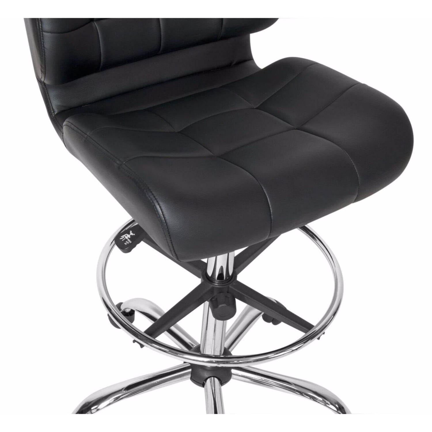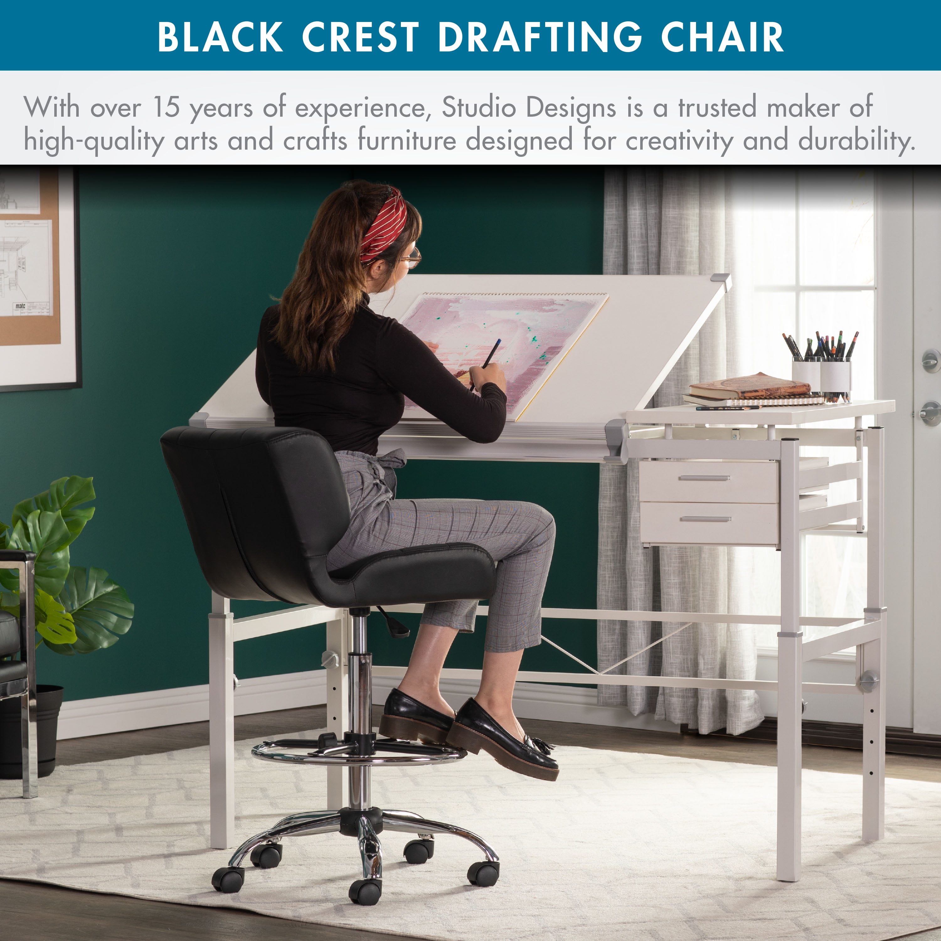 The Crest Black Faux Leather Drafting Chair by Studio Designs features a thick, tufted seat and back for added form-fitting support. The striking combination of tufted black vinyl with a chrome base and footrest, make it the perfect modern seating option for your art studio. The 5-star chrome base with dual wheel casters and 360-degree swivel allows you to easily access your entire workspace with ease. The pneumatic height adjustment lever allows you to easily sit at a drafting table or standing desk. The height adjustable foot ring (18-inch diameter) provides a perfect angle for your legs aiding in better circulation.