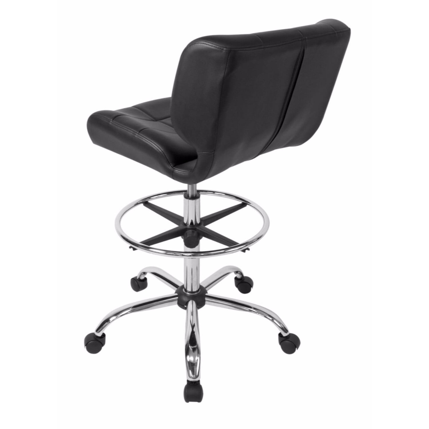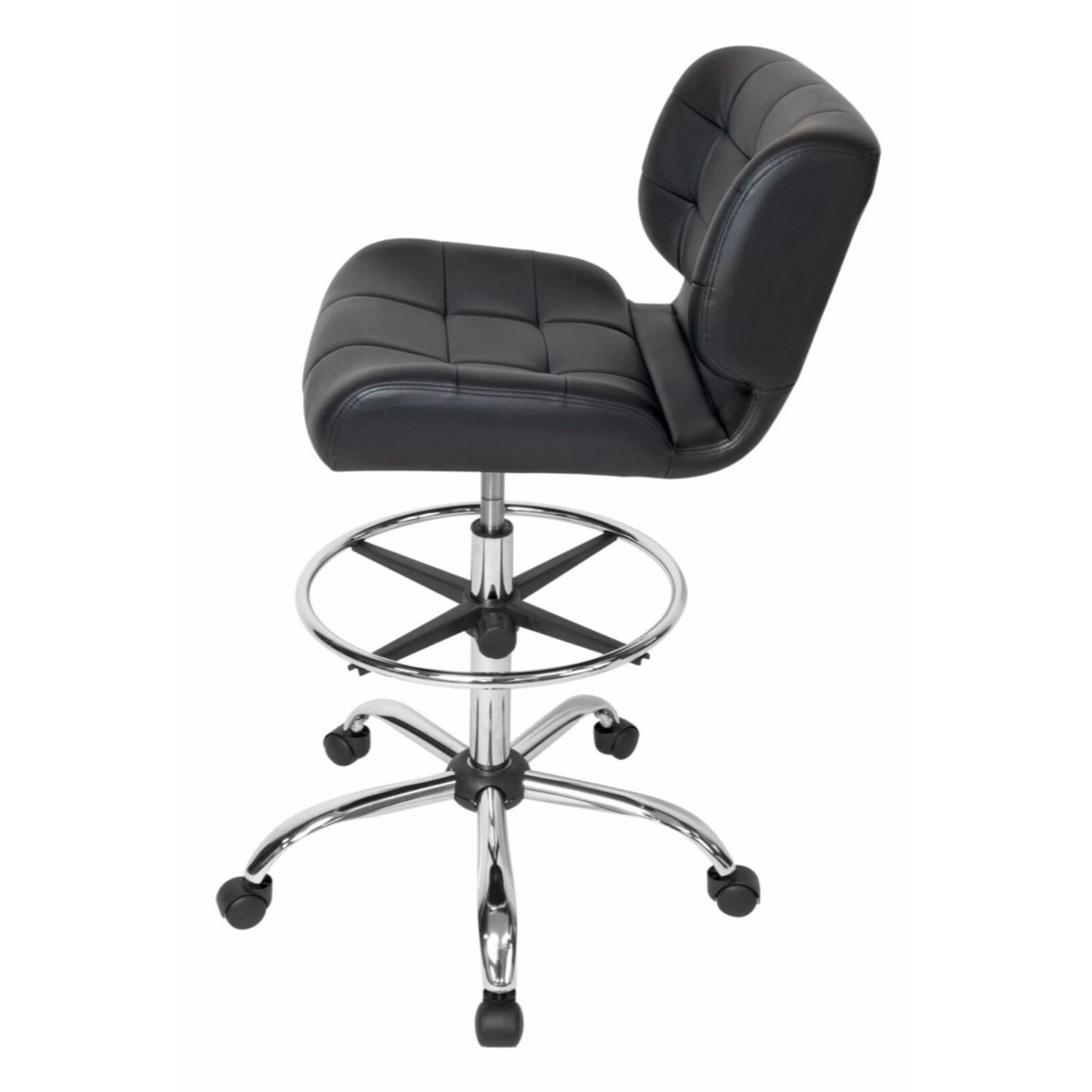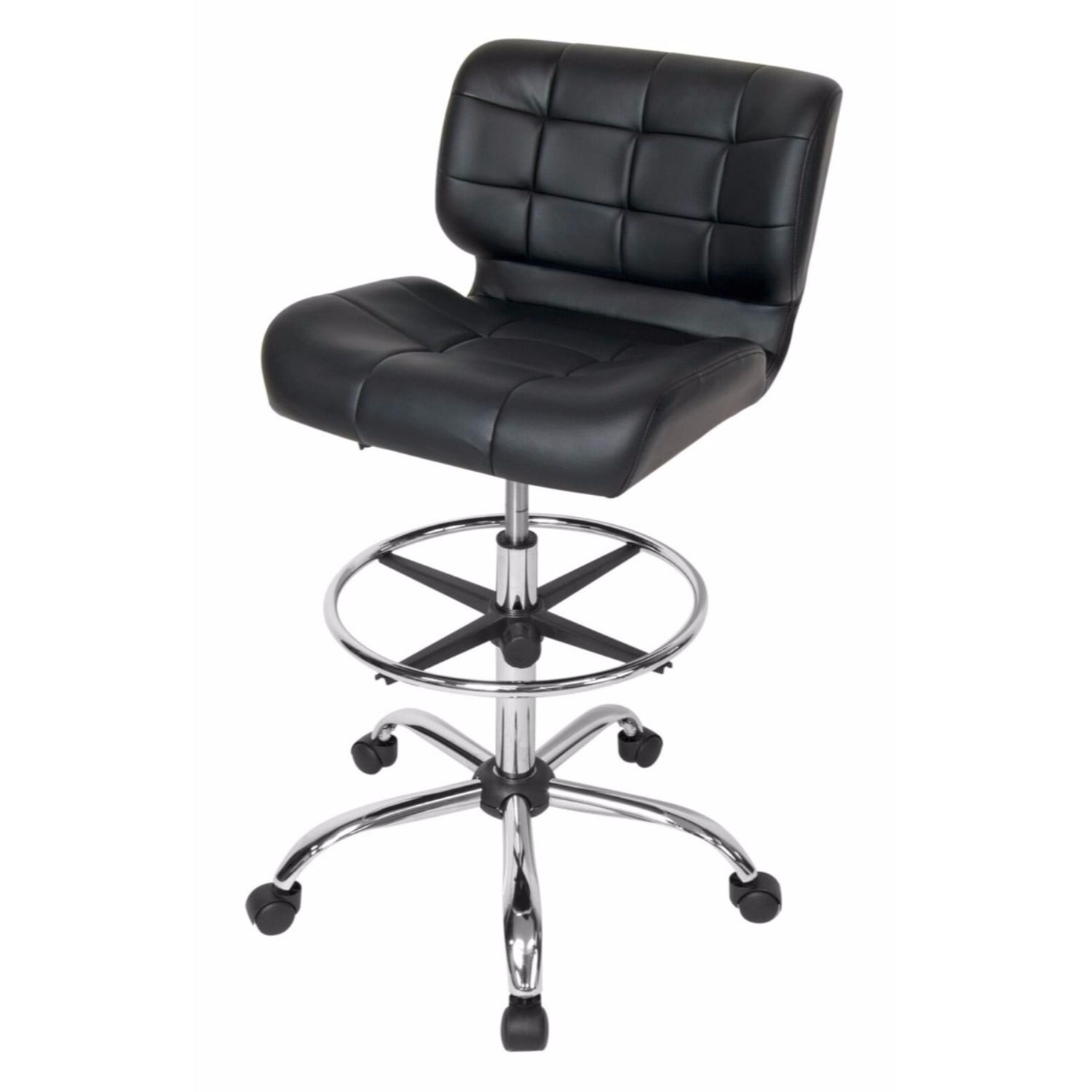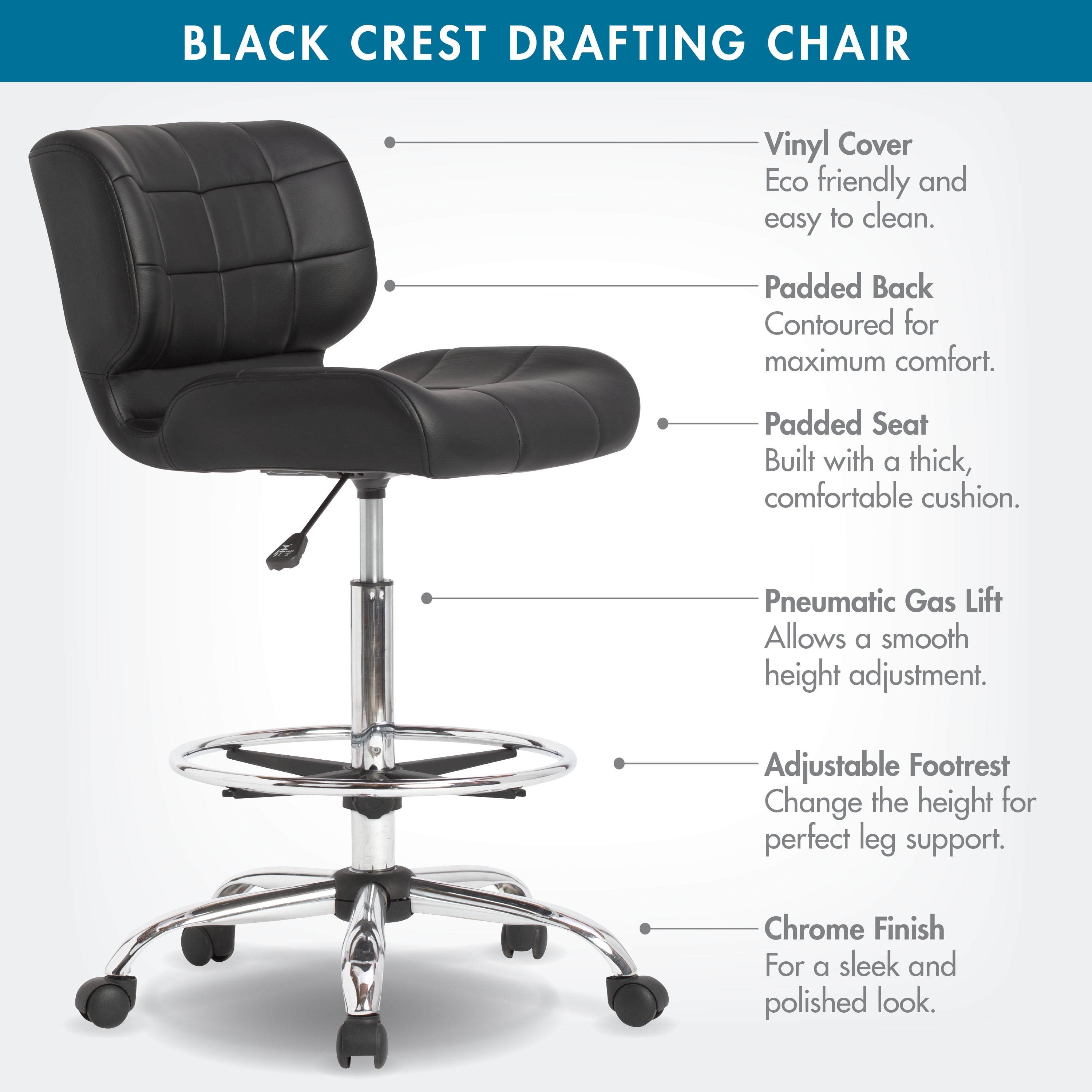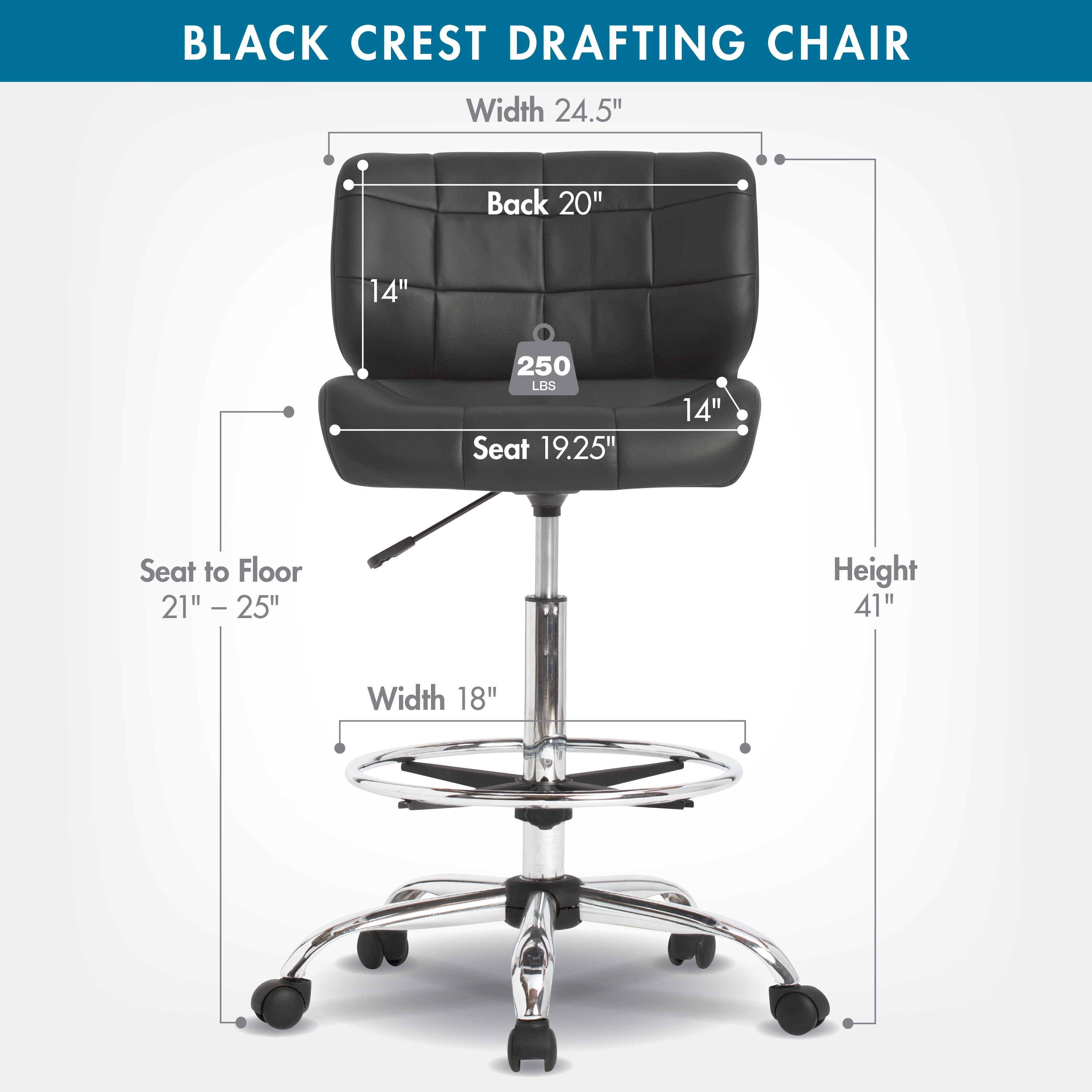 Overall Dimensions: 24.5″ W x 24.5″ D x 41″ H DRAFTING DESK CHAIR: An adjustable-height working chair to be used at your drafting or art table with a contoured seat cushion and back and a thick, comfortable chair cushion with a durable vinyl cover STYLISHLY DESIGNED OFFICE CHAIR: Upgrade your computer chair or design studio with this modern-style rolling swivel chair with tufted black vinyl and a chrome base ADJUSTABLE HEIGHT: Pneumatic gas lift with height adjustment handle and chrome five-star base with 2″ covered casters ADJUSTABLE FOOTREST: Black and chrome footrest with adjustable height; 18″ in diameter OVERALL DIMENSIONS: 24.5″ W x 24.25″ D x 41″ H; Seat: 19.25″ W x 14″ D; Backrest: 20″ W x 14″ H; Adjustable height: 25″ – 30″ seat to floor; Weight limit: 250 lbs ⚠ WARNING: This product can expose you to chemicals Including DEHP, which are known to the State of California to cause cancer or birth defects and other reproductive harm. For more information, go to .