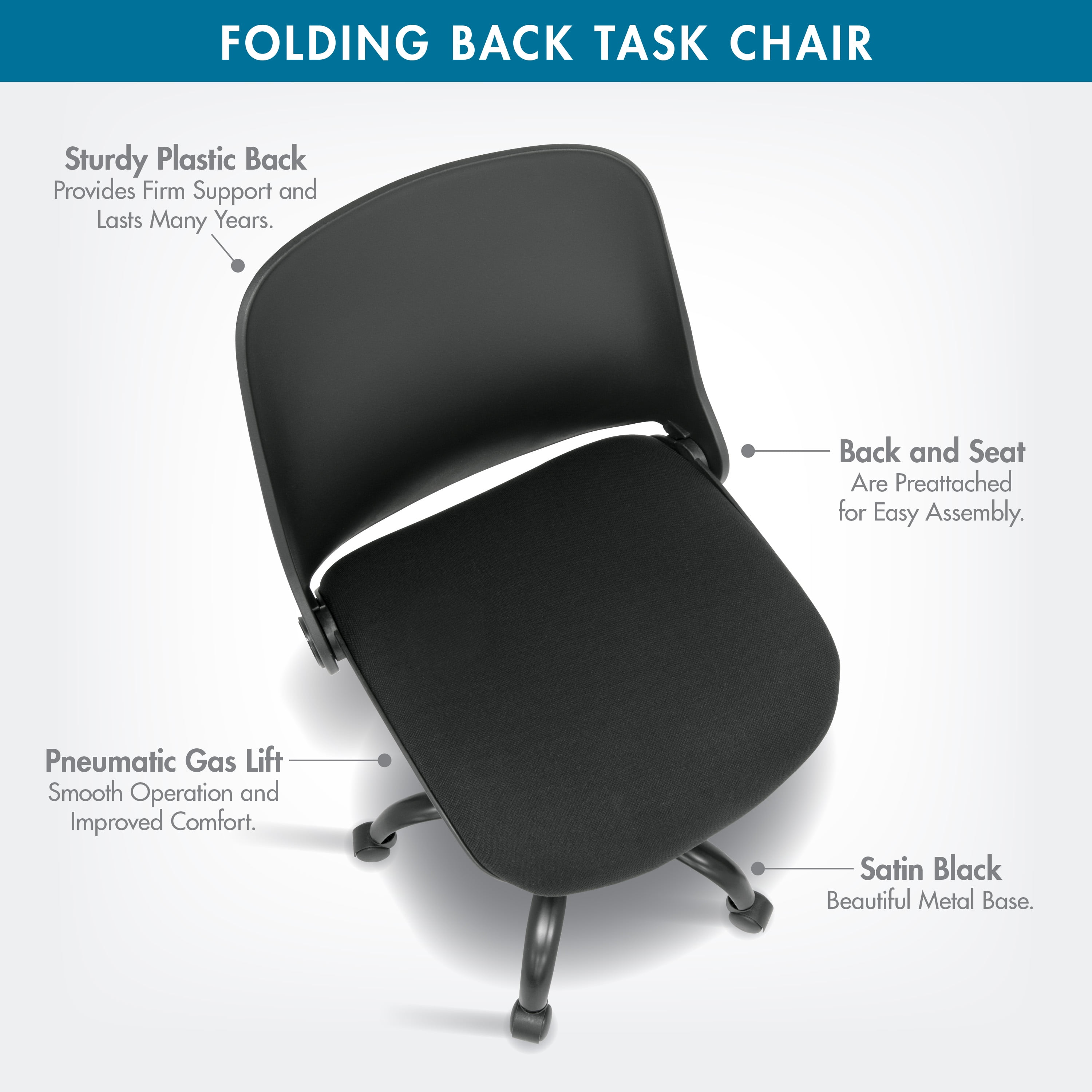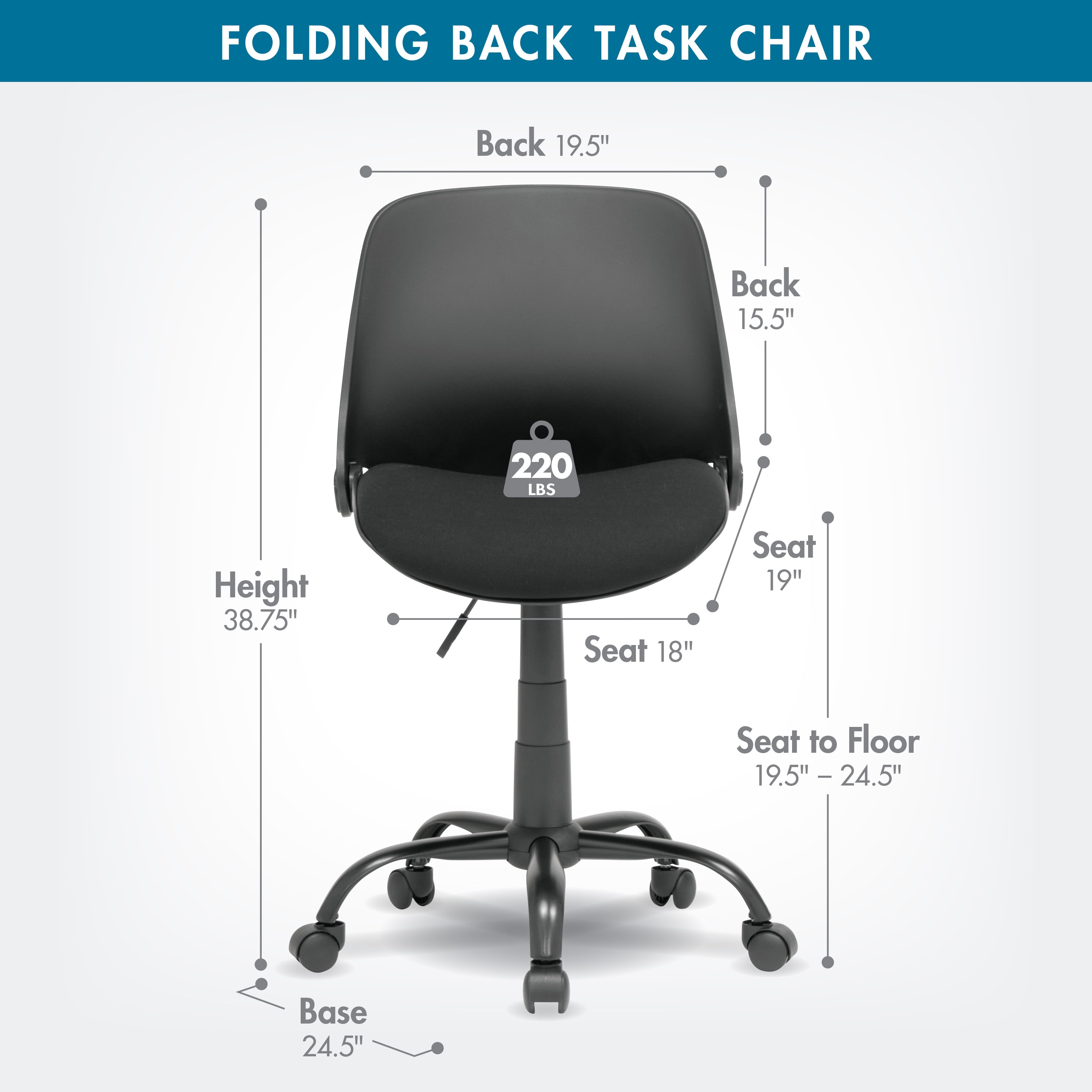 Studio Designs Folding Back Modern Swivel Office Task Chair: Overall Dimensions: 22″ W x 22″ D x 37.5″ Contoured Plastic Back ( 19.5″ W x 15.5″ H) Easily Folds Flat to Store Under Desk and Save Floor Space Full Swivel,-Padded Seat 18″ Wide x 19″ Deep and Height Adjustable 19″ – 24.5″ (Seat to Floor) Durable Metal Base with 2″ Covered Casters That Make it Easy to Move Easy to Assemble- Back and Seat Are Already Attached