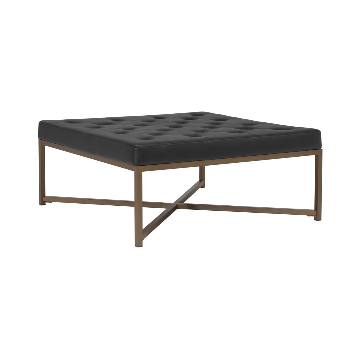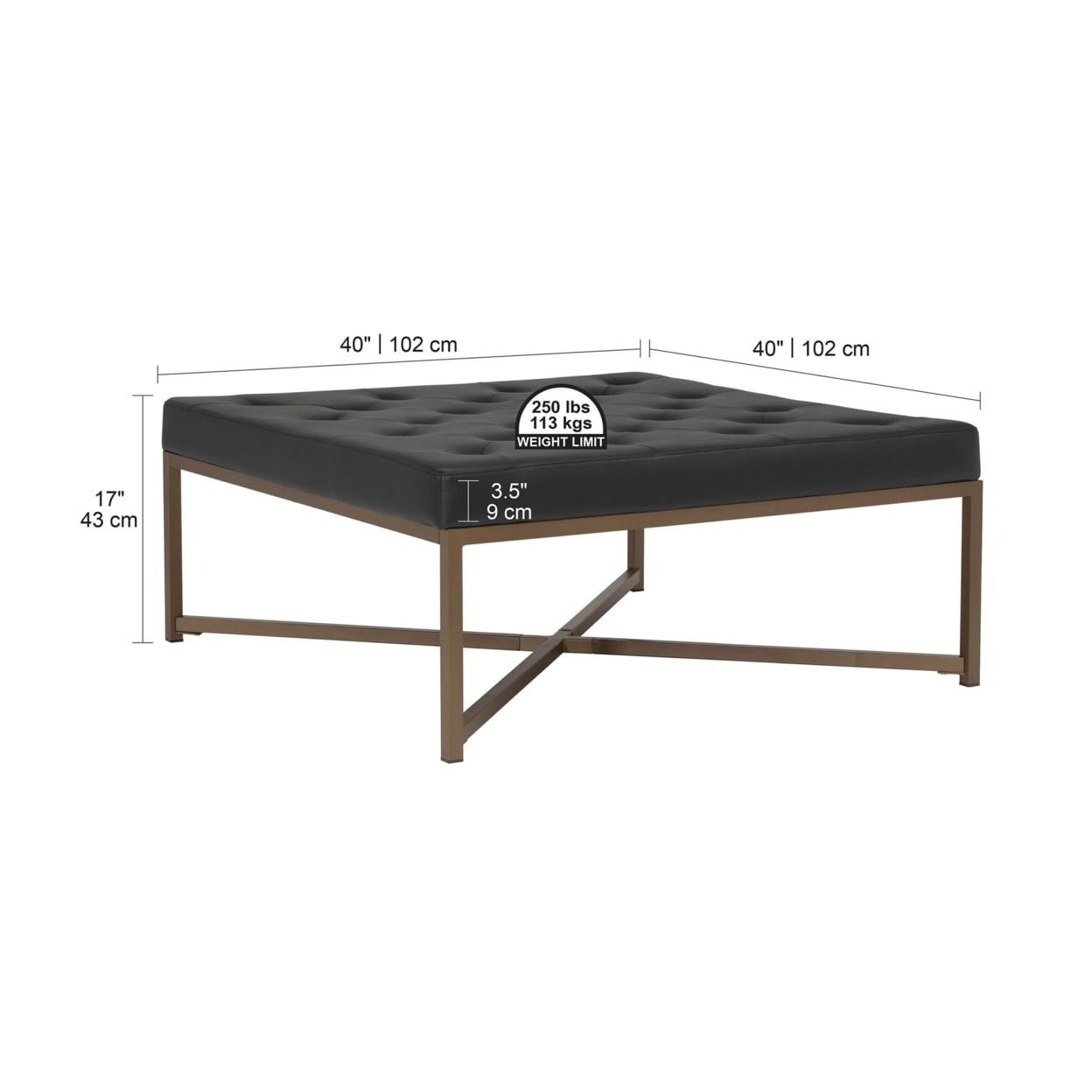 Features Style: Modern/Contemporary Color/Finish: Black/Bronze Bonded leather with tufted cushions Bronze finished metal frame Plastic leg caps prevent scratches Multi-purpose use as ottoman or coffee table Product Specifications Overall Dimensions: 40″ W x 40″ D x 17″ H Seat Dimensions: 40″ W x 40″ D x 3.5″ H Materials: Metal 50%, Foam 20%, Leather 25%, 5% Wood Weight Limit: 250 lbs.