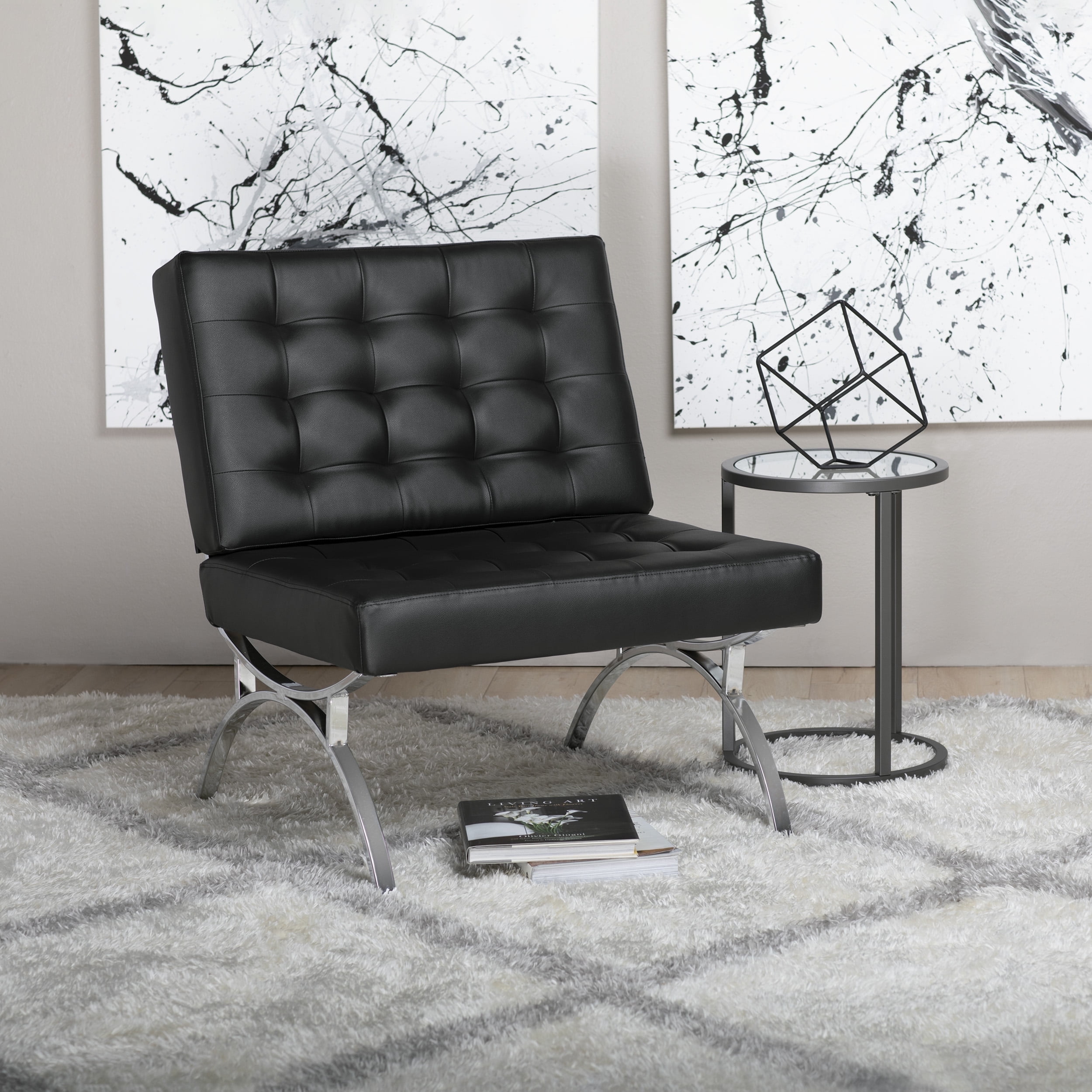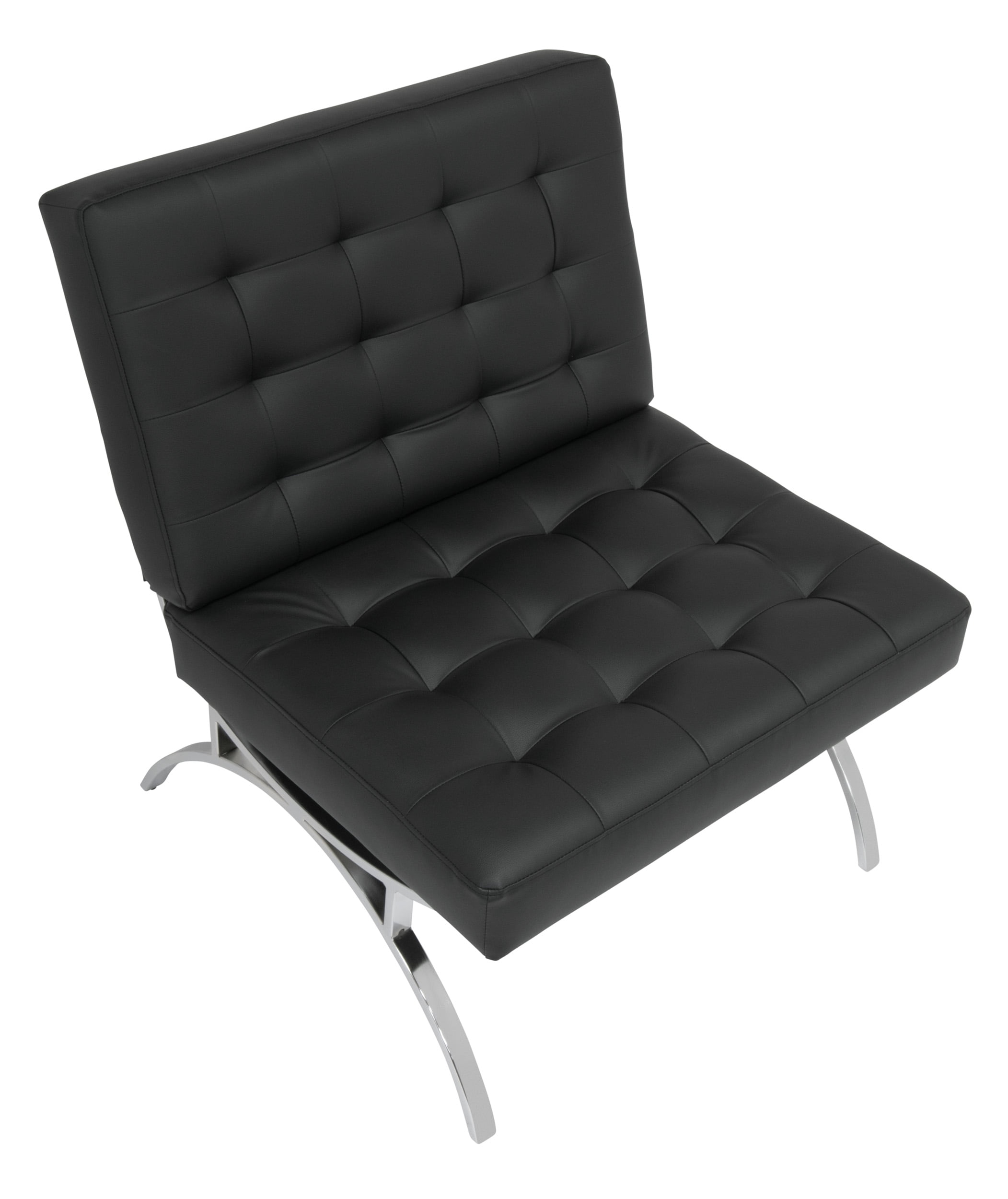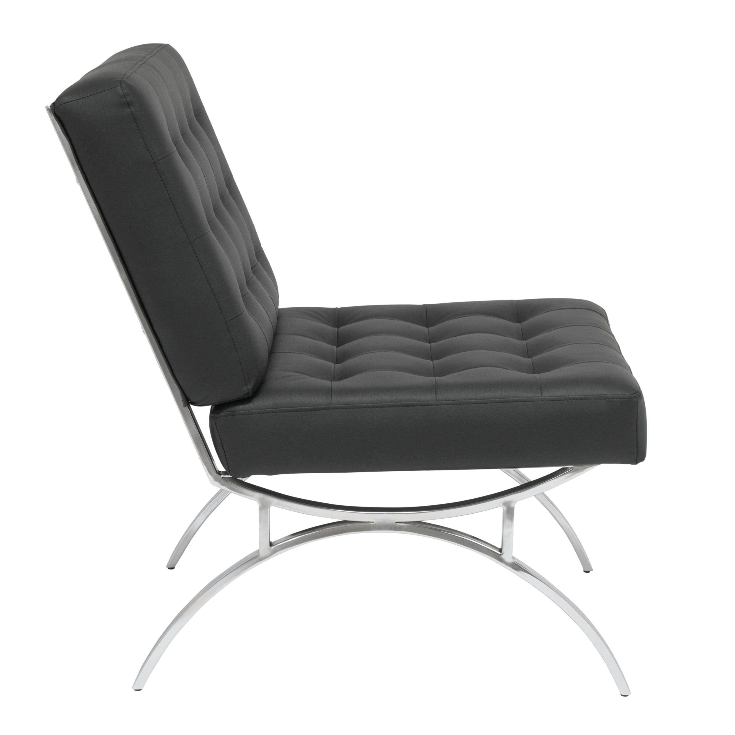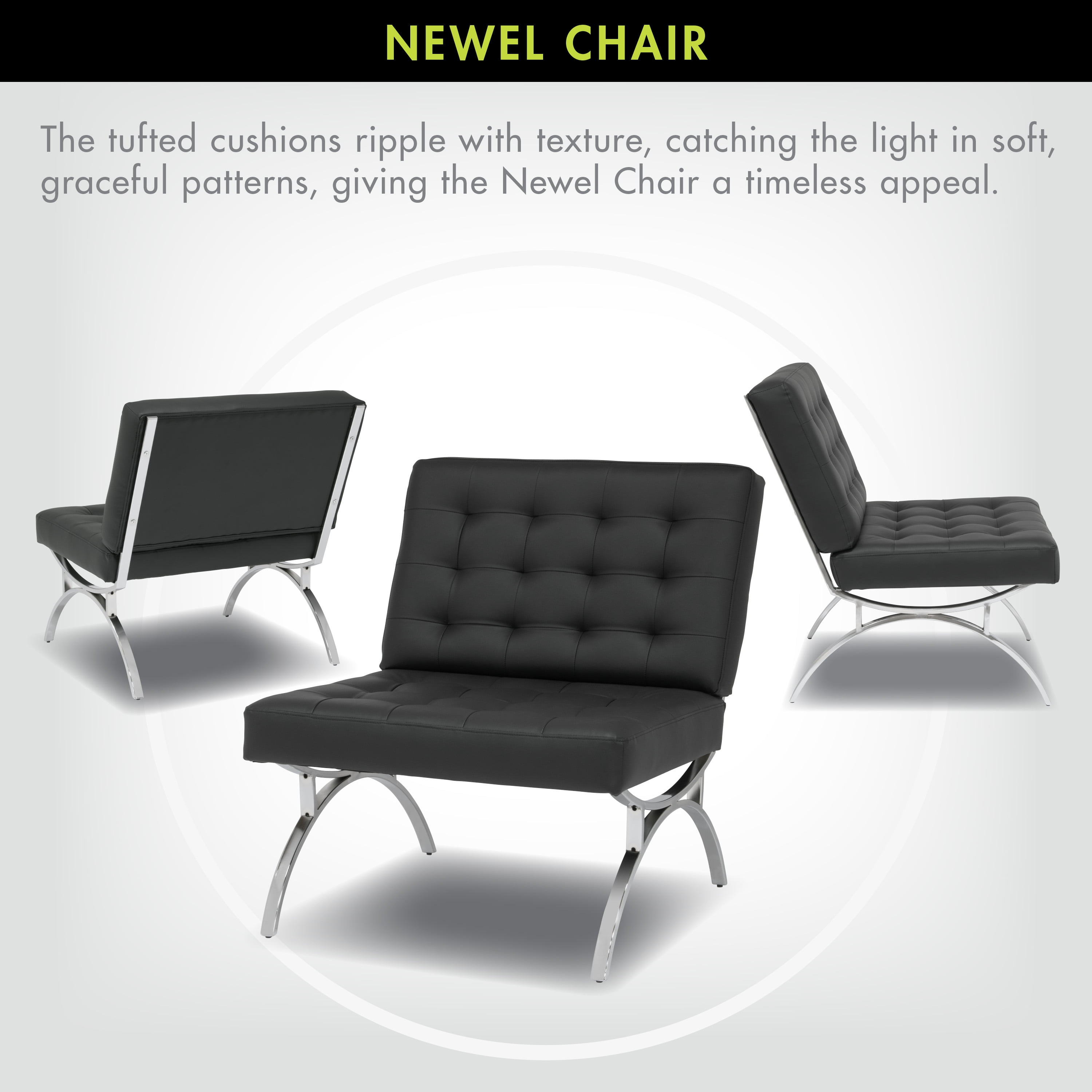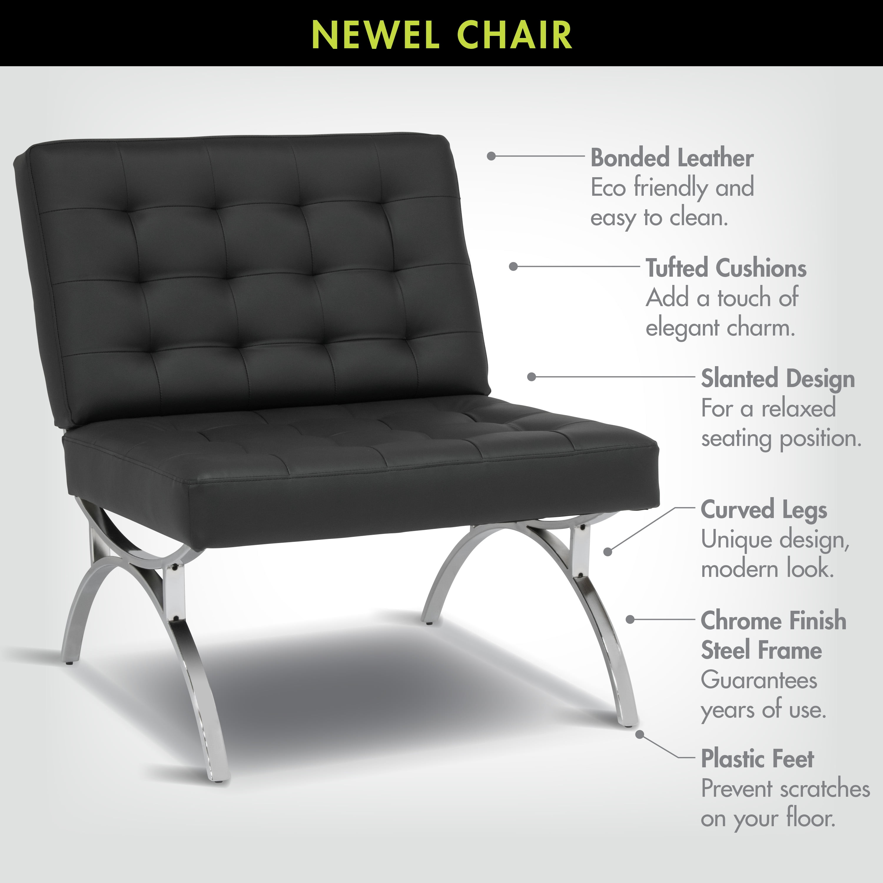 The mid-century-inspired frame and stylish, bonded leather make the Newel Accent Chair by Studio Designs Home the perfect update to your guest seating area. The shipper chair (armless) design with a wide seating area and back makes it comfortable for lounging. The powder-coated frame resists scratches and corrosion. The feet won’t scratch your floor. Modernize your office or living room with this chair and ottoman combination. Ottoman sold separately. Available in Black, Caramel, or White. Features: Color / Finish: Black / Chrome Tufted Cushion with Bonded Leather Materials: Metal 50%, Foam 30%, Bonded Leather 20% Plastic caps on Legs prevent scratches Chrome Finish Steel Frame Specifications: Product Dimensions: 30″ W x 32″ D x 34″ H Back Dimensions: 30″ W x 18″ H Seat Height: 18″ Seat to Floor Seat Dimensions: 30″ W x 20″ D Weight Capacity: 250 Lbs Warranty: 10 Year Manufacturer Warranty