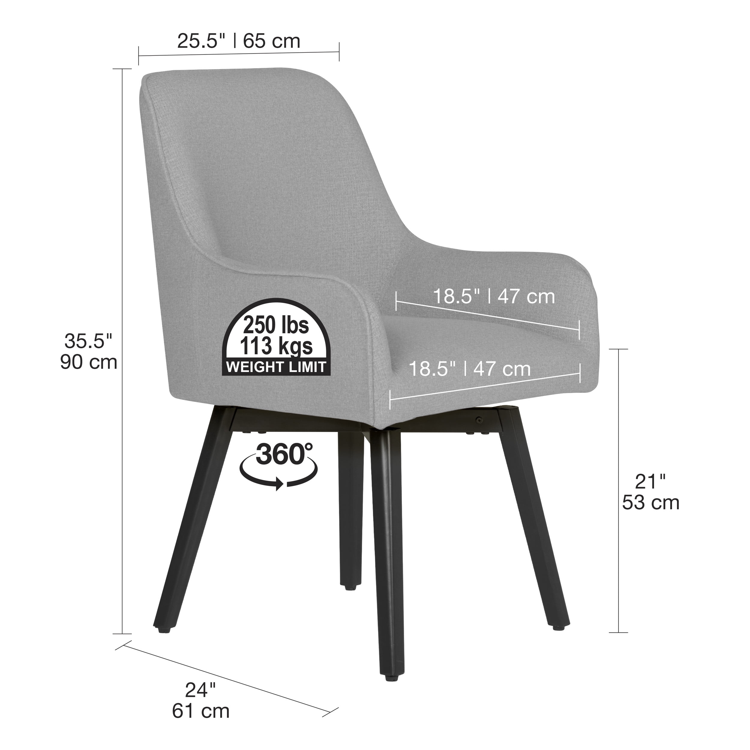 Overall Dimensions:25.5″ W x 24″ D x 35.5″ H SEAT:18.5″ W x 18.5″ D x 21″ seat to floor Easy to Clean 100% Polyester Fabric Metal Legs Have Plastic Feet to Prevent Scratching on Floors Full 360-Degree Swivel Collection:Spire Lux Weight Limit:250 Lbs Product Weight (Lb):23
