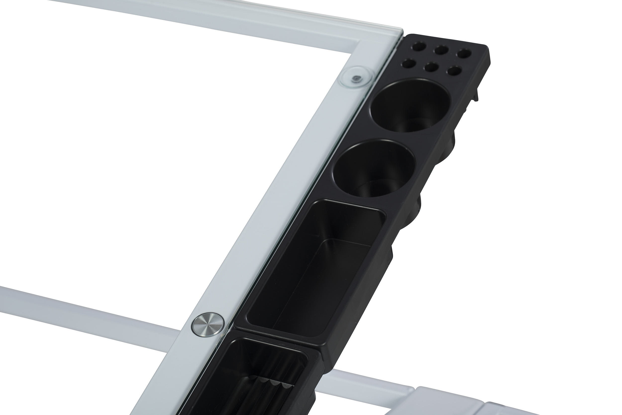 Studio Designs Metal Drafting Table with Folding Top Shelf, White Overall Dimensions: 50.25″W x 23.75″D x 31.5″H Main Work Surface: 35.5″W x 23.75″D Tempered safety glass top and shelf for enhanced durability Versatile design can be used as a light table Top angle adjustment from flat to 35 degrees for customizable use Four removable side trays for convenient supply storage Folding side shelf can be placed on either side, measuring 9.5″W x 23.75″D
