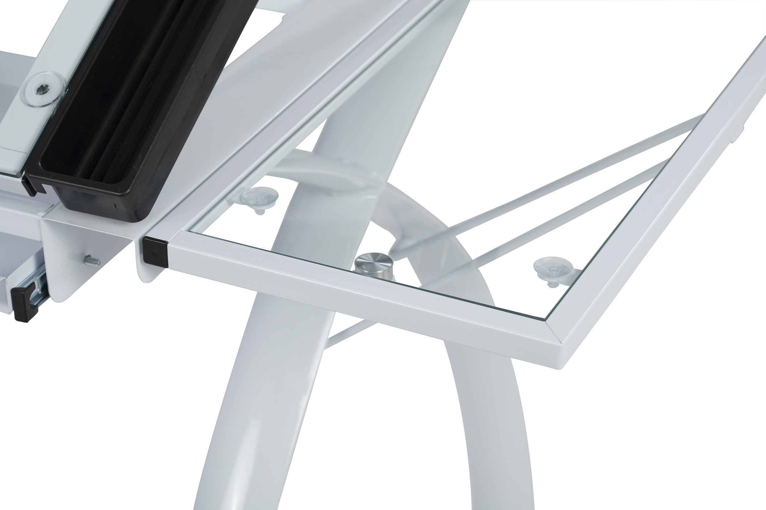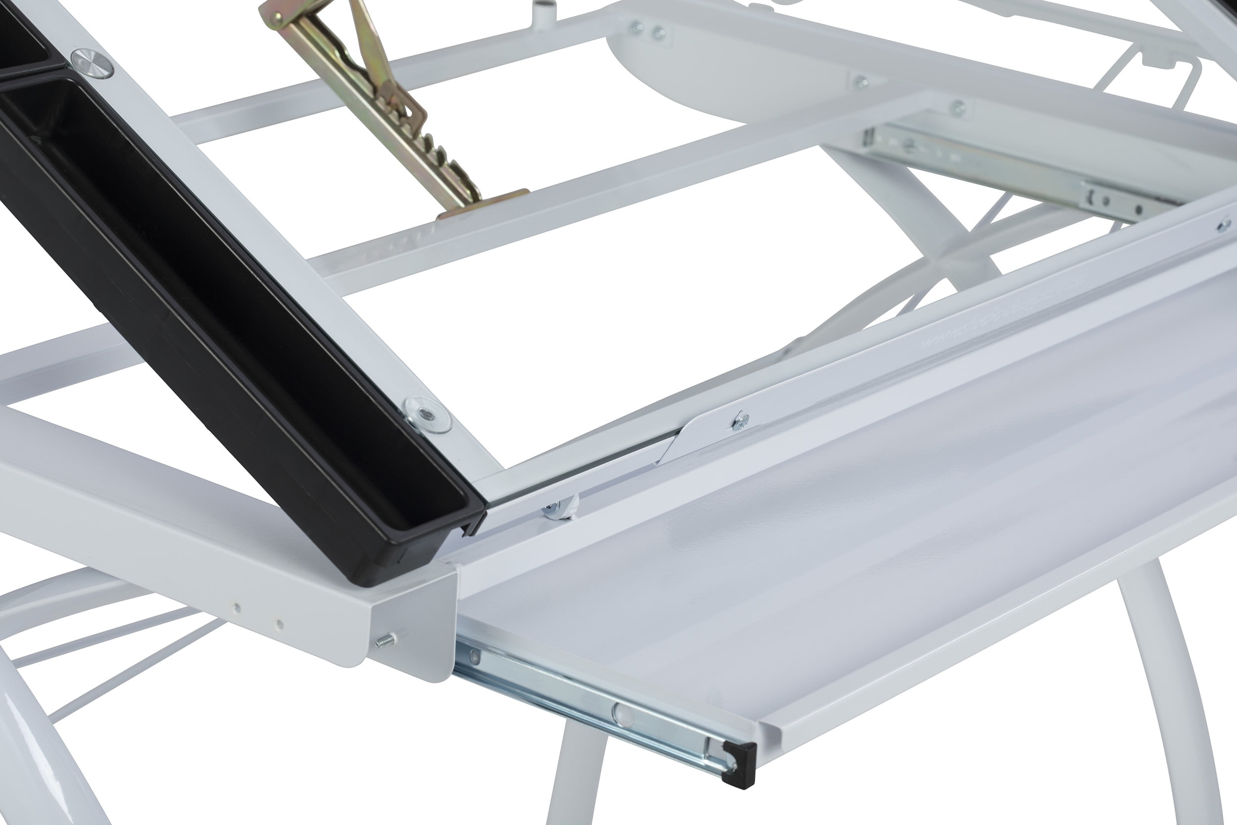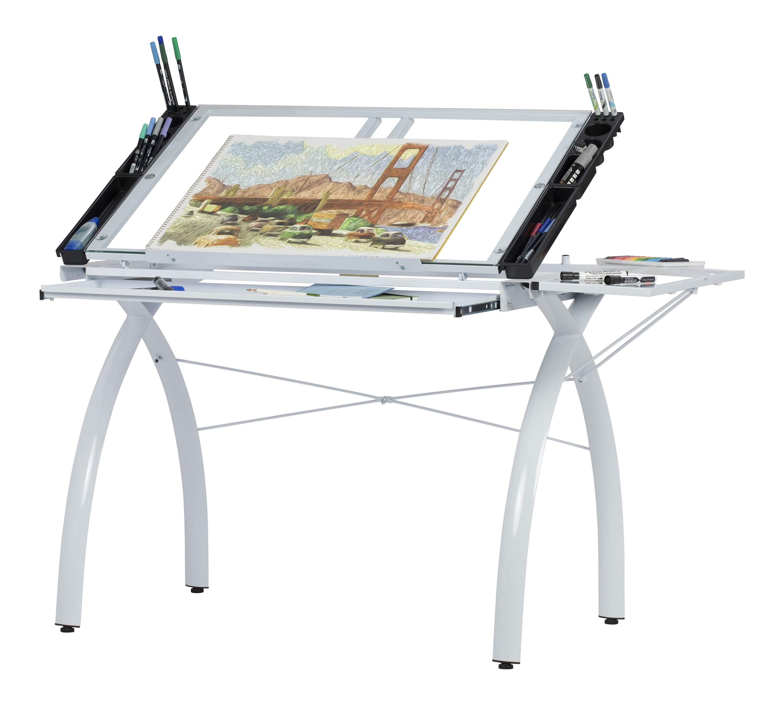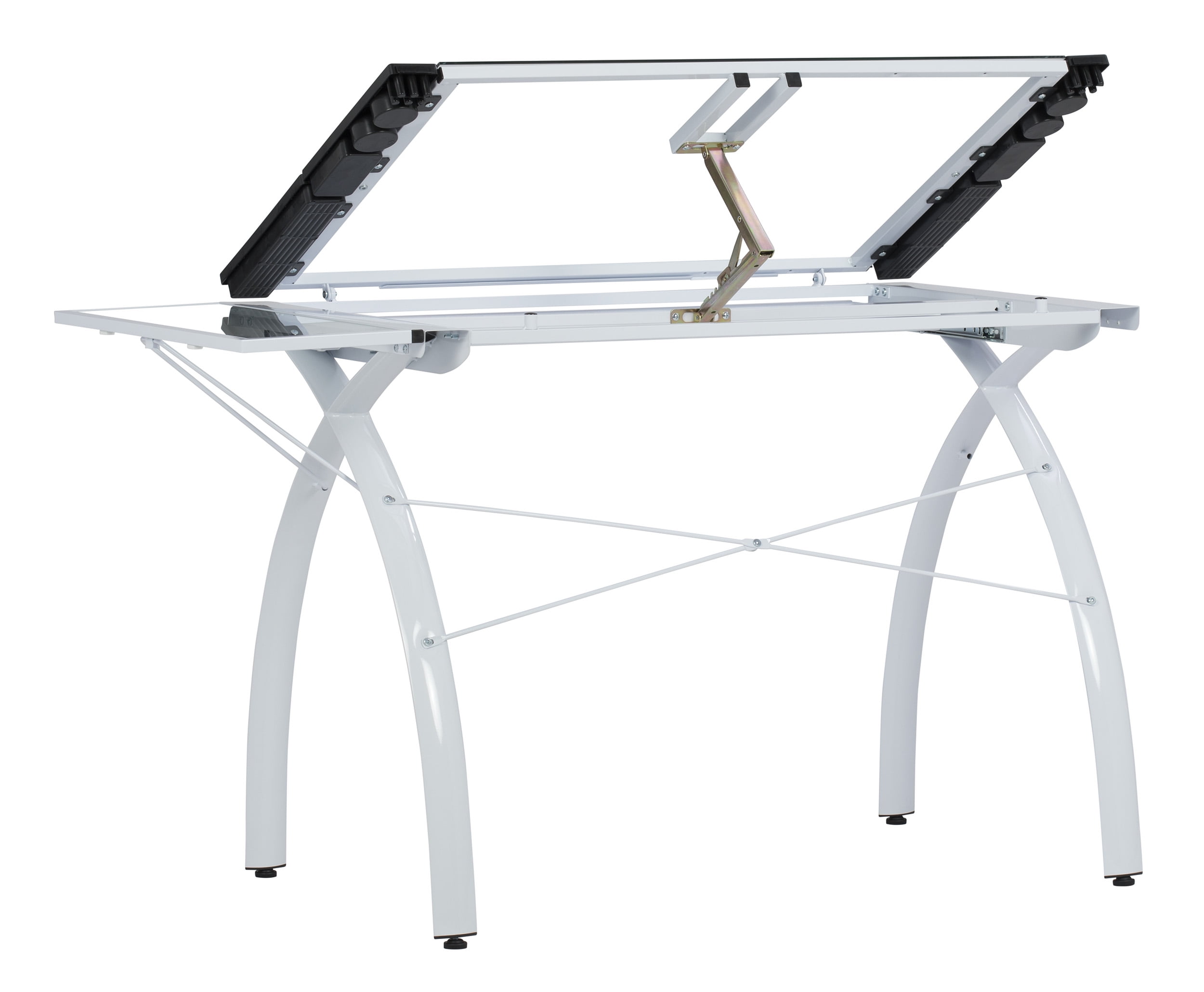 The perfect multi-functional contemporary table: Studio Designs’ Futura Craft Station with Folding Shelf is great for drafting, drawing, or crafting on its large tempered safety-glass work surface. Its main work surface consists of a glass top that can also be used as a light table, and can adjust . It also includes a flip up side shelf for that additional flat workspace. Other features include a large pencil drawer, and removable side trays for supplies. A pencil ledge slides up and locks into place if you’d rather keep pens, pencils, or brushes on the table top. Constructed of heavy gauge, powder-coated steel for durability and floor levelers for stability.