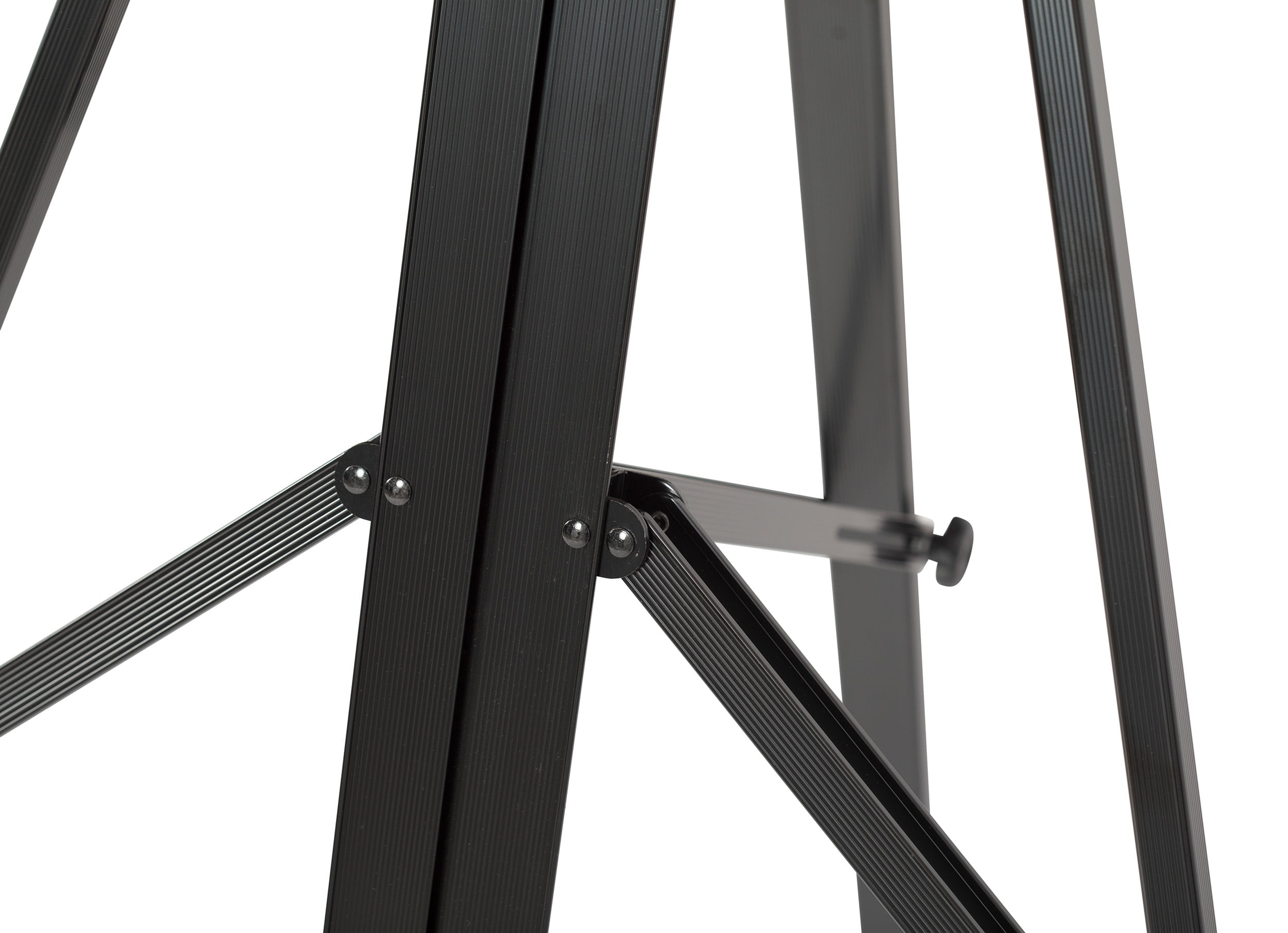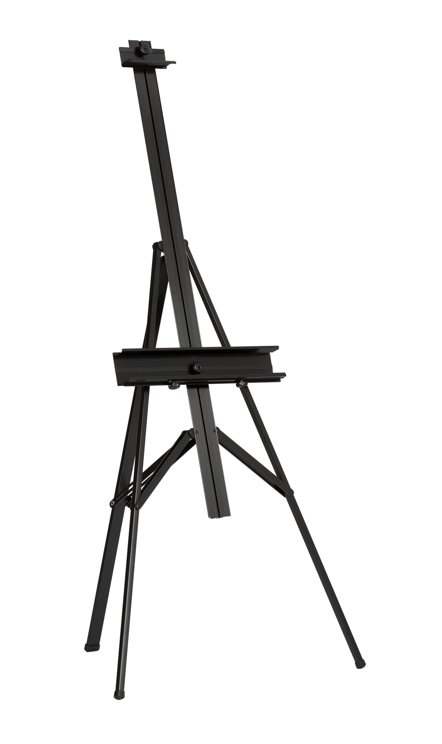 The Studio Designs easel is ideal for holding large canvases or signage in art galleries and trade shows. Built from quality aluminum, this painting easel provides durability and stability. Its lightweight make ensures easy carriage and transportation. The adjustable tilt and height of this black easel offers convenient usage. Its foldaway design allows easy storage. This easel can hold up to 1.5-inch thick gallery canvases up to a height of 46.5 inches. It comes with a built-in metal frame pallet holder to offer added assistance. 56.25 in x 41 in x 27 in