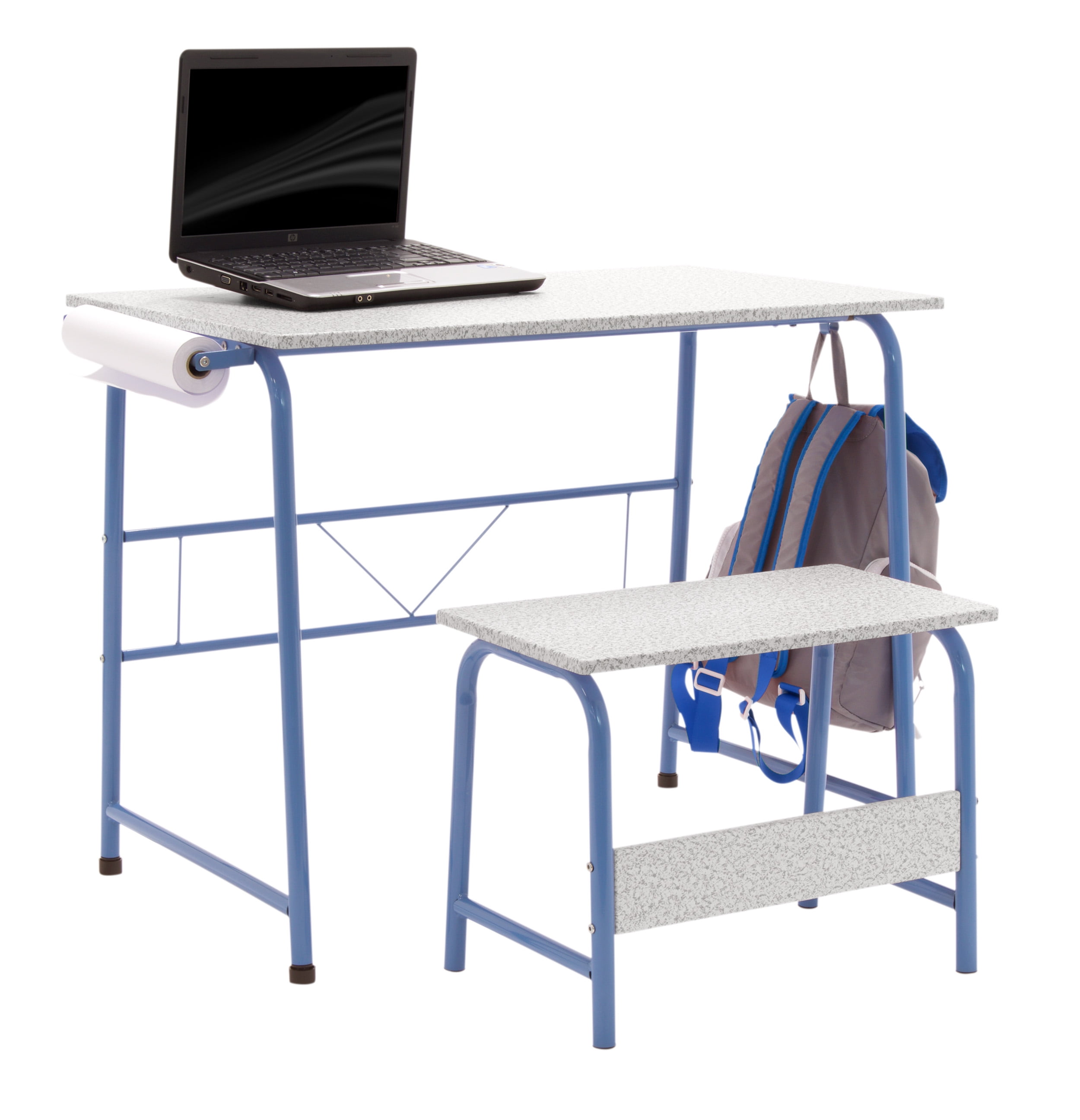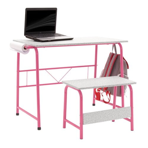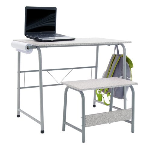Studio Designs Project Center 2-Piece Metal Art Desk and Bench, Gray • Desk Dimensions: 37.75″ W x 21.75″ D x 28″ H • Top Dimensions: 35.5″ W x 21.75″ D • Bench Dimensions: 21.5″ W x 12″ D x 16″ H • Includes One Paper Roll: 12″ W • Powder Coated Steel Frame for Durability • Rear Crossbar for Rigidity • Two Hooks to Hang Bags or Jackets • Four Floor Levelers for Stability • Can be Used as a Homework Desk or Art Station • Weight Limit: Top 50 lbs | Bench: 150 lbs