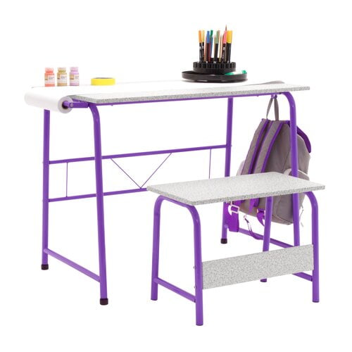 The Project Center by Studio Designs combines an art/learning table with bench. The sturdy, steel legs and thick tabletop make it durable. The 5/8 inch thick laminate top is easy to clean and is rounded for safety. The large 35.5 inch x 22.5 inch tabletop provides plenty of space for supplies. A paper roll is included so you can run craft paper across the tabletop creating a simple canvas for artwork. You can use pencils, crayons or watercolors on your craft paper and easily wipe clean any accidents off the top. Replacement paper rolls are also available through Studio Designs (Item# 13208). Two hooks on the side of the table provide a secure spot for backpacks or bags. Available in a variety of finishes: Pink/Spatter Grey (Item# 55125), Blue/Spatter Grey (Item# 55126), Purple/Spatter Grey (Item# 55127) and Grey/Spatter Grey (Item# 55128).