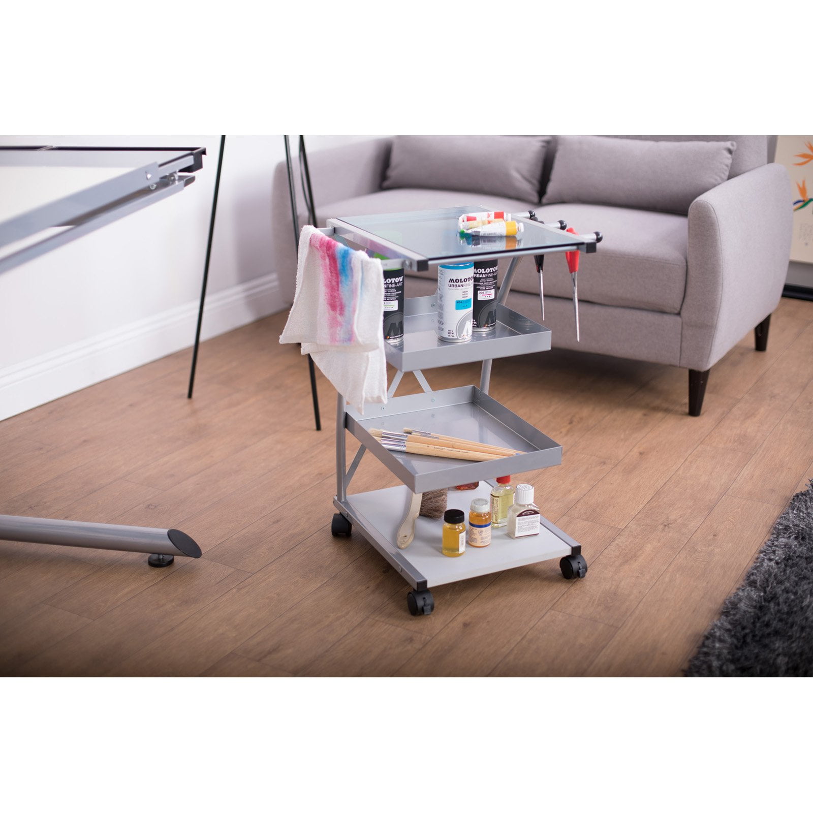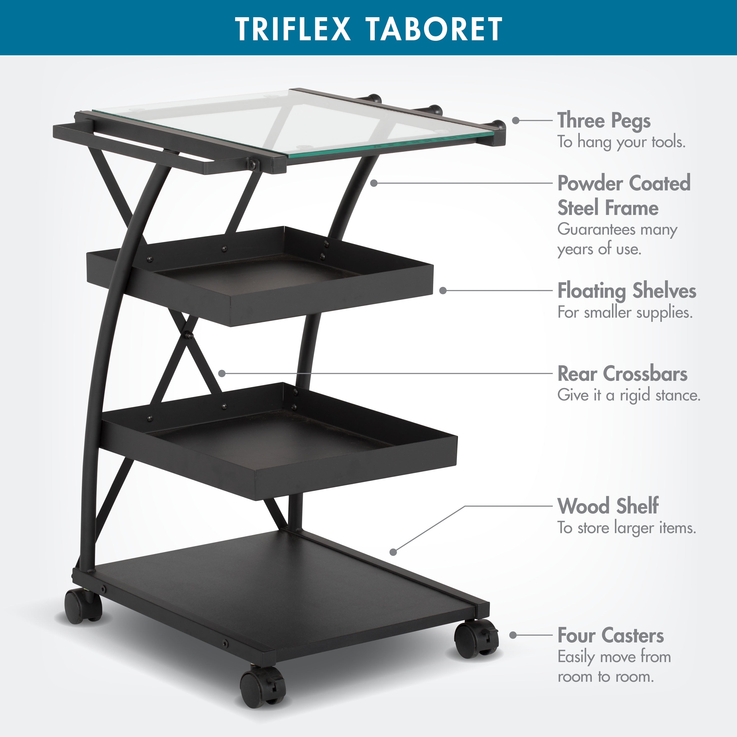 The triflex taboret by Studio Designs features various storage options for your art tools. The top glass shelf is easy to clean and allows you to see the items below. The two middle shelves feature a 1.5 inch tall side walls to keep items from rolling off while moving the taboret. The bottom shelf is made of durable laminate to handle heavier items. The sides of the top shelf have 3 pegs for hanging supplies or a towel bar for added versatility. The Casters on this storage unit allow your art supplies to follow you and your art projects from room to room.