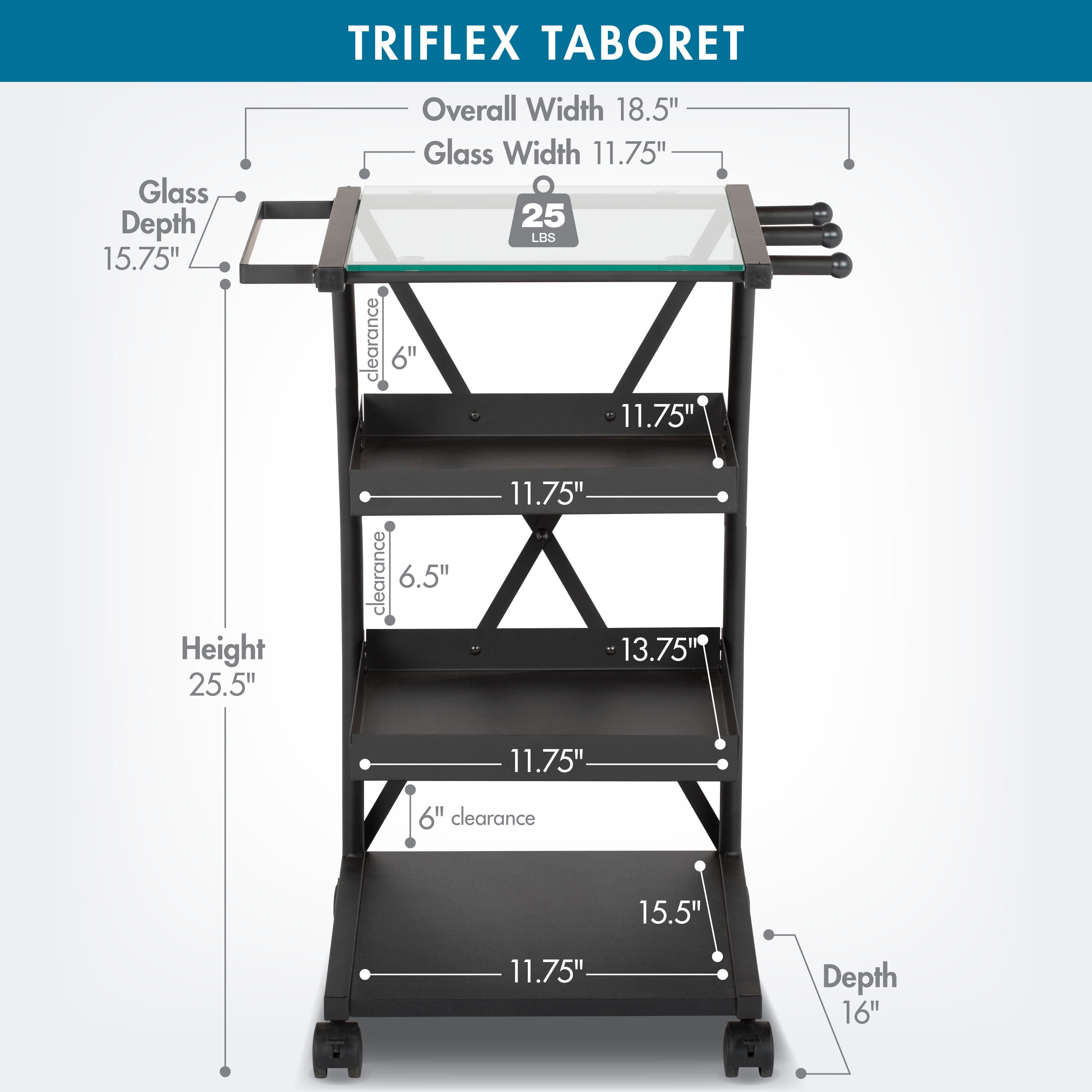 Trifles 4 Shelf Mobile Organizer Cart Overall Dimensions: 18.5″ W x 16″ D x 25.5″ H Rear Crossbar for Stability Powder Coated Steel Frame for Durability Four Casters for Mobility with Two Locking Glass Shelf: 11.75″ W x 15.75″ D Second Shelf: 11.75″ W x 11.75″ D. Top Handle for Easy Movement. Third Shelf: 11.75″ W x 13.75″ D. Three Pegs to Hang Supplies Bottom Shelf: 11.75″ W x 15.5″ D Assembly Required