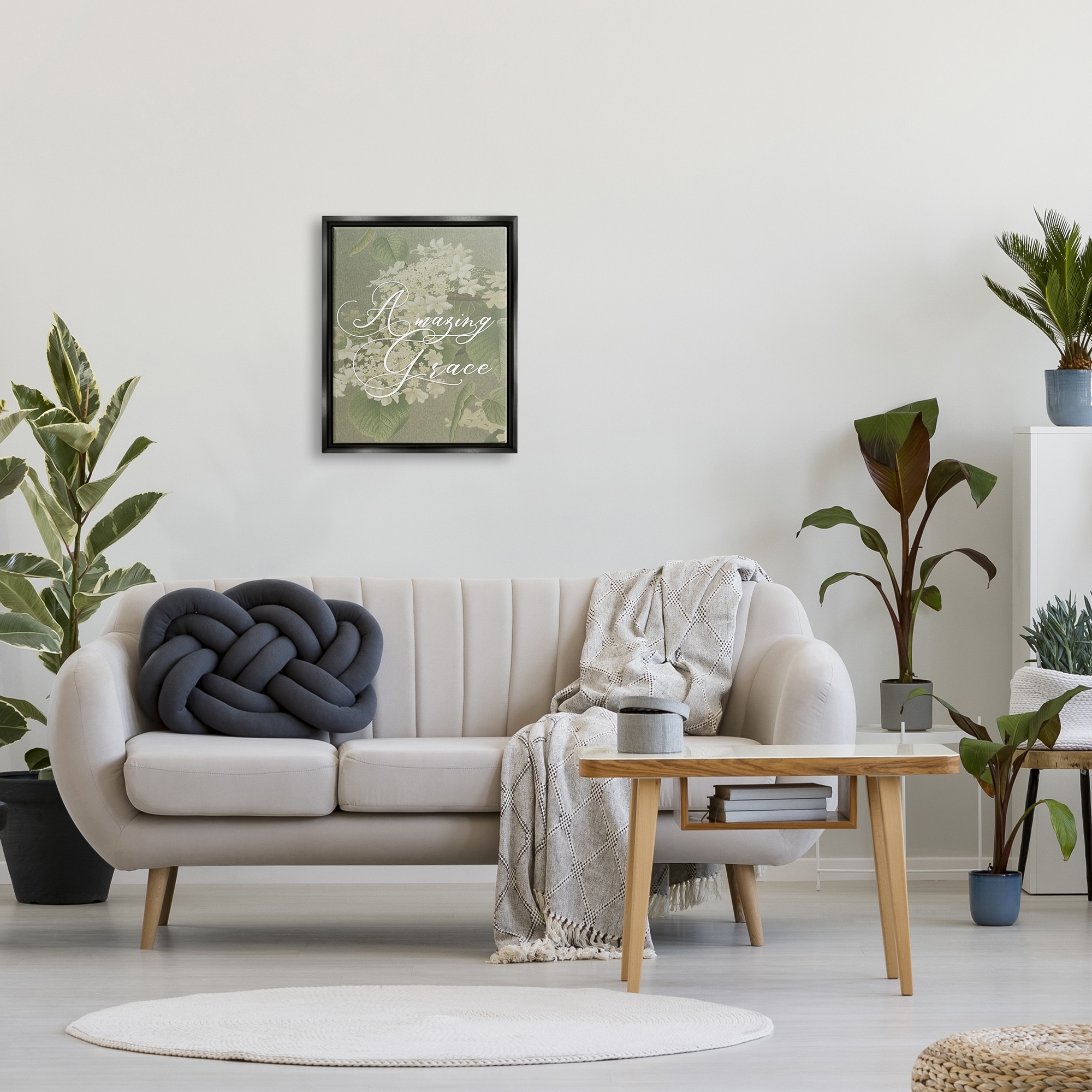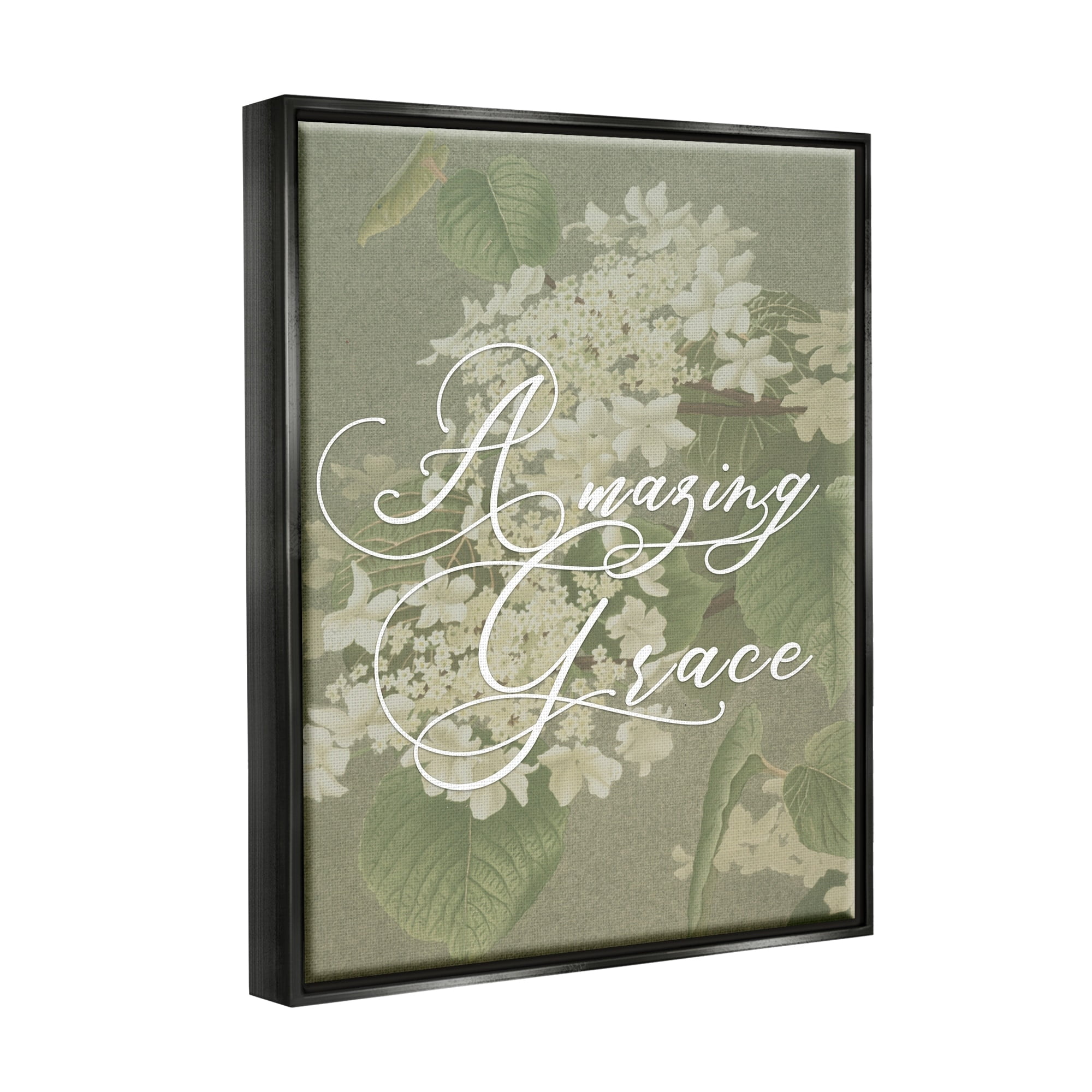 Stupell Industries Amazing Grace Phrase Vintage White Flower Blossoms Jet Black Framed Floating Canvas Wall Art, 16×20, by Daphne Polselli