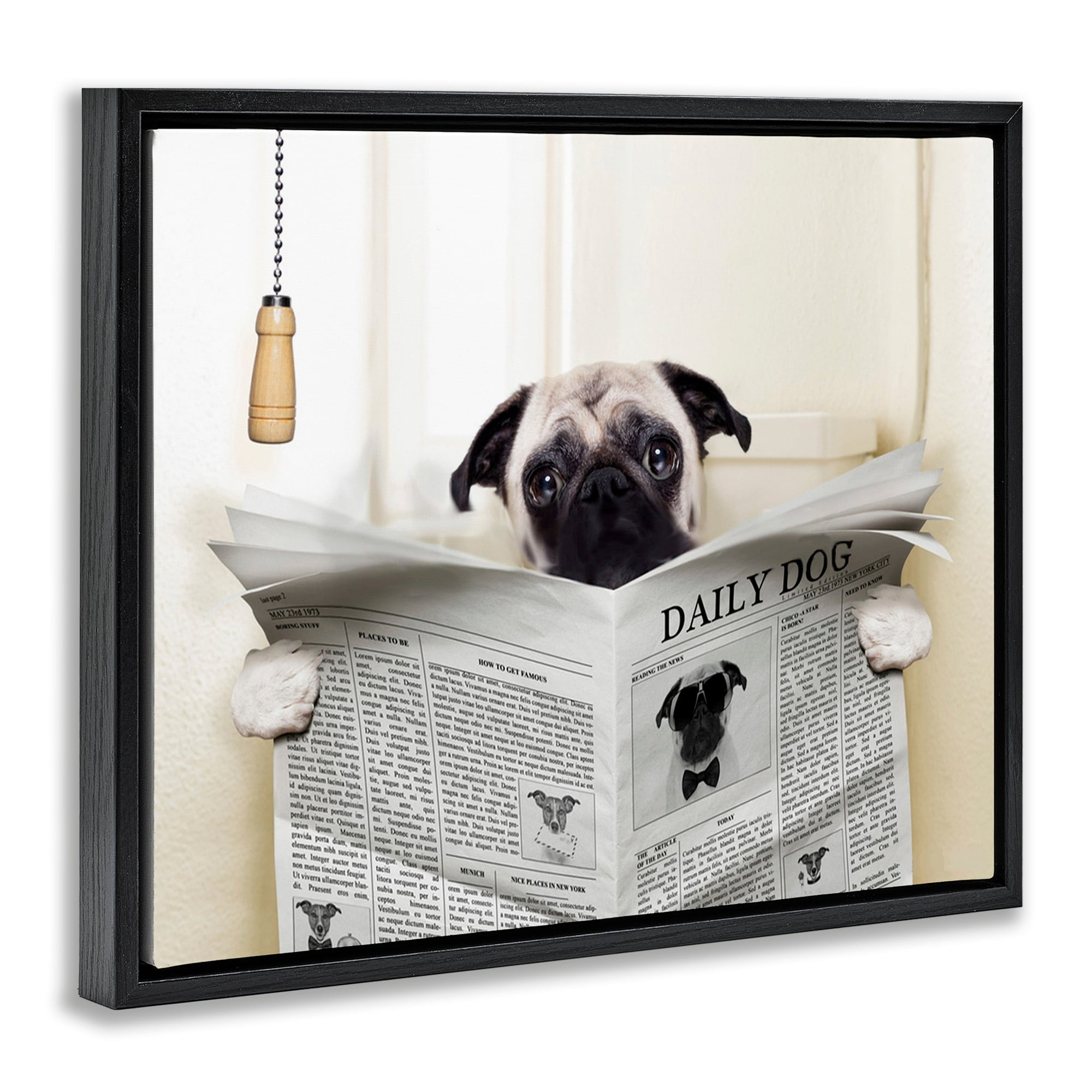 Dimensions: 21 x 1.7 x 17 Frame, 20 x 1.5 x 16 Canvas Art Floating Frame Canvas Products are available in sizes 21″x17″ and 31″x25″. All Floating Frame Canvas Products have a 1.7″ Depth. Wall Art is Ready to Hang with Hardware Free Hanging. No Installation required. For Easy Set Up Lean or Layer Artwork on Shelf or Against Wall. Artwork is Permently Fixed into the Frame. Our elevated 1.7″ Thick Floating Frame is the perfect complement to our canvas style Wall Art. We use only the highest quality inks in house with industry leading printing solutions. Canvas is hand stretched over a durable wood foundation and then mounted securly into a Modern Box Frame. Artwork Relates To: Animal, Pet, Dog, Pug, Bathroom, Humor, Newspaper Design by In House Artist