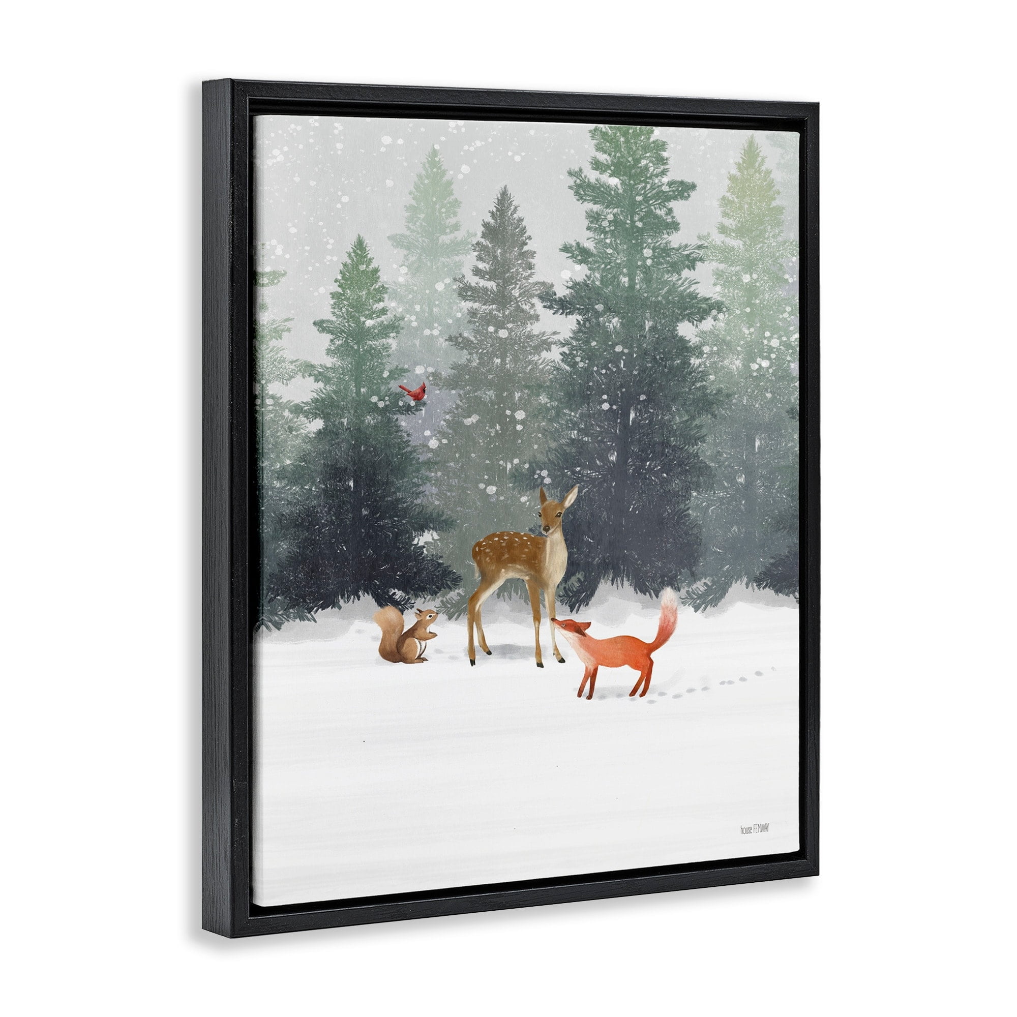 Stupell Industries Winter Season Forest Animals Fox Deer Squirrel Jet Black Framed Floating Canvas Wall Art, 16×20, by House Fenway
