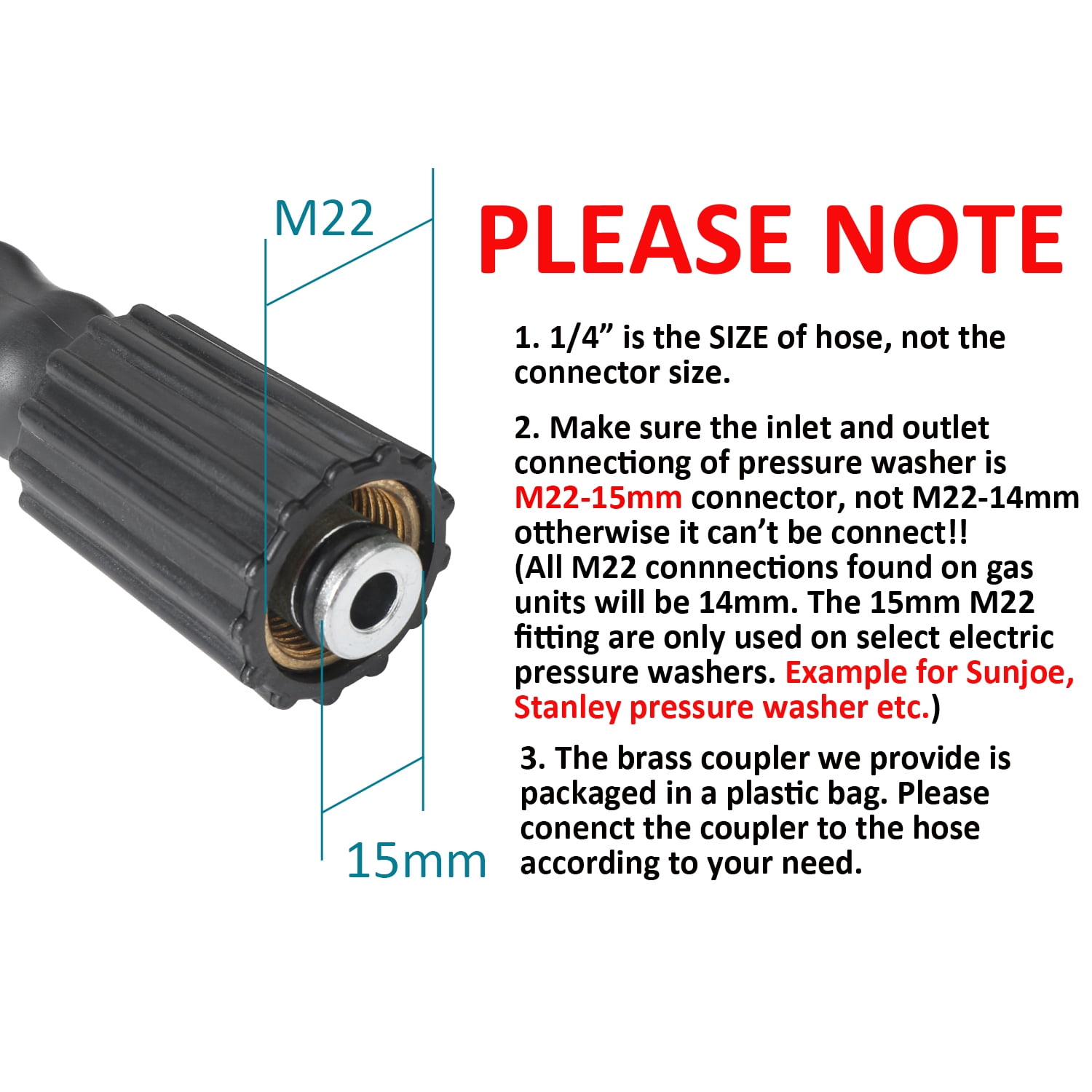 COMPATIBLE WITH SUN JOE PRESSURE WASHER PART NUMBERS – Work for SPX-25H, SPX-25HD, SPX3000-33 | DOES NOT FIT SPX 1500 or 1501 pressure washer models WORKS WITH HOT WATER UP TO 212°F – This pressure washer hose is designed for hot and cold water, being capable of temperatures up to 212°F. Hot water is more effective than cold water at tackling grease, oils and stubborn stains. This feature makes the hose an effective and solid choice for household & commercial pressure washing during all seasons. ENTIRE RUBBER CONSTRUCTION WITH A LAYER OF STEEL-WIRE BRAID IN THE MIDDLE – This upgraded pressure washer hose is made from high-tensile braided steel wrapped in rubber for the ultimate durability. It is solid while also flexible. The combination of high-quality materials and high-tech craftsmanship brings excellent oil resistance, aging resistance, abrasion resistance, and heat resistance. 50 FEET IN LENGTH AND 1/4 INCH IN DIAMETER – This pressure washer hose is 25 feet long and can withstand a maximum pressure of 2900psi, which is strong enough to effectively meeting most cleaning tasks. The inner diameter of the hose is 1/4 inch, providing you with smooth water flow. UNIVERSAL M22-15MM THREAD AND A COUPLER FOR EXTENSION – This hose features with standard double M22-15mm female thread, and it can be easily and quickly connected to most high pressure washers and guns. It also comes with a brass M22-15mm adapter for hose extension. KINK RESISTANT POWER WASHER HOSE – This heavy-duty pressure washer hose is set out to avoid the frustration of kinks in the hose in the middle of washing. It is anti-kink and long-lasting, easy to carry, drag, roll up and store. Warm Tips: please roll the hose all the way out before first use, and then it will be easy to coil and uncoil for each use without kinking.