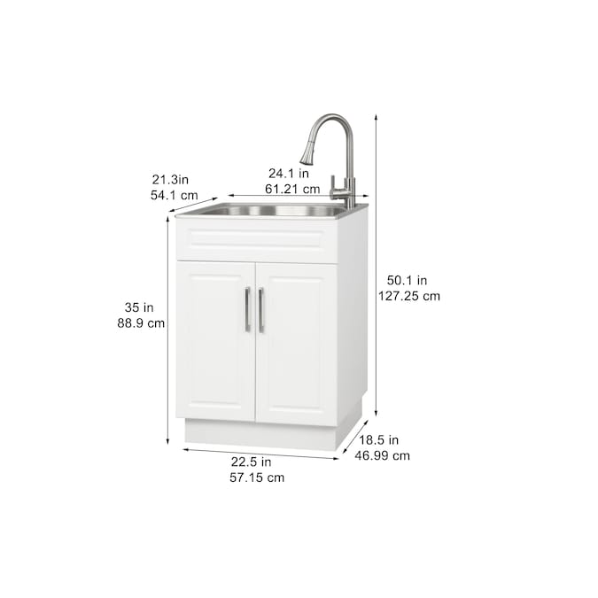 - 21.4in x24.1in x34.5in Utility Tub will fit small space; 1-year limited warranty.