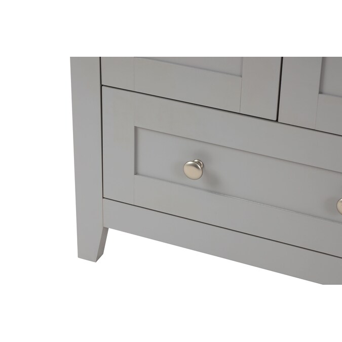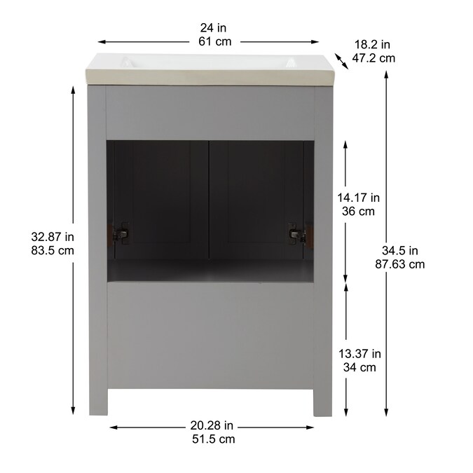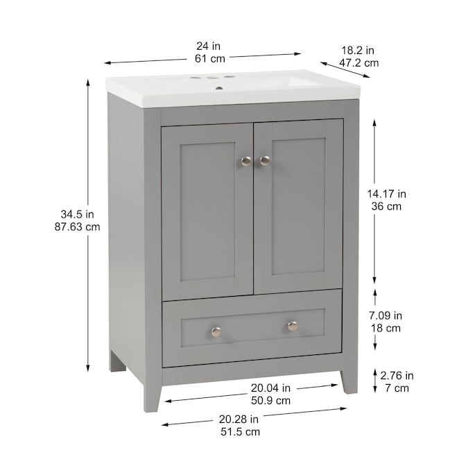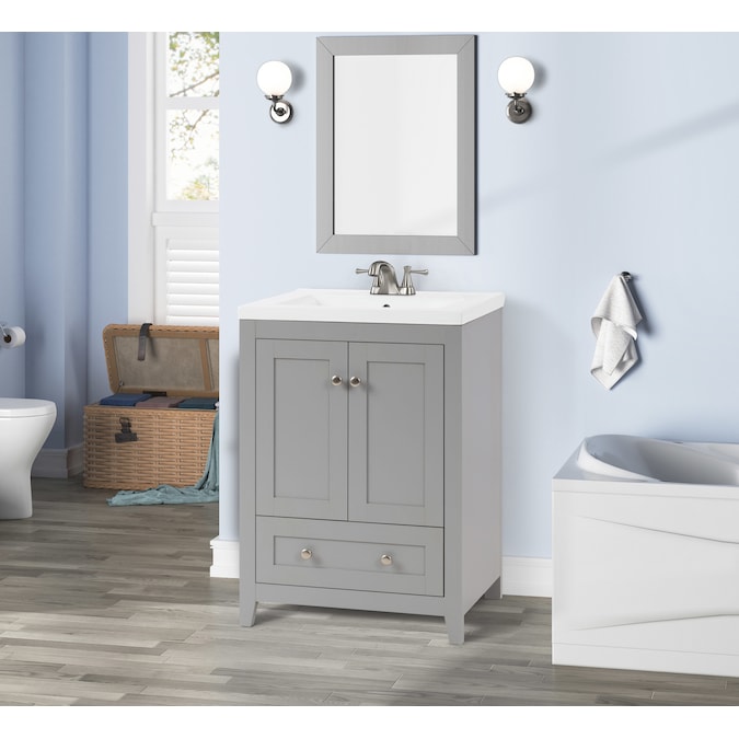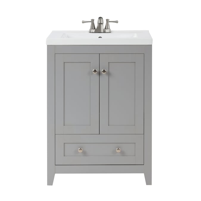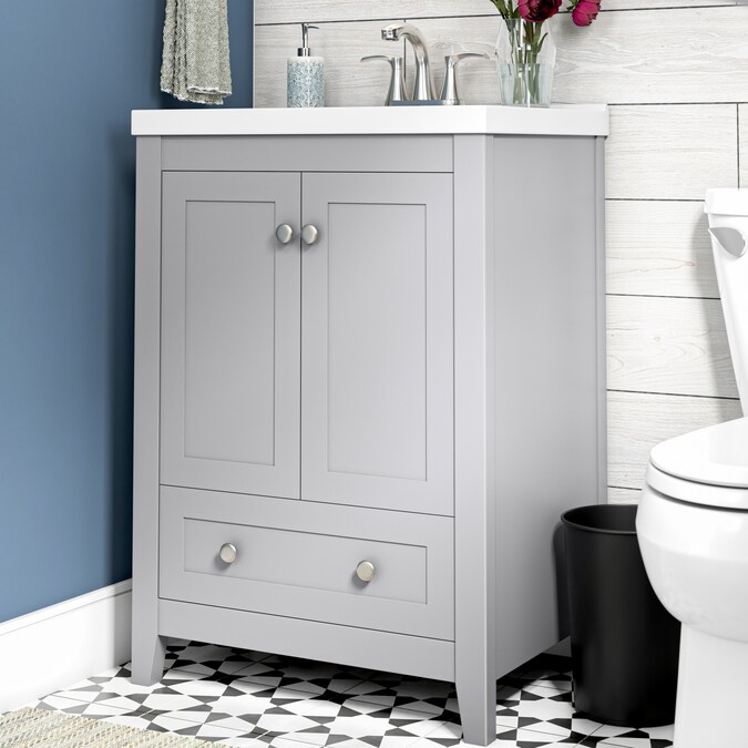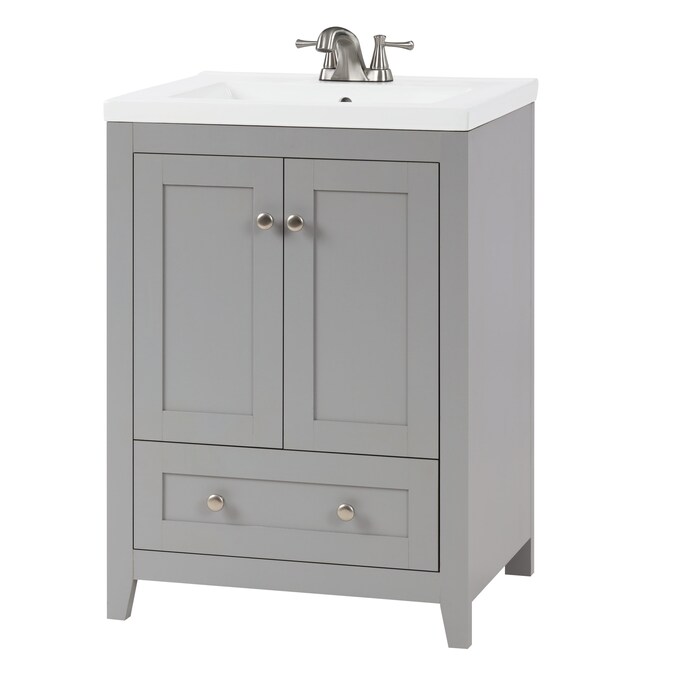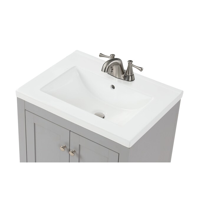 24-In gray single sink bathroom vanity with thicker porcelain top will be perfect for small space.