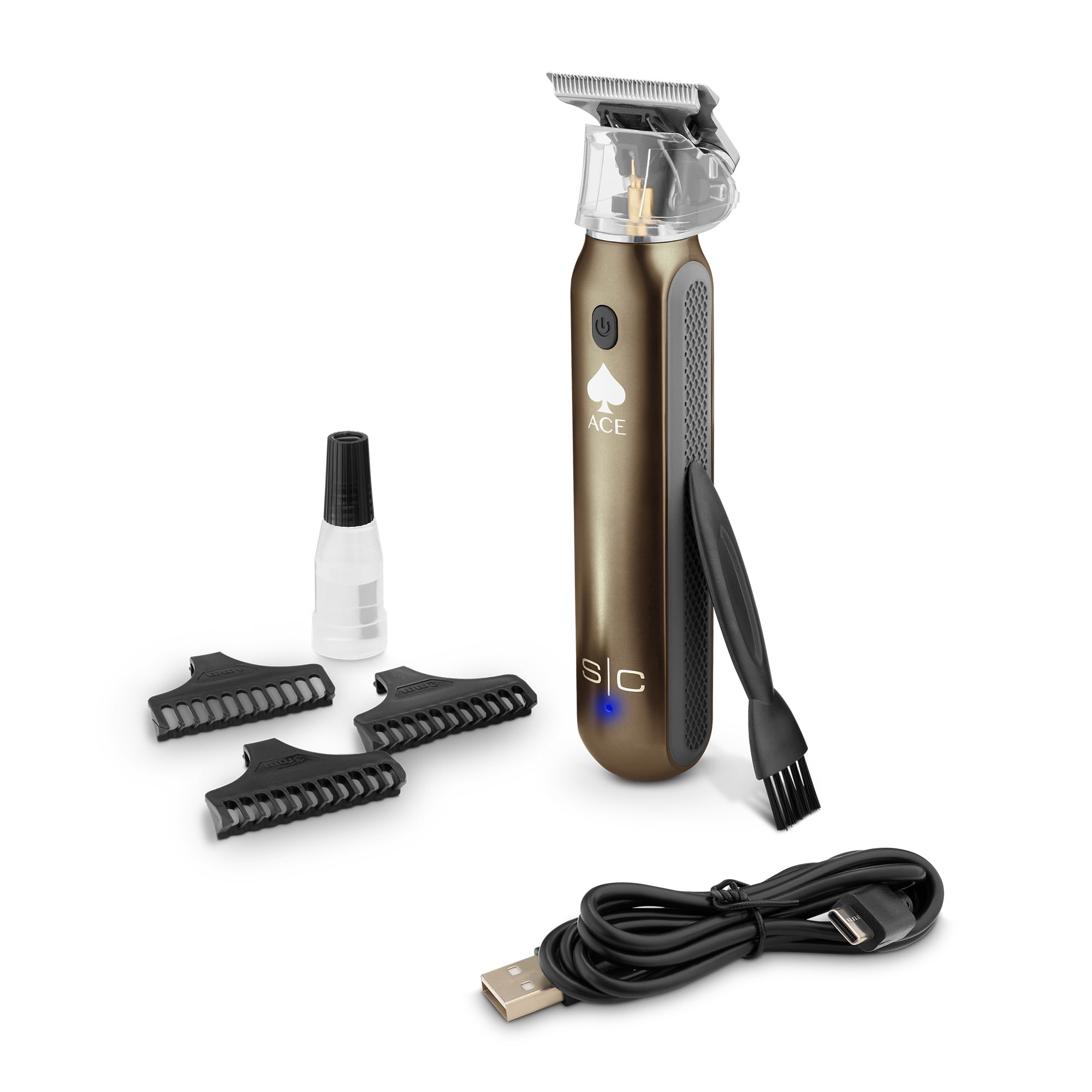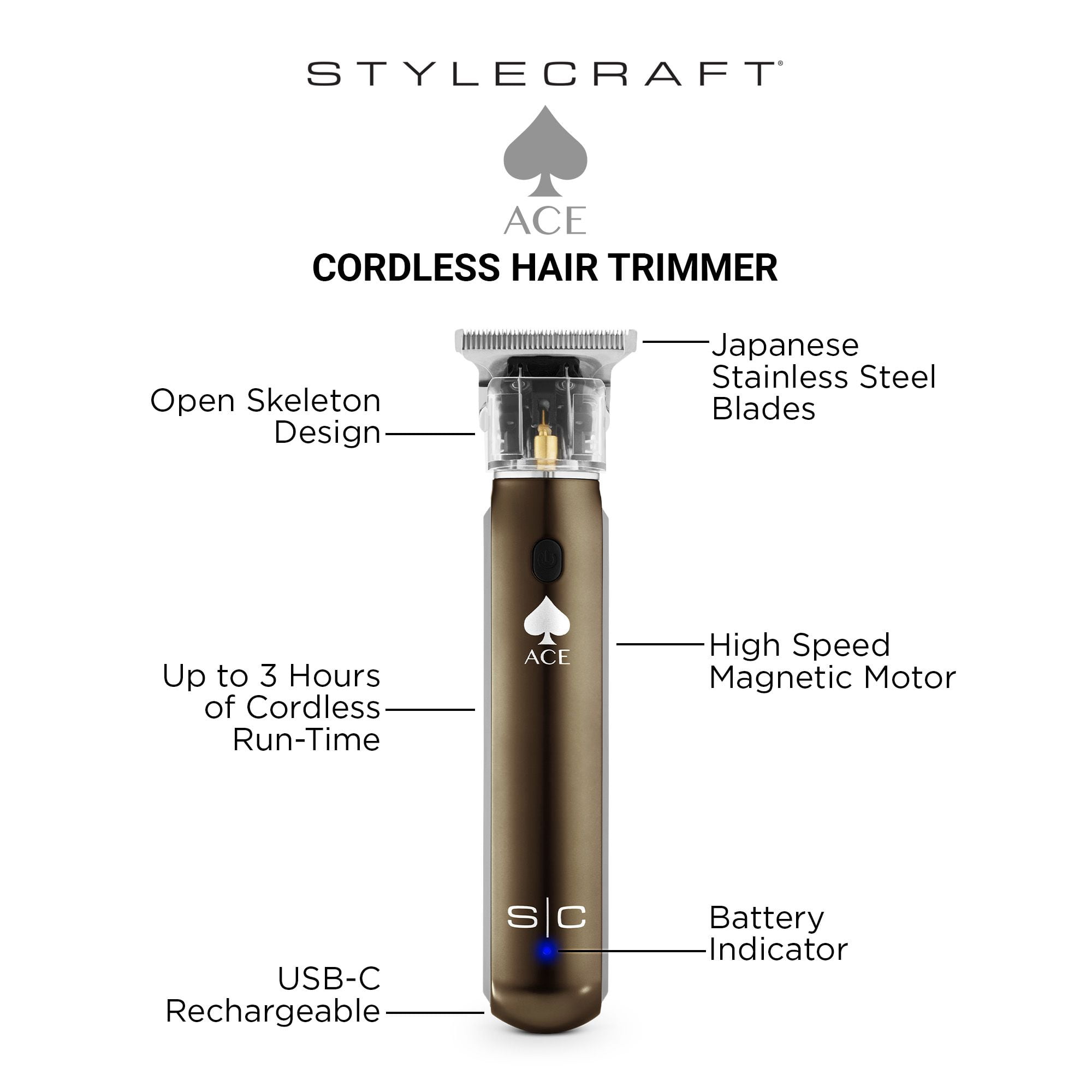 Powerful rotary motor runs at 7,500 RPMs for everyday use with less drag Japanese high-quality stainless-steel blade is fully adjustable zero gap for the closest cut and finish Lithium-ion battery delivers 3-hours of cordless run-time with a 90-minute recharge USB Type-C rechargeable for convenience and worldwide use Open skeleton design to expose the blade for cooler operation, better sight line, and enhanced precision 3 trimmer guards included for maximum performance Engineered and designed in the USA Includes: Trimmer, Stainless-Steel blades, 3 black guard attachments, USB Type-C charging cord